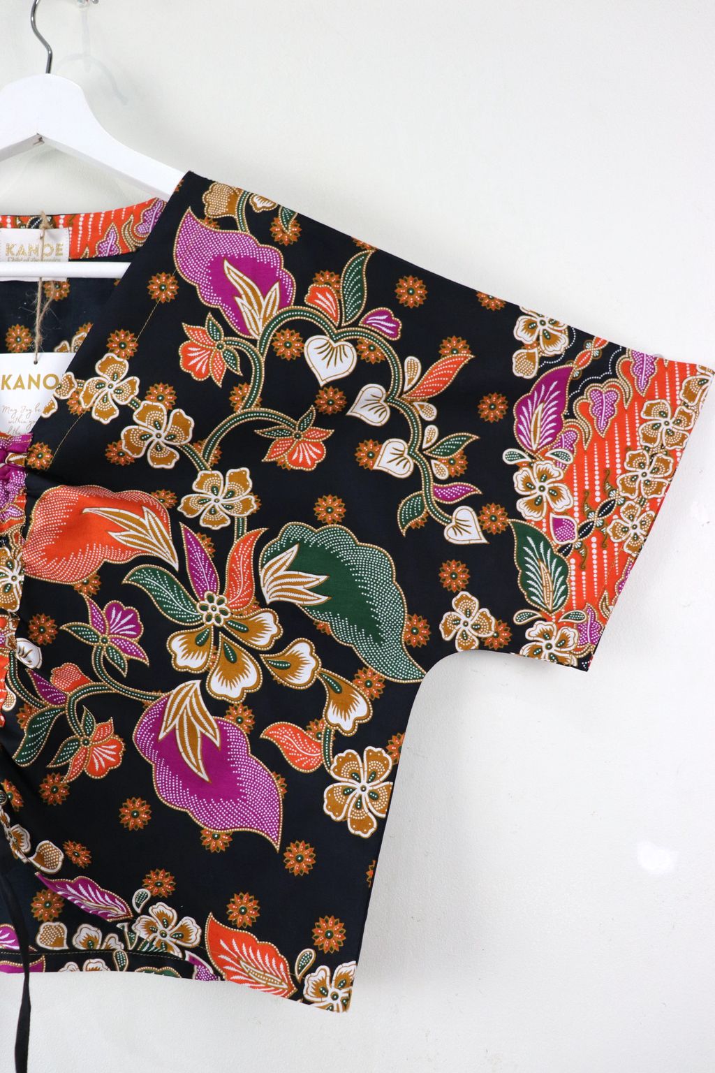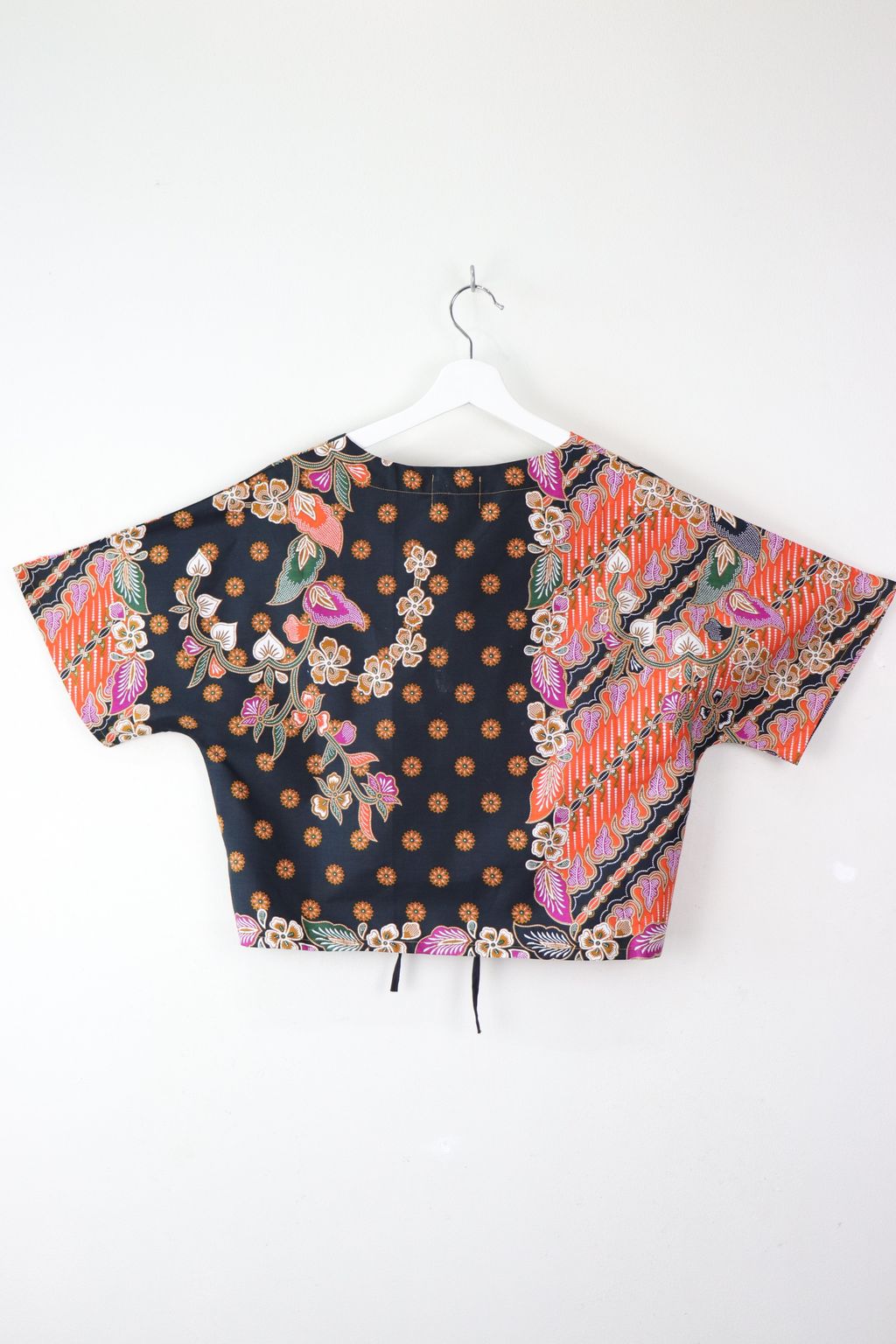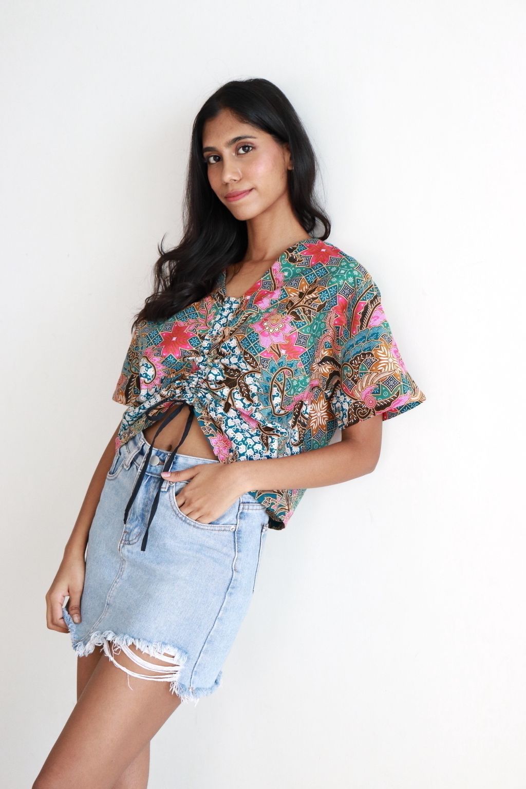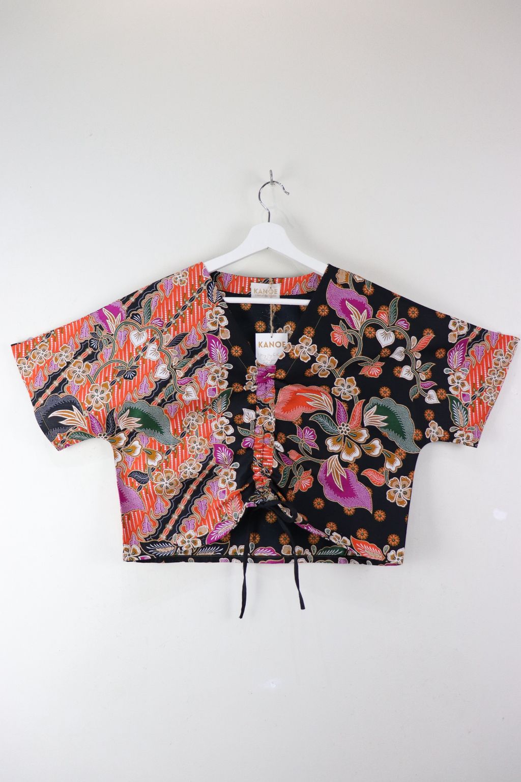 Front Ruched Drawstring Batik Top - Tangerine Savanna ( M - L )