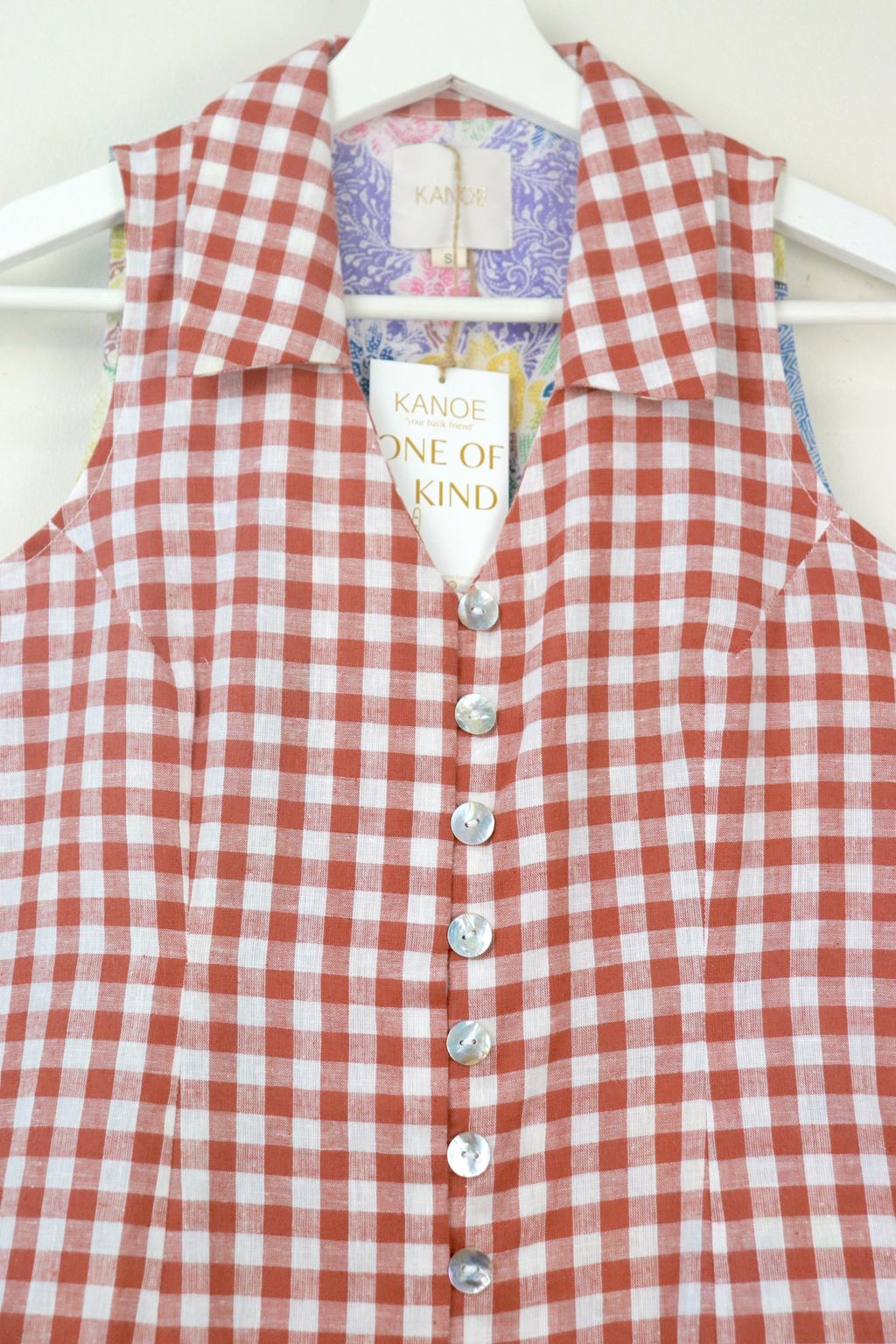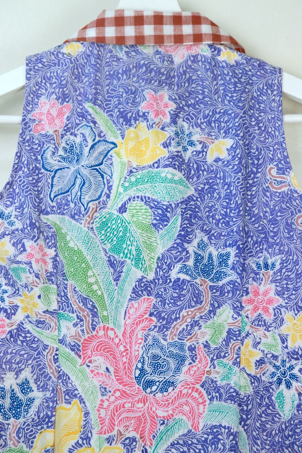 This collared vest-style top offers a perfect blend of classic charm and artisanal beauty. The front is in a playful soft cotton gingham fabric, adding a touch of vintage flair, while the back is adorned with hand-stamped batik made by local Malaysian Artisans. Each batik pattern is unique, reflecting centuries of tradition and craftsmanship.The top is finished with elegant mother of pearl buttons down the front, adding just the right amount of sparkle.