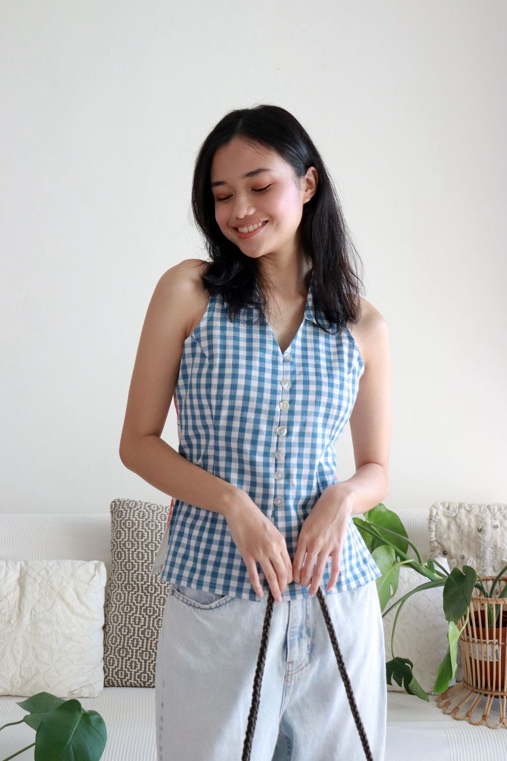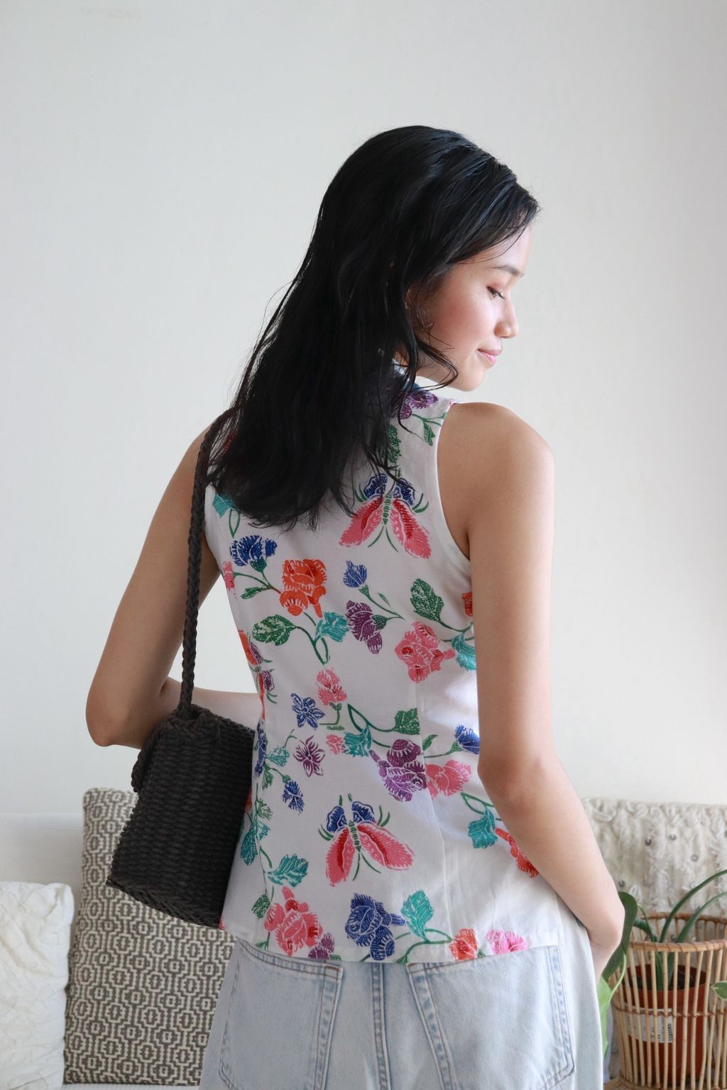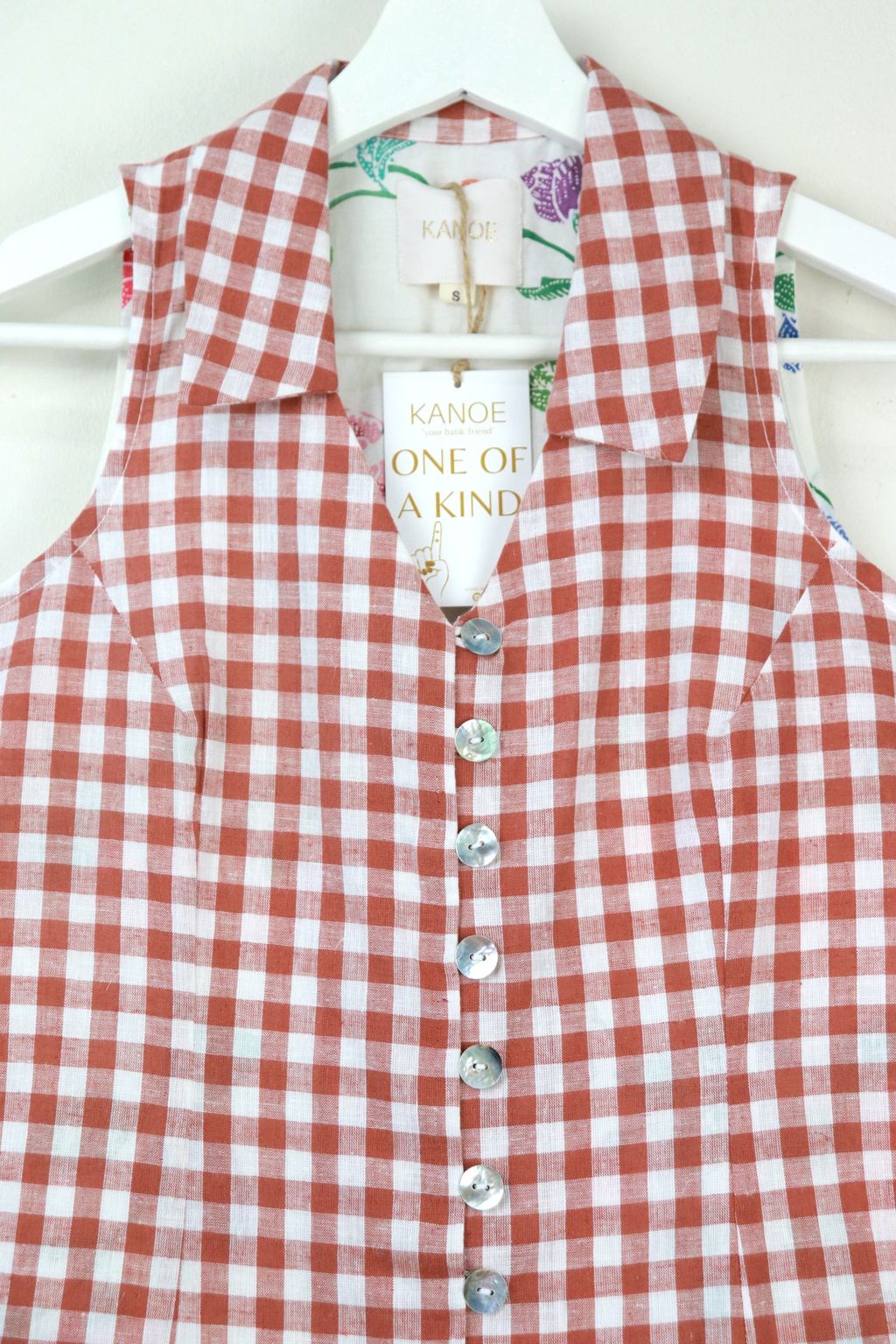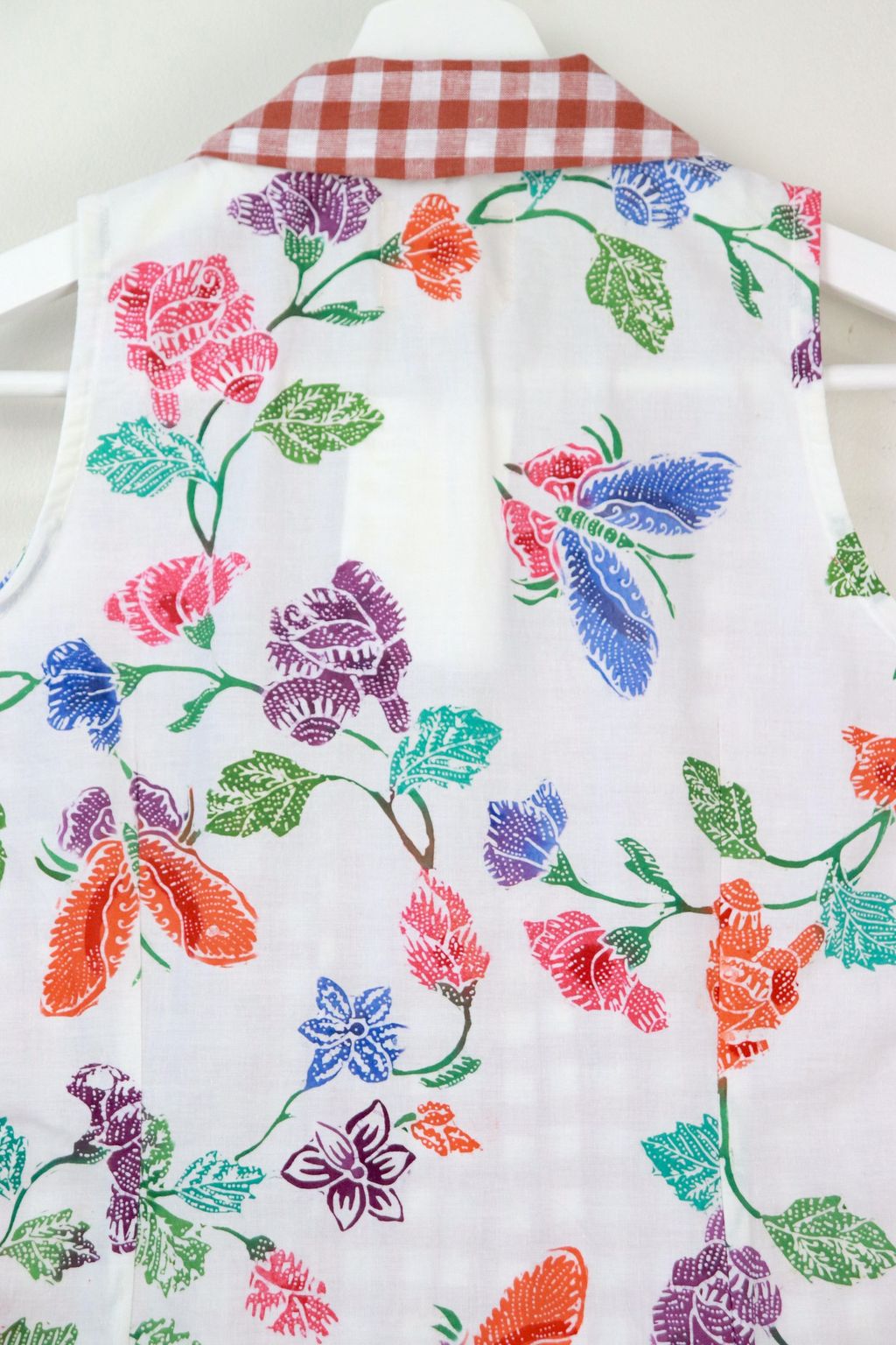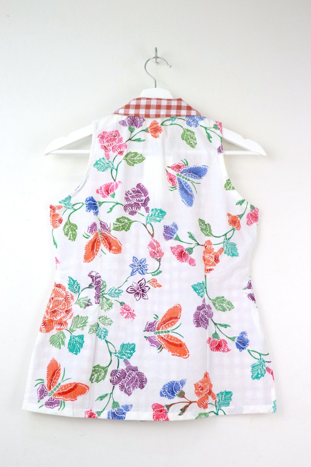 This collared vest-style top offers a perfect blend of classic charm and artisanal beauty. The front is in a playful soft cotton gingham fabric, adding a touch of vintage flair, while the back is adorned with hand-stamped batik made by local Malaysian Artisans. Each batik pattern is unique, reflecting centuries of tradition and craftsmanship.The top is finished with elegant mother of pearl buttons down the front, adding just the right amount of sparkle.