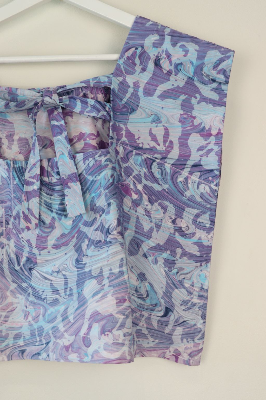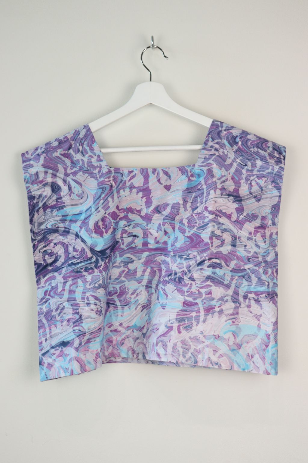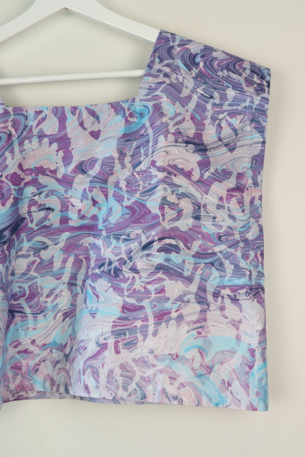 Dreamy Milky Rainbow Swirls of Pastel Shades of these Boxy GroceryDate Batik Top. Textile handmade by local Artisans on 100% cotton. A mix of hand marbling dye technique combined with inverse copper wax stamp batik terap motifs resulting in a wonderful display of our local artisans creativity.