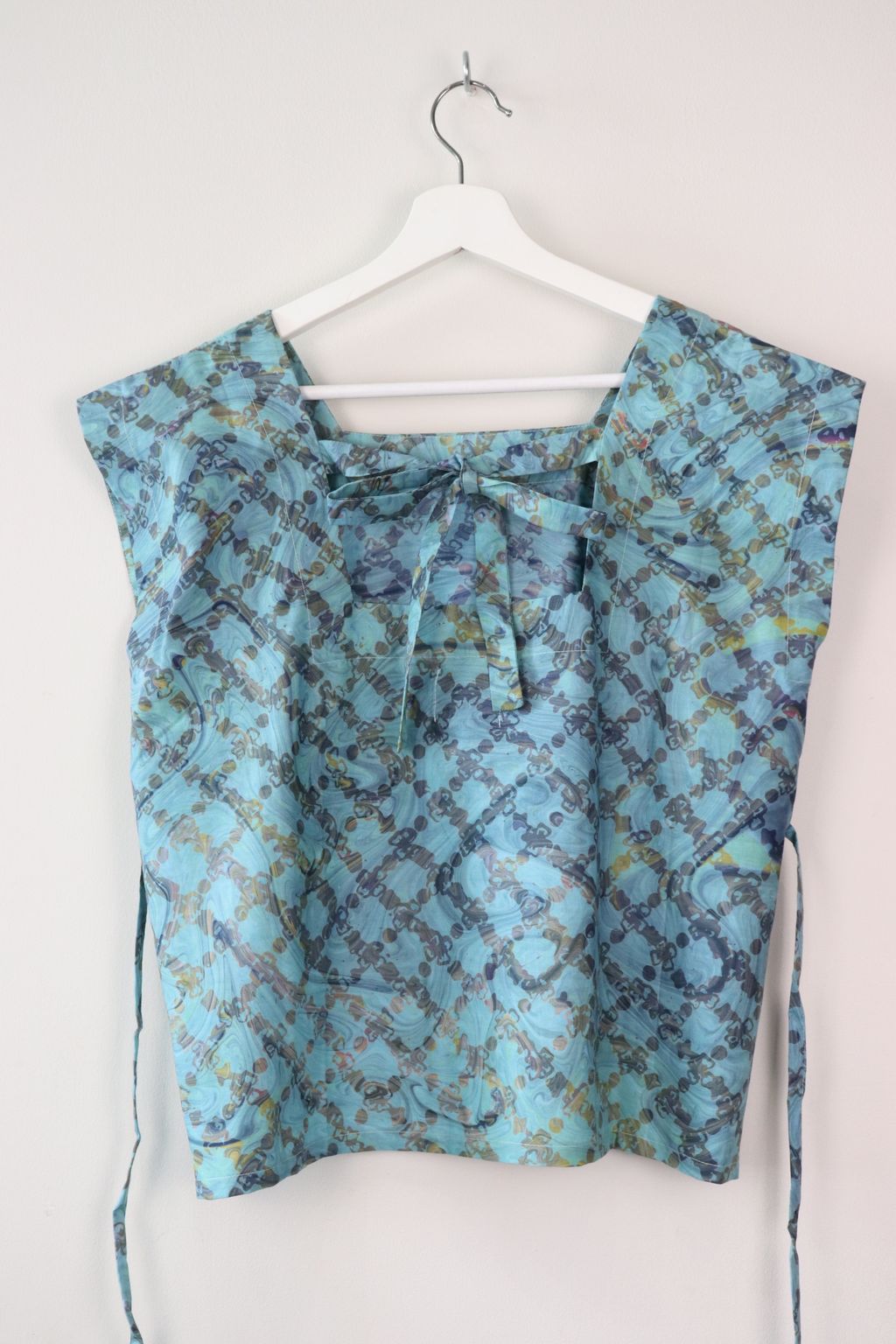 Finished with a lower box back with a ribbon tie, seam is above bra strap so don't worry, it won't show ;) A waist tie to niche in at the waist giving a nice hourglass figure. Fold both sides of the top either to the front or back. Then tie the waist tie <3