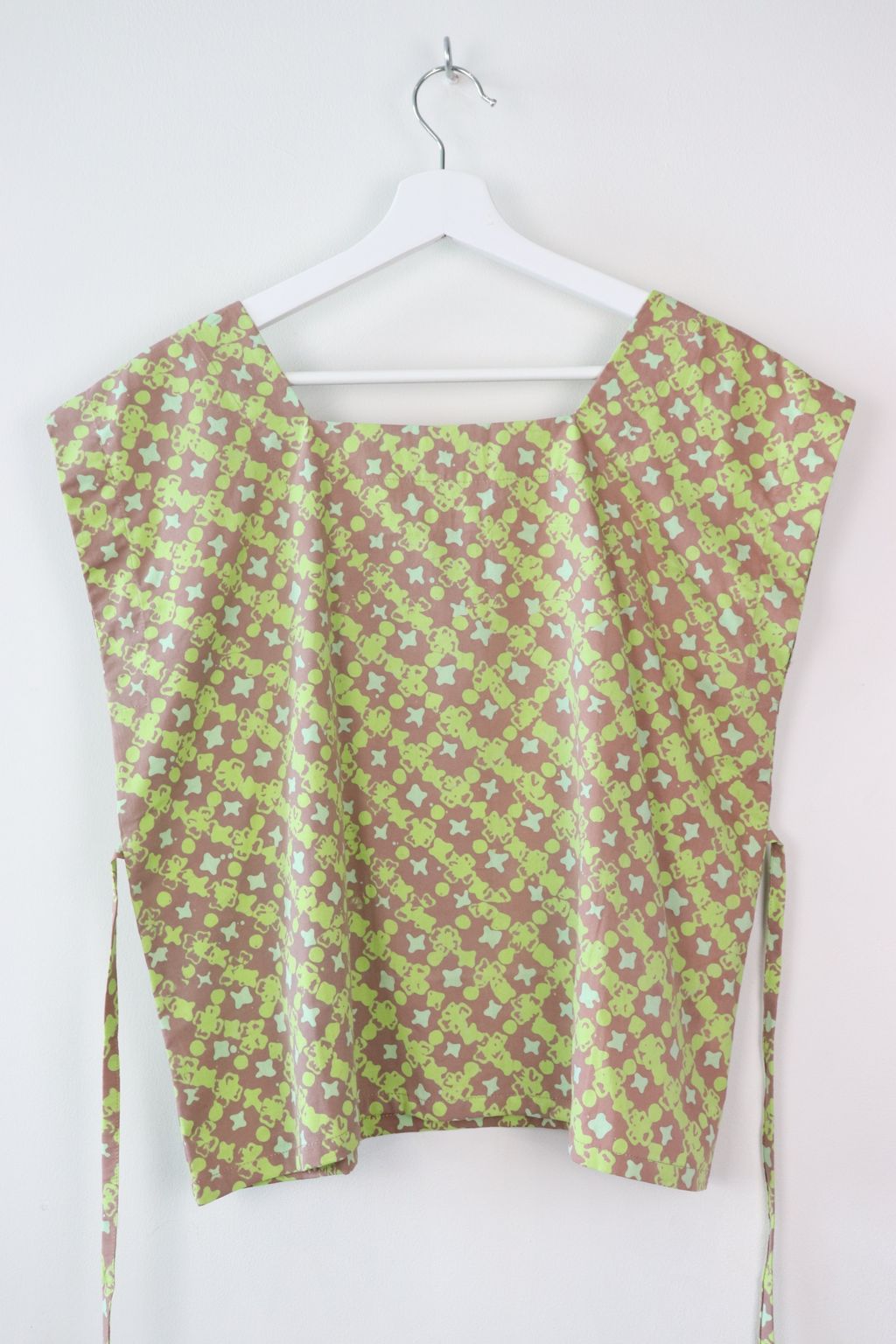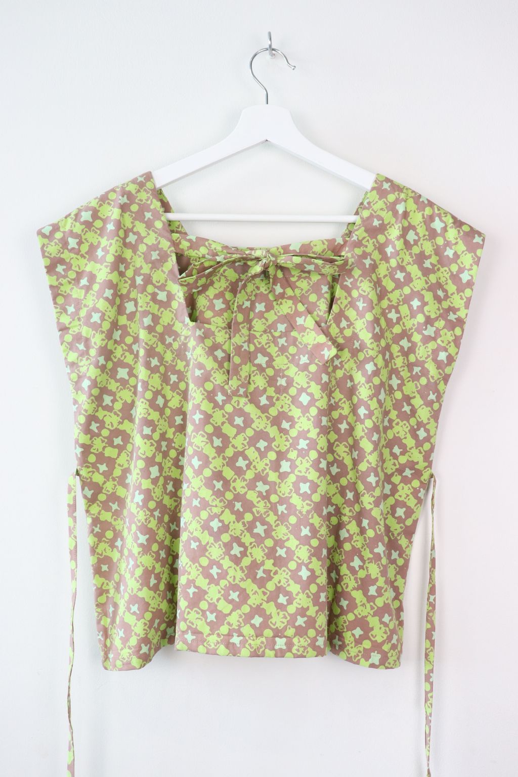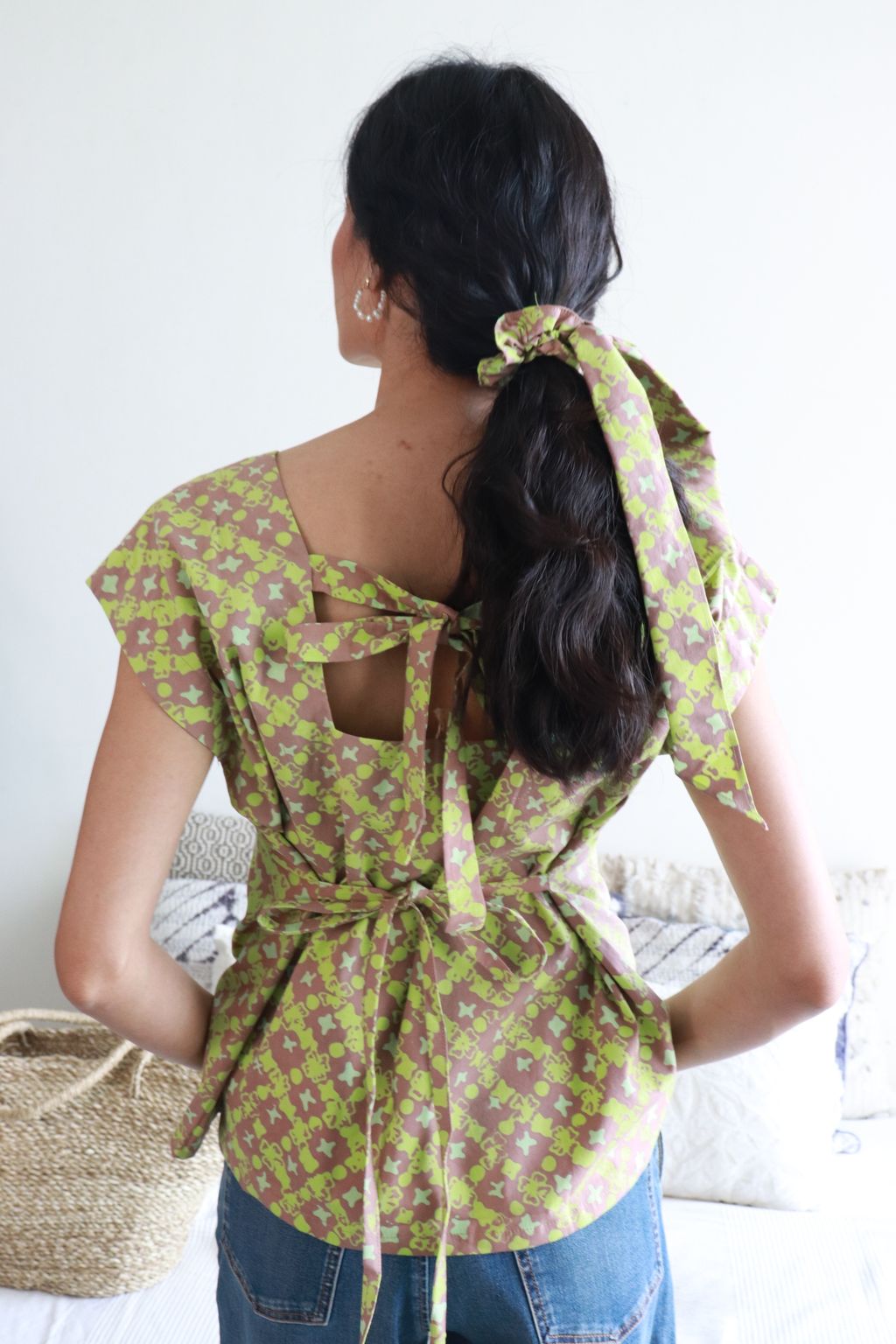Finished with a lower box back with a ribbon tie, seam is above bra strap so don't worry, it won't show ;) A waist tie to niche in at the waist giving a nice hourglass figure. Fold both sides of the top either to the front or back. Then tie the waist tie <3