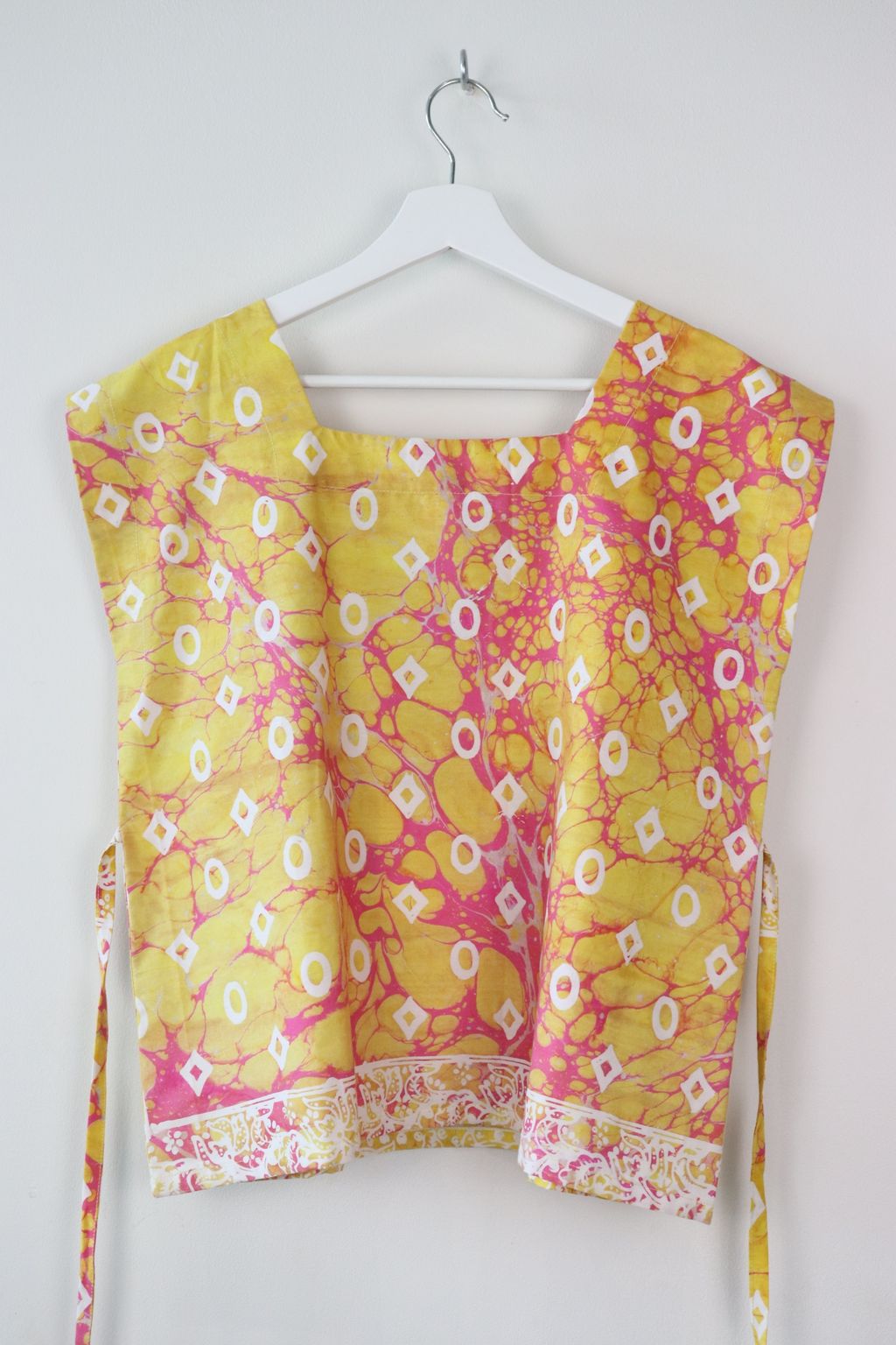 Finished with a lower box back with a ribbon tie, seam is above bra strap so don't worry, it won't show ;) A waist tie to niche in at the waist giving a nice hourglass figure. Fold both sides of the top either to the front or back. Then tie the waist tie <3