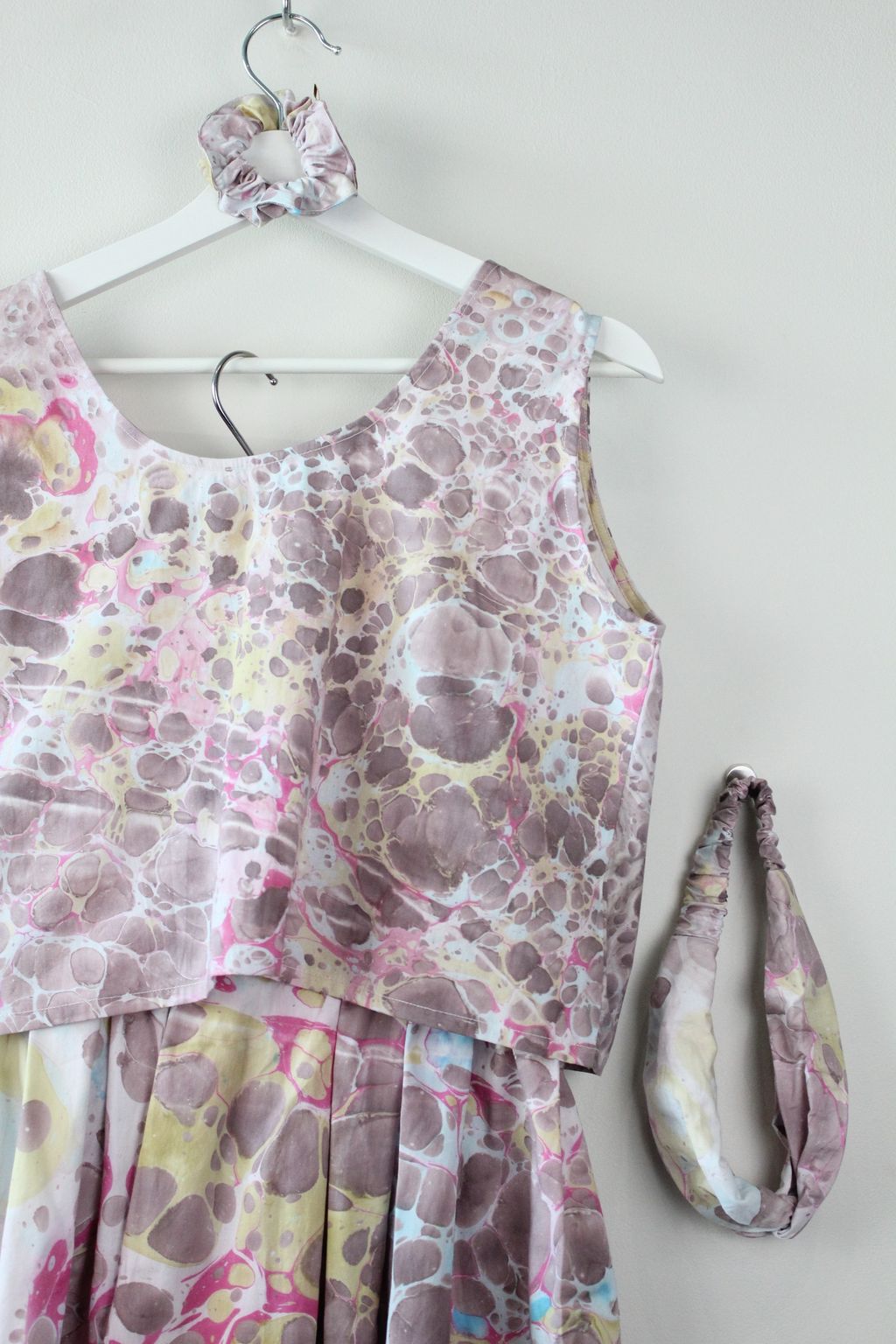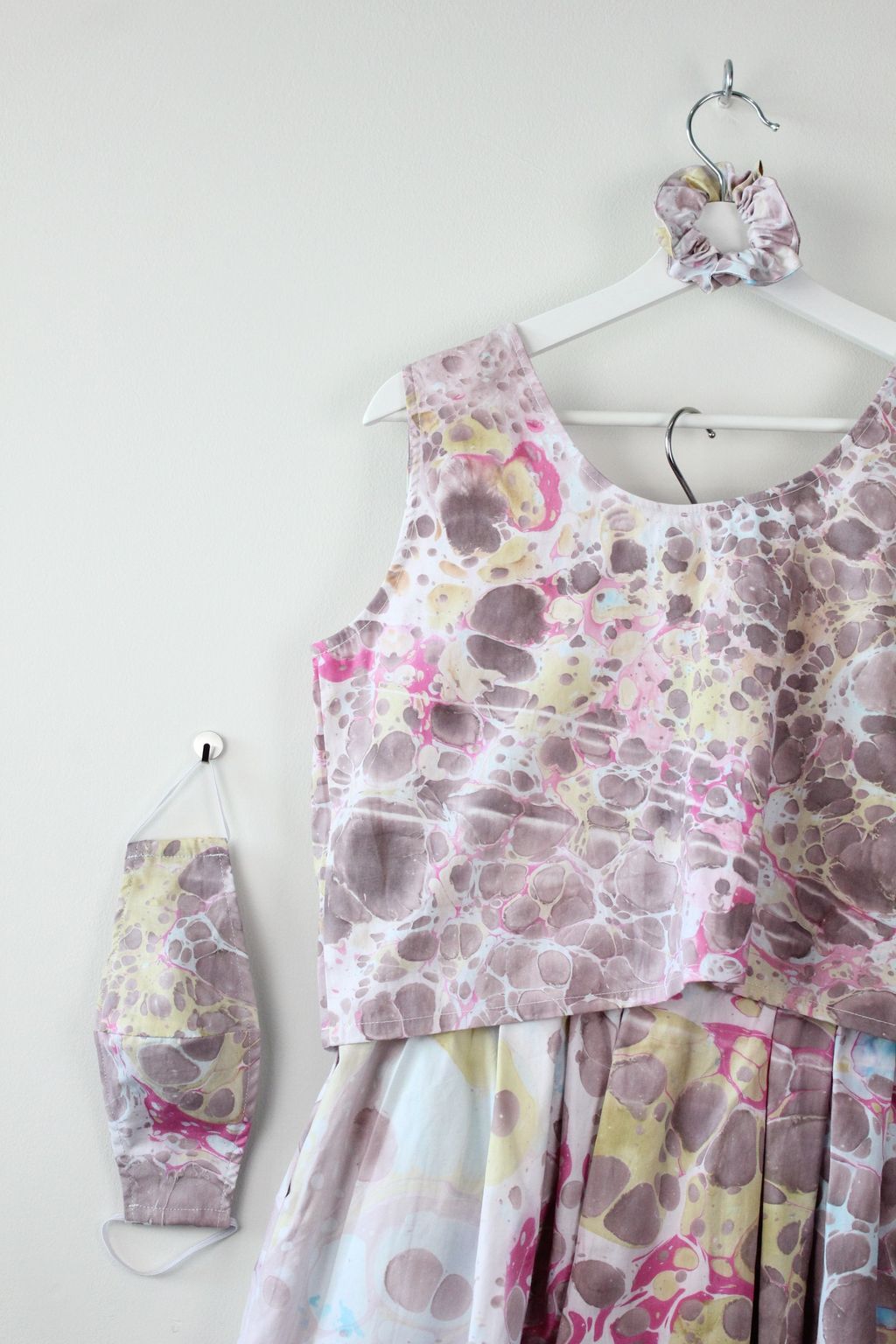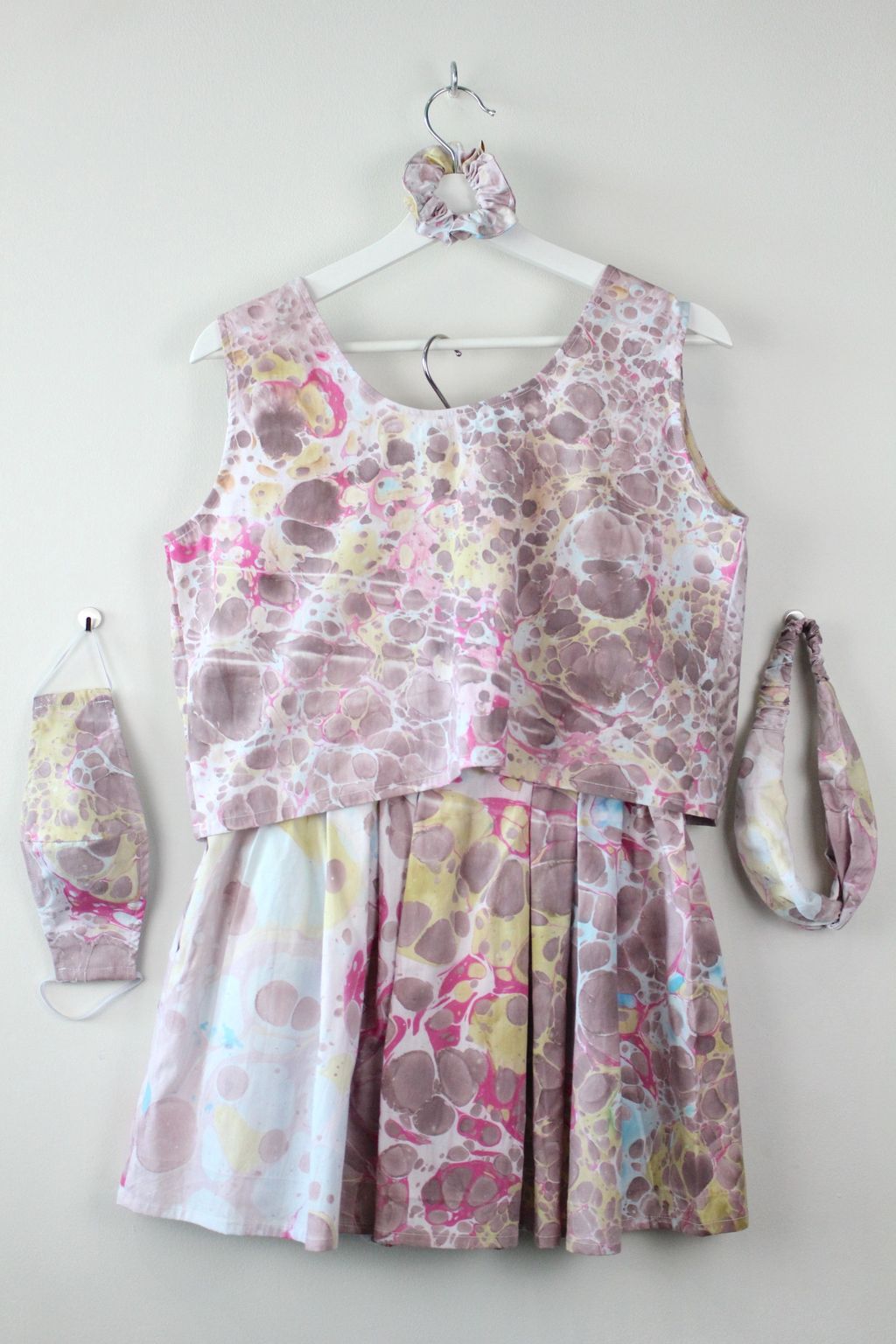 This set includes - a classic top, flare skirt , twisted headband, scrunchie, and face mask ! [ RRP : RM250 ]