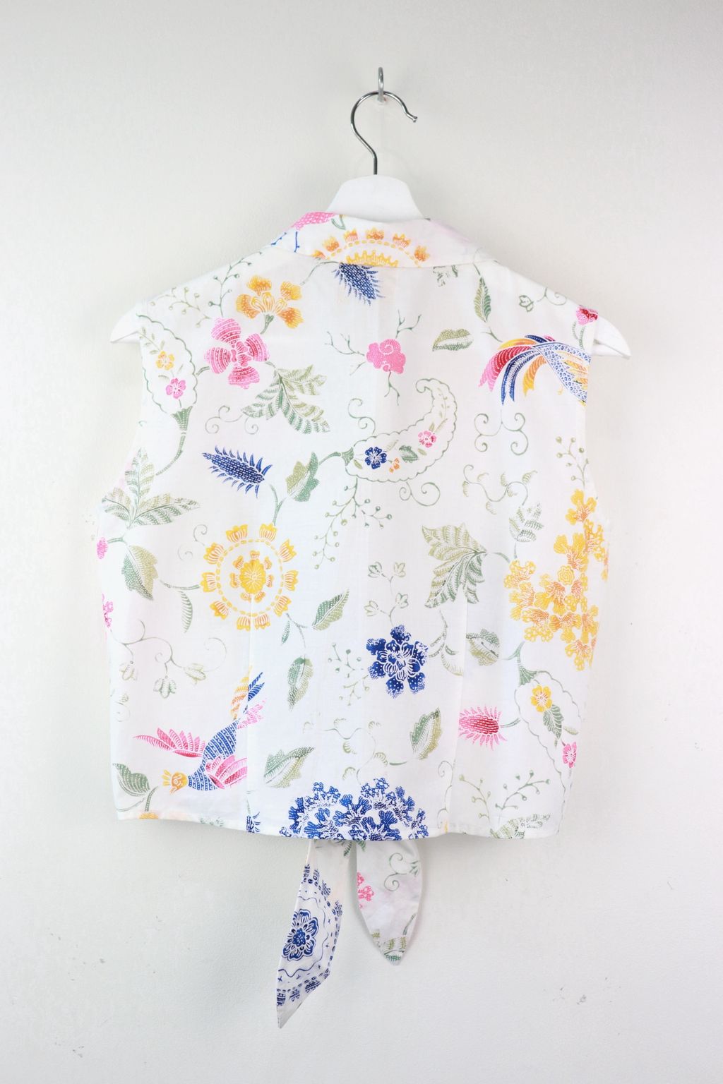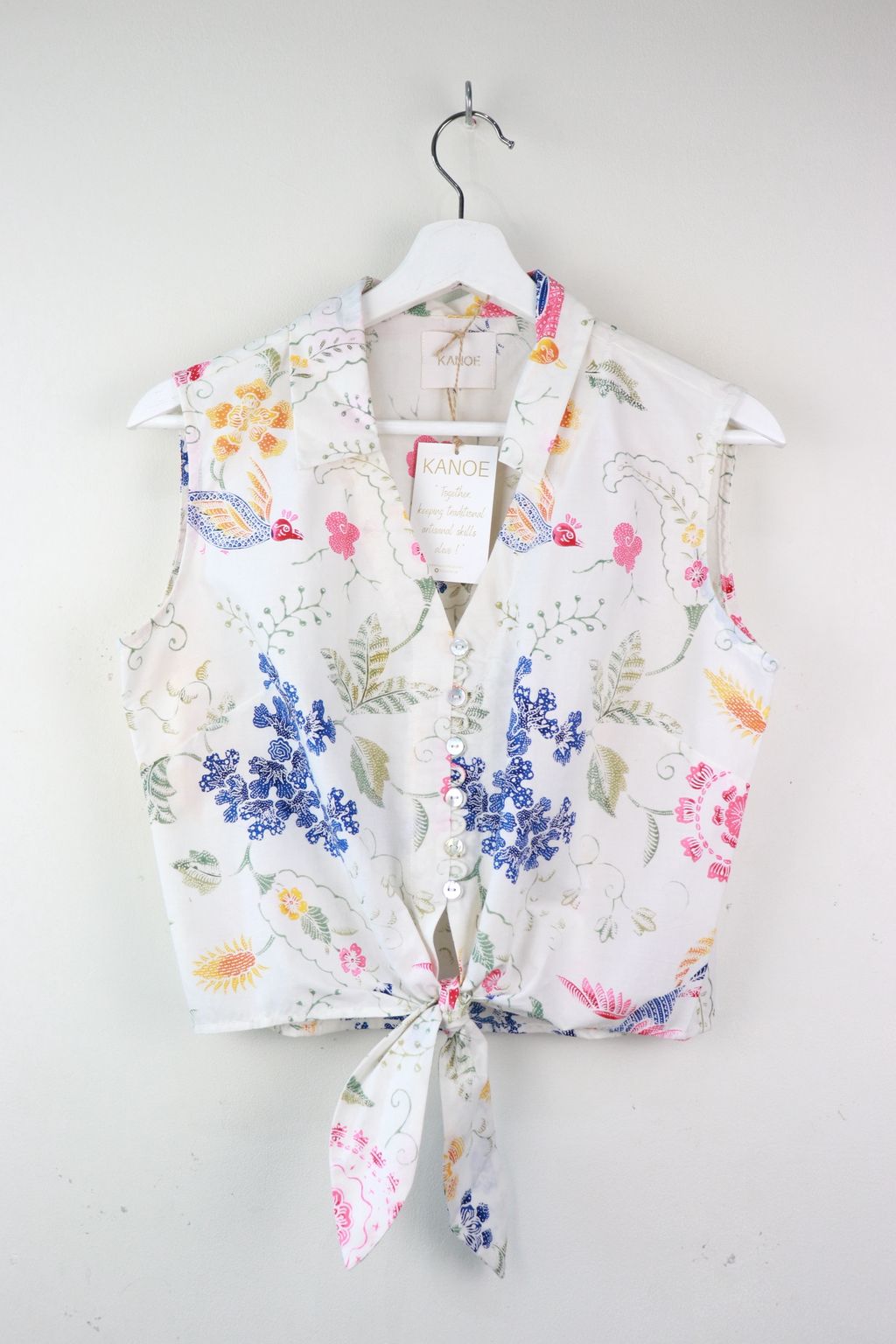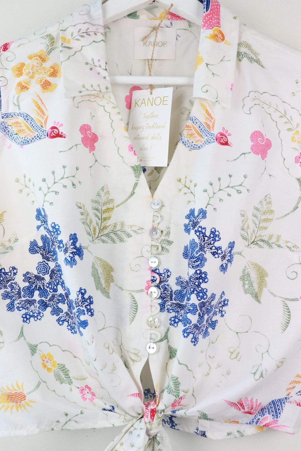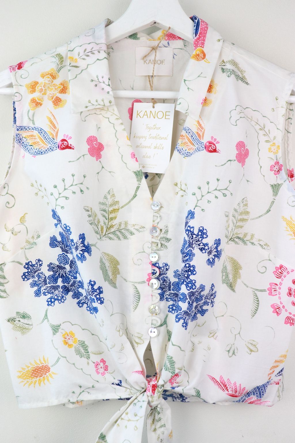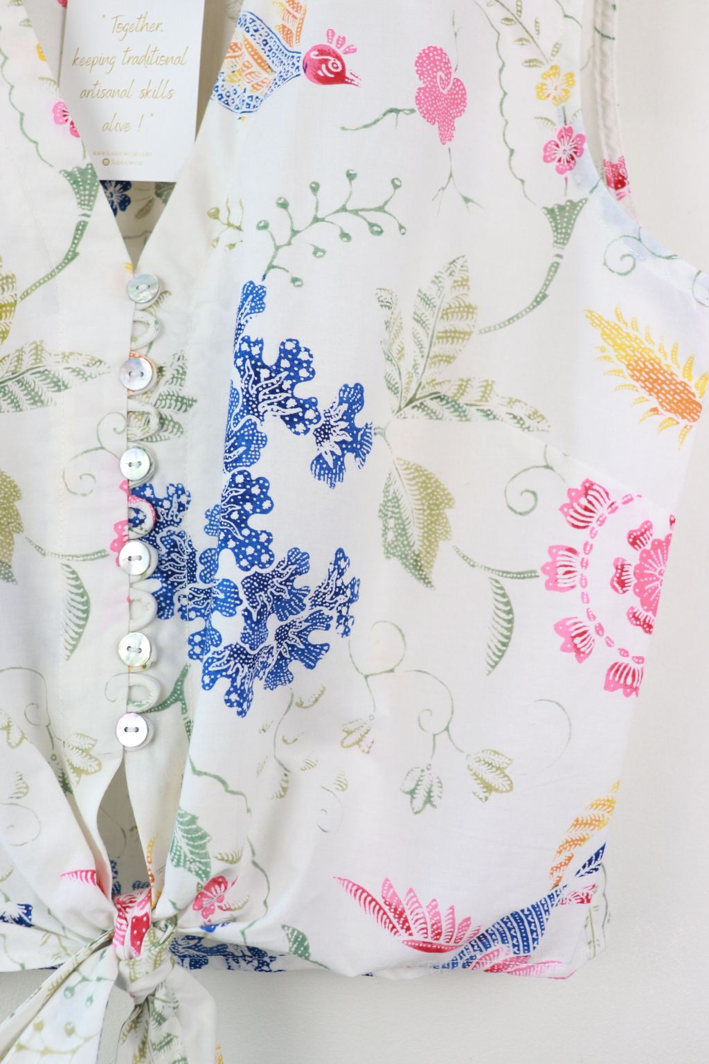 These pastel sleeveless front tie top are made from intricate hand stamped batik textile. Not one piece alike, you will love how beautiful the colours and print of this batik is made by skilled artisans of centuries of batik making wisdom. These batik come from a region where the batik makers have influence from Chinese and European merchants in which is on display in the motifs and colours of the batik.