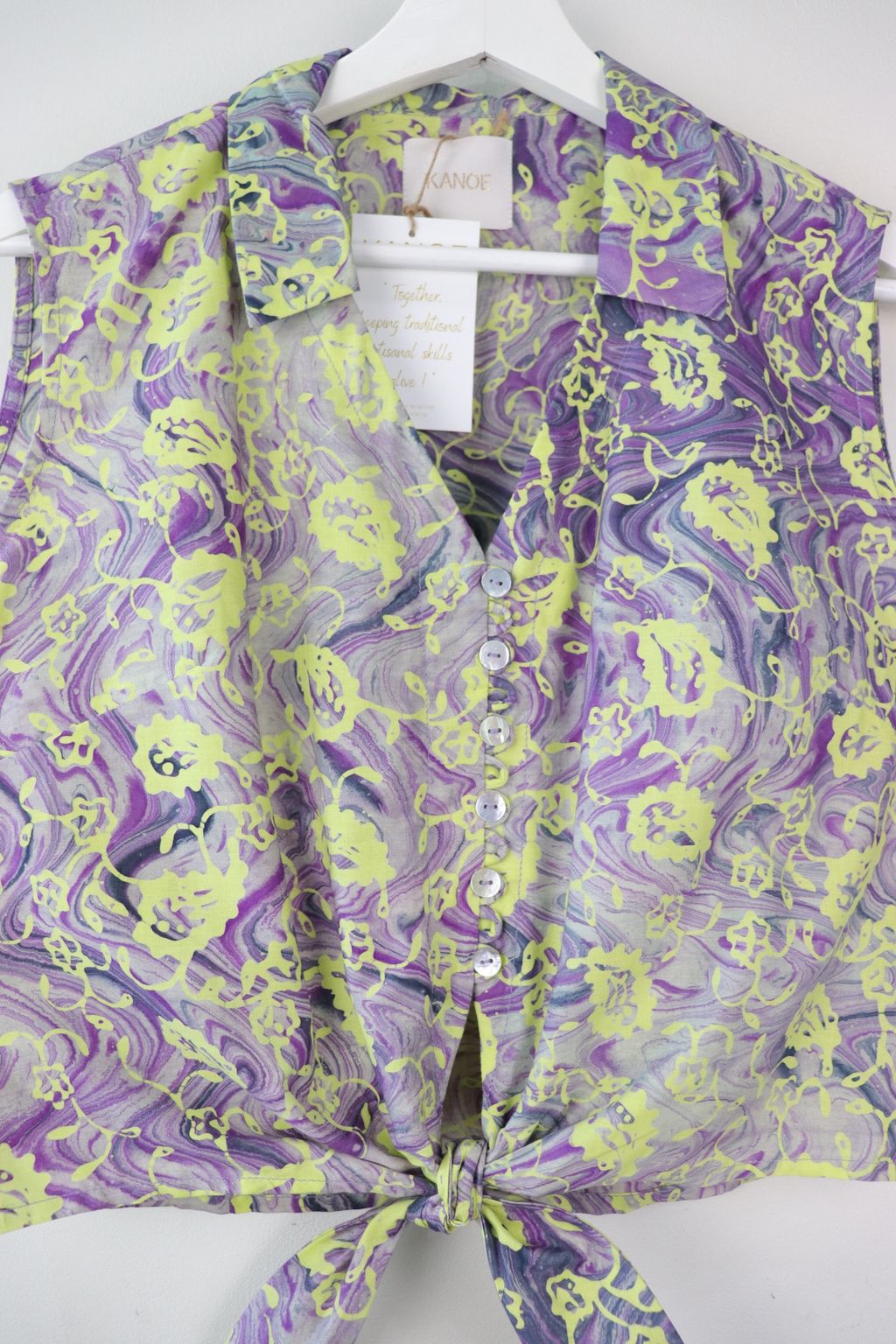 These pastel sleeveless front tie top are made from intricate hand stamped batik textile. Not one piece alike, you will love these beautiful pastel batiks made by skilled local artisans of talent. These batik textiles are made in Malaysia by artisans who push their creative boundaries to create timeless textiles in this modern age with traditional wisdom of age past.