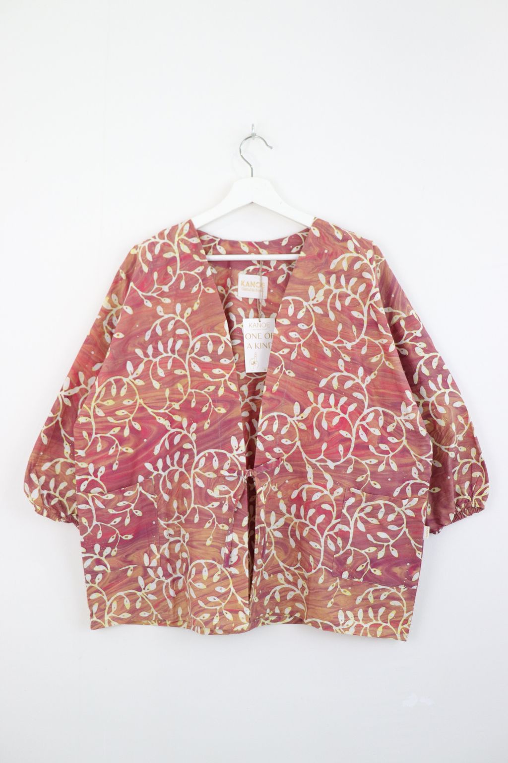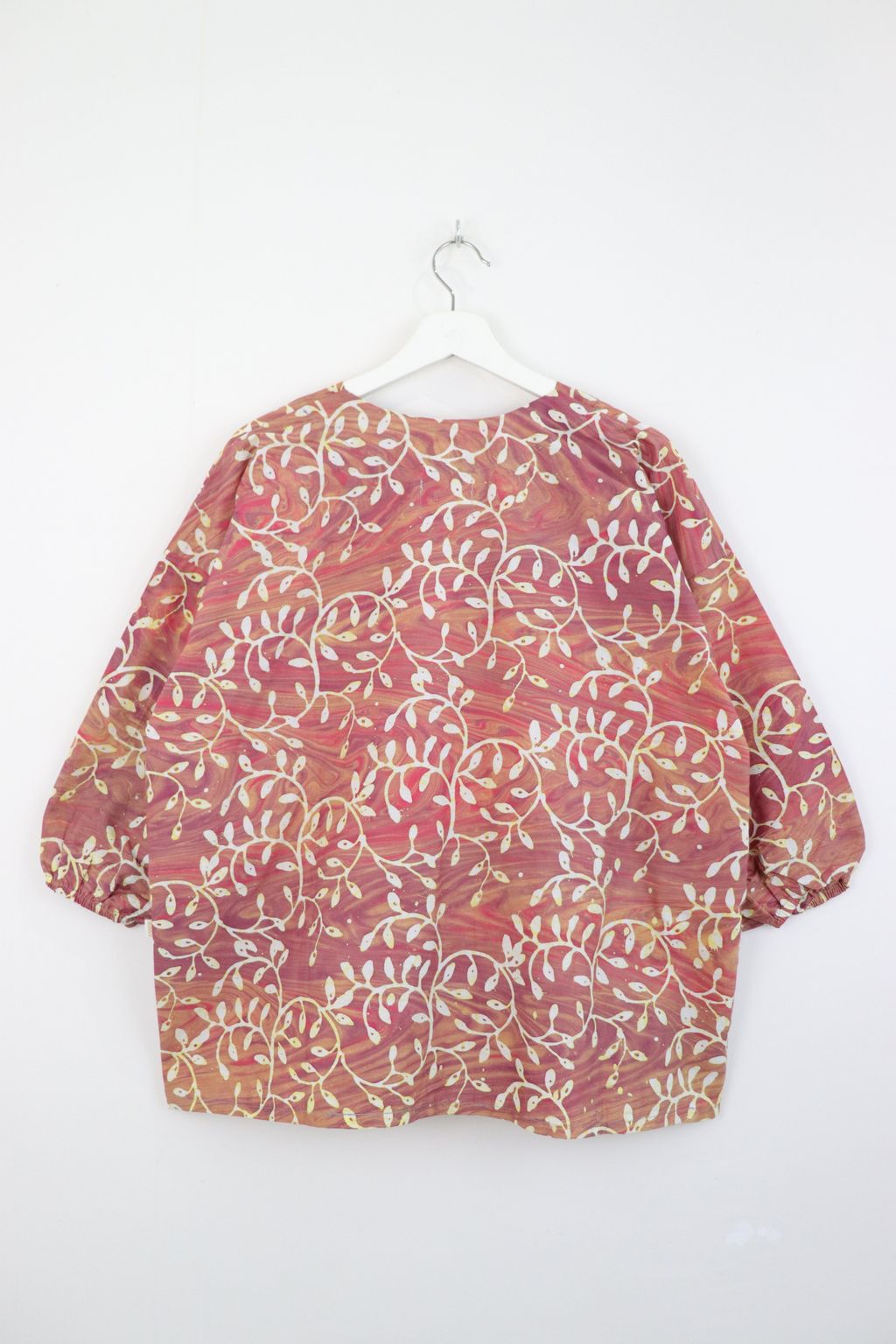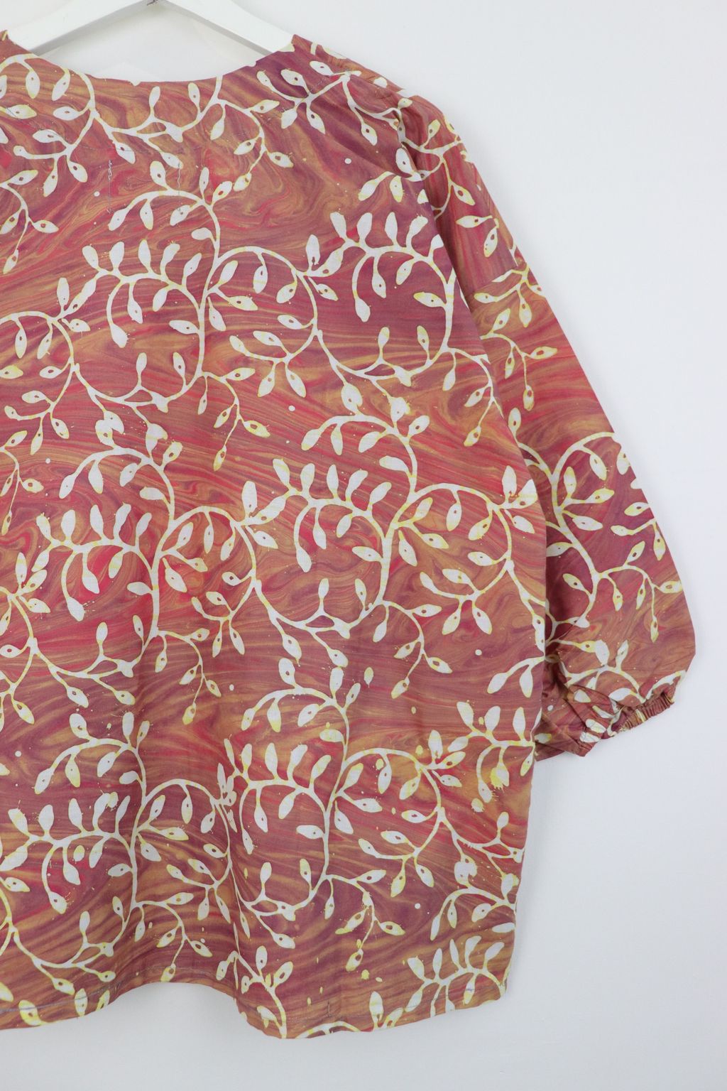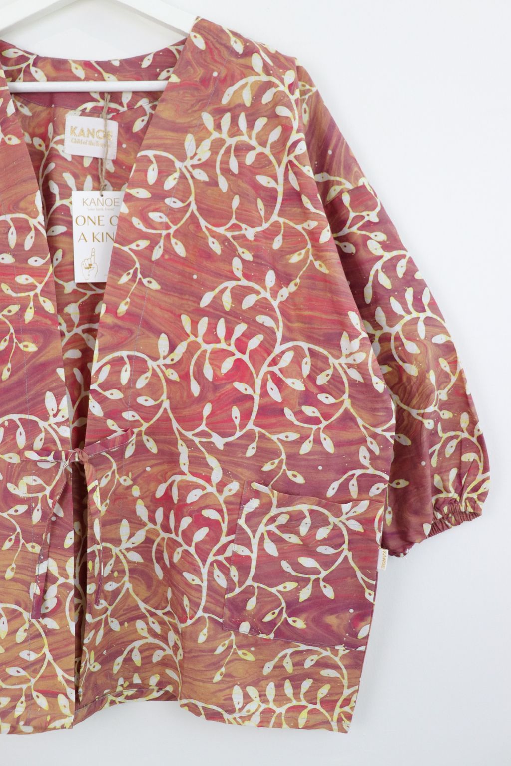 They have pockets in the front, as well a curved sleeve with elastic at the end of the sleeve which gives from for comfort of ease of movement as well a handy place for you to keep items when your hands are full! These pieces are also made with handstamped batik done locally by Malaysian Artisans!
