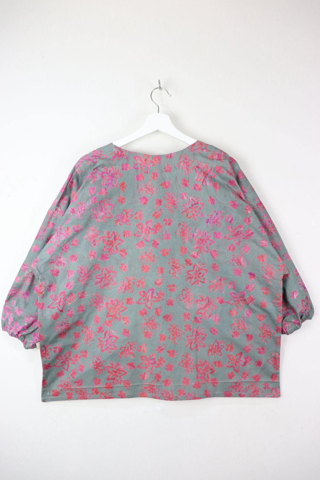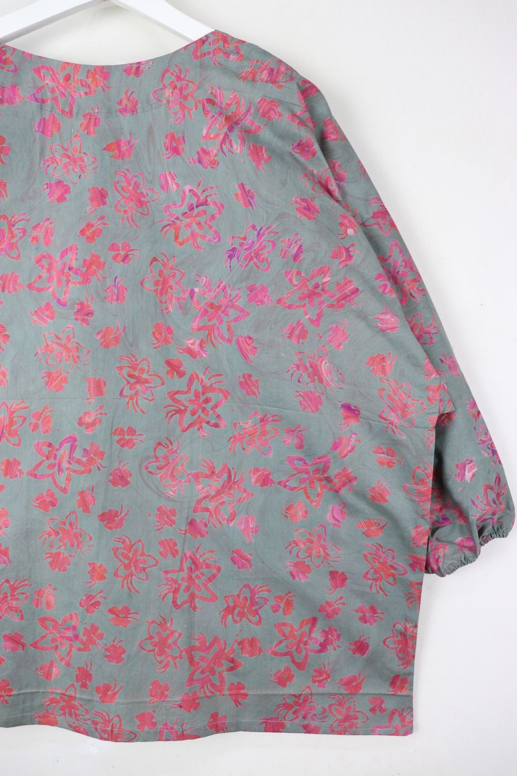 They have pockets in the front, as well a curved sleeve with elastic at the end of the sleeve which gives from for comfort of ease of movement as well a handy place for you to keep items when your hands are full! These pieces are also made with handstamped batik done locally by Malaysian Artisans!