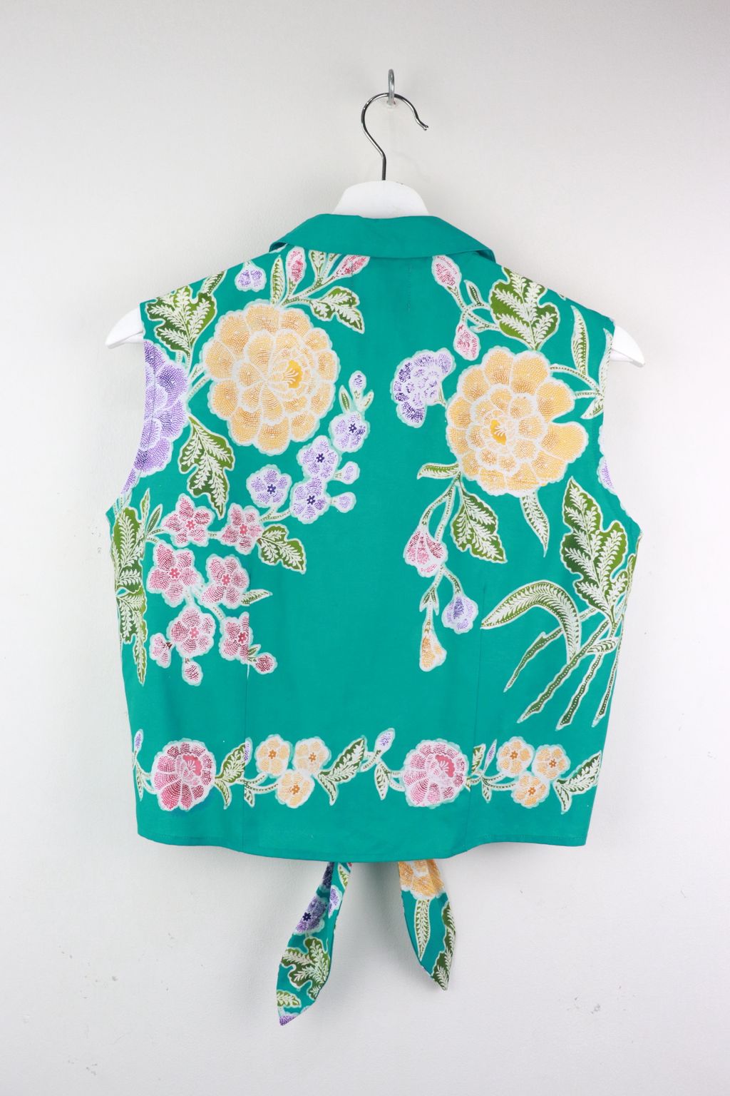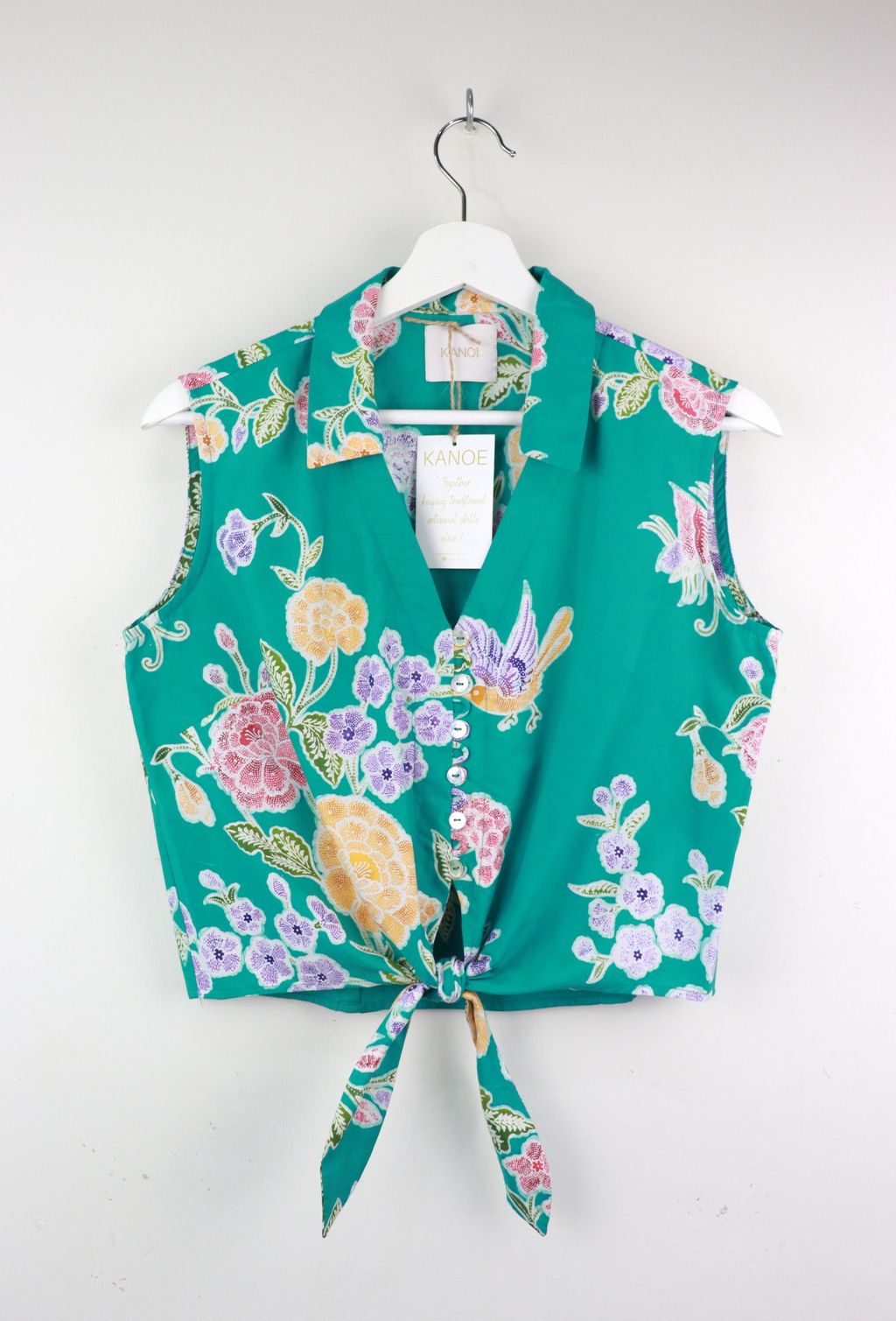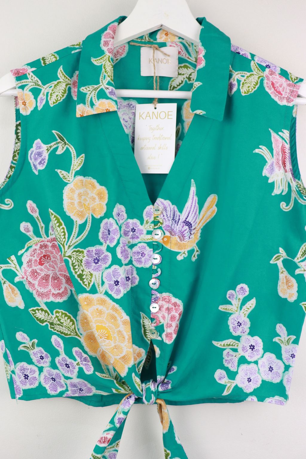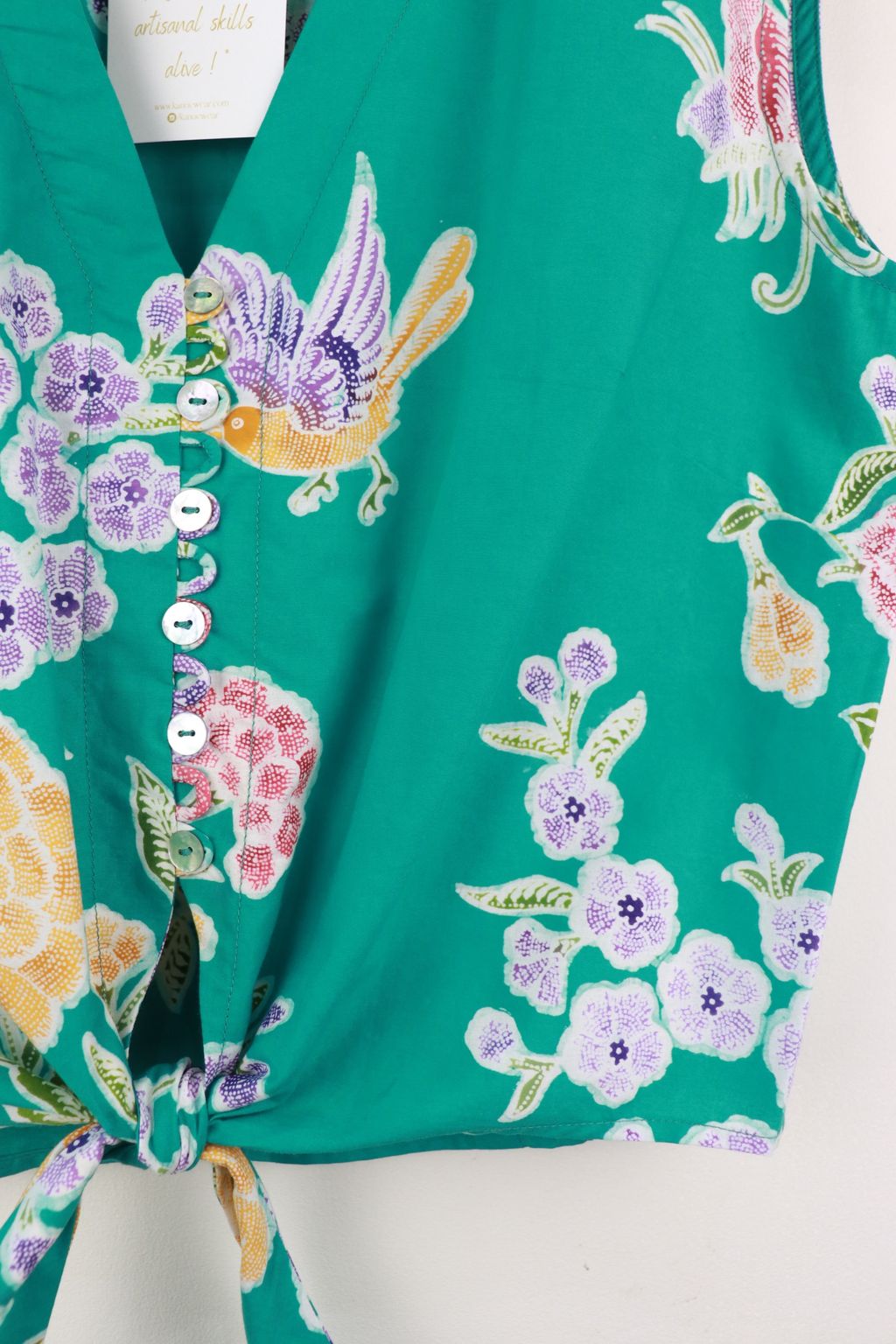 These pastel sleeveless front tie top are made from intricate hand stamped batik textile. Not one piece alike, you will love how beautiful the colours and print of this batik is made by skilled artisans of centuries of batik making wisdom. These batik come from a region where the batik makers have influence from Chinese and European merchants in which is on display in the motifs and colours of the batik.