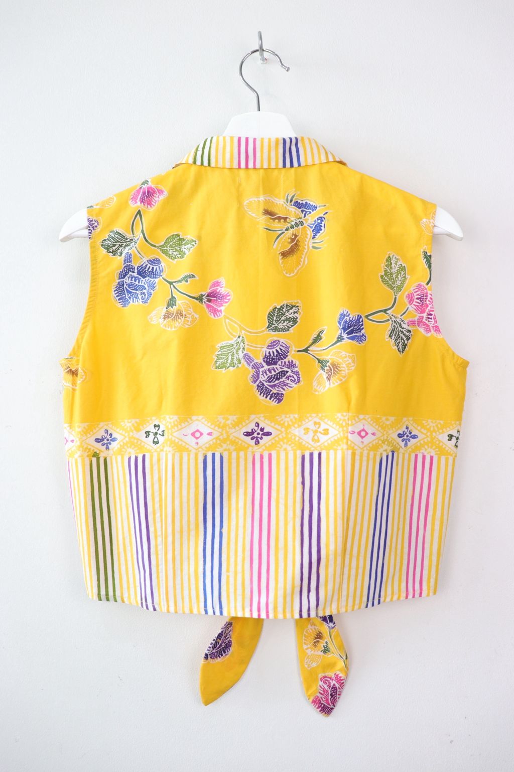 These pastel sleeveless front tie top are made from intricate hand stamped batik textile. Not one piece alike, you will love how beautiful the colours and print of this batik is made by skilled artisans of centuries of batik making wisdom. These batik come from a region where the batik makers have influence from Chinese and European merchants in which is on display in the motifs and colours of the batik.