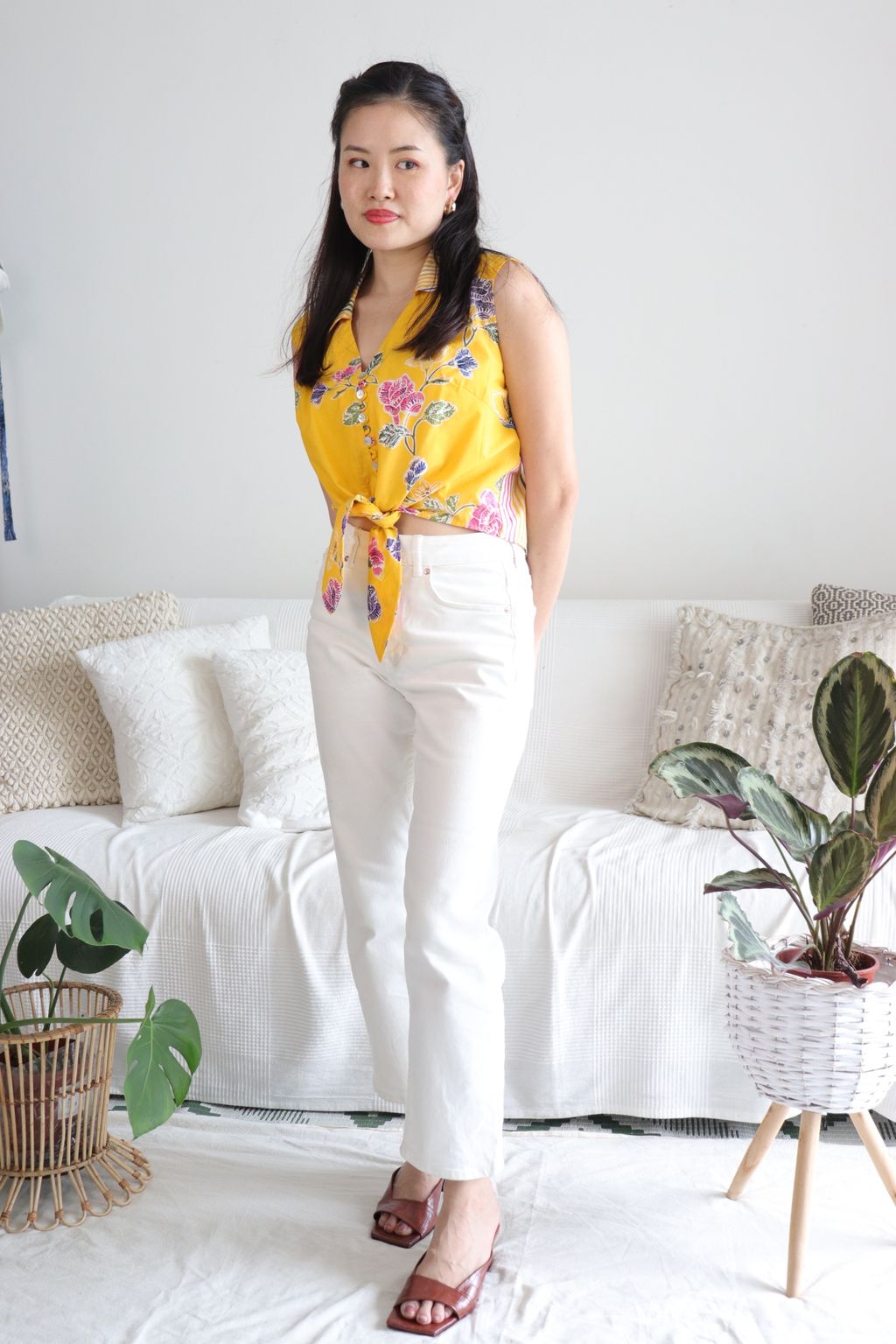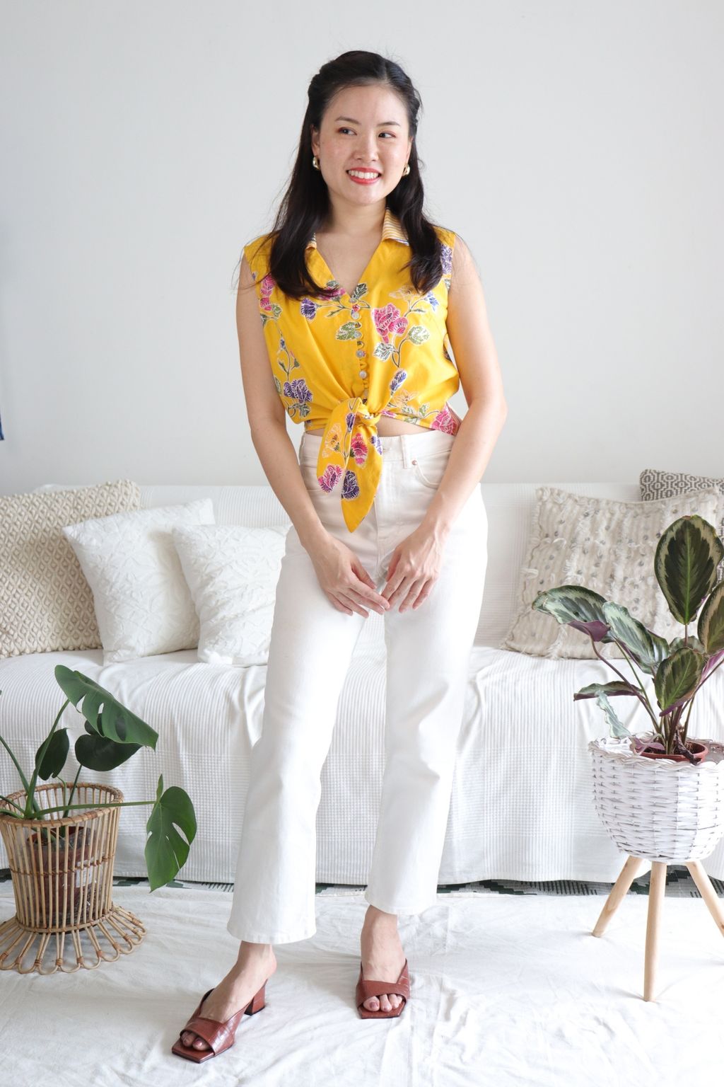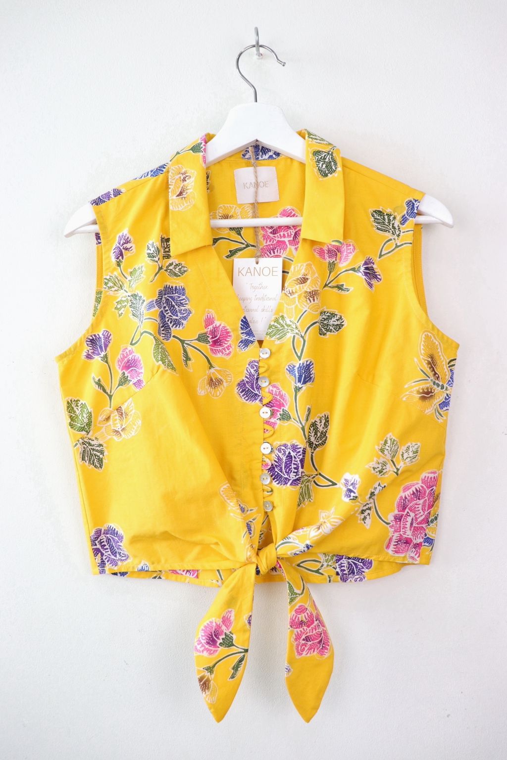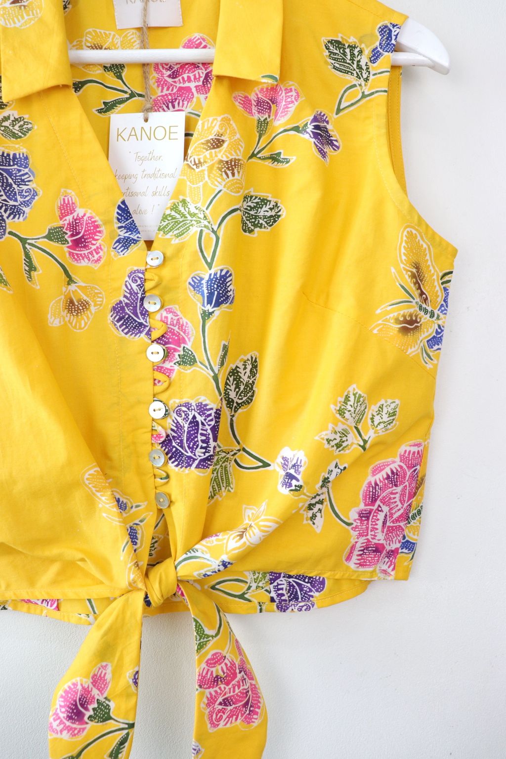 These pastel sleeveless front tie top are made from intricate hand stamped batik textile. Not one piece alike, you will love how beautiful the colours and print of this batik is made by skilled artisans of centuries of batik making wisdom. These batik come from a region where the batik makers have influence from Chinese and European merchants in which is on display in the motifs and colours of the batik.