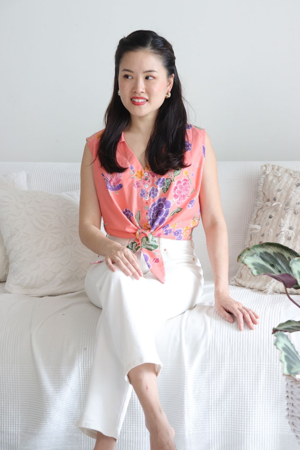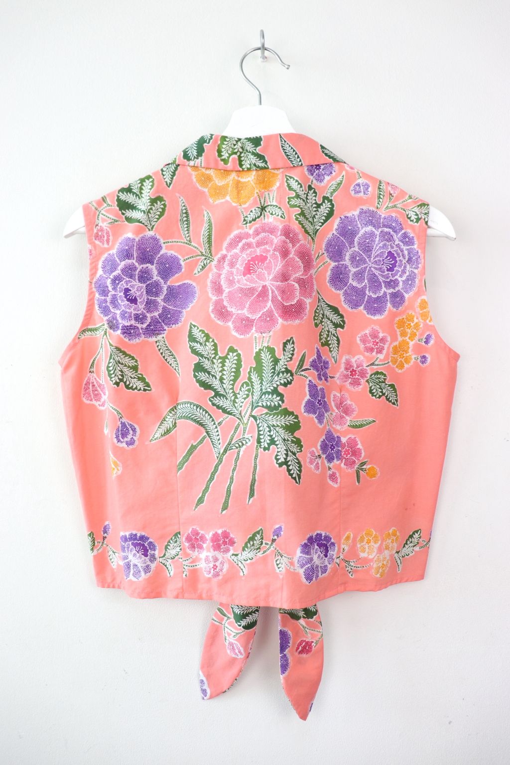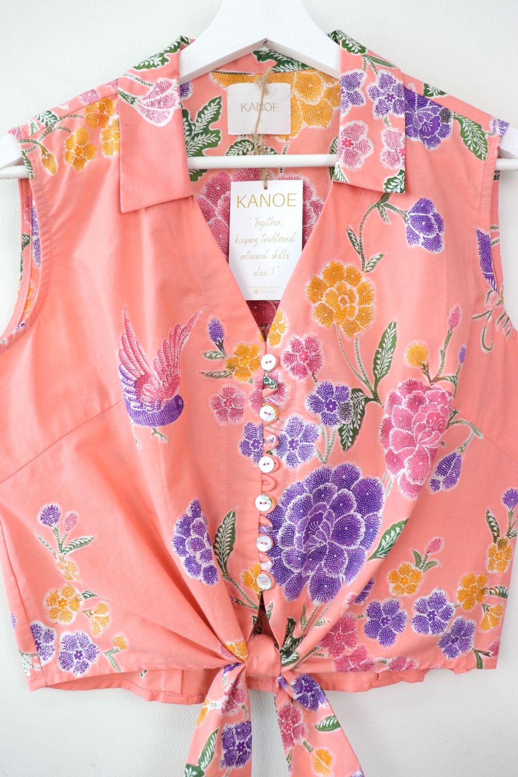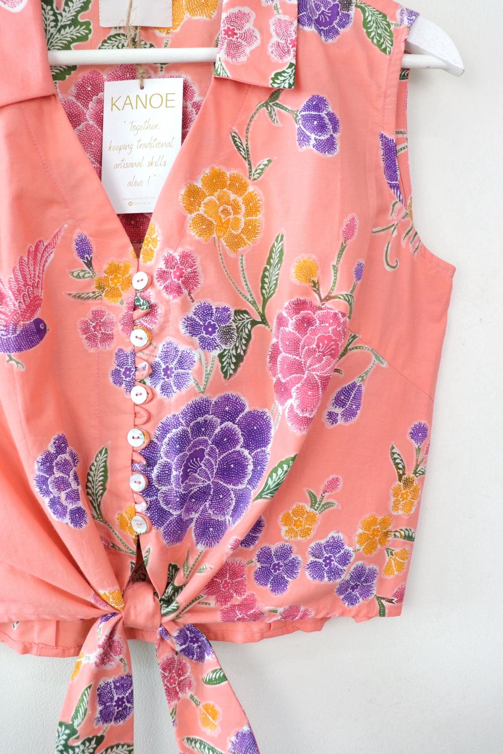 These pastel sleeveless front tie top are made from intricate hand stamped batik textile. Not one piece alike, you will love how beautiful the colours and print of this batik is made by skilled artisans of centuries of batik making wisdom. These batik come from a region where the batik makers have influence from Chinese and European merchants in which is on display in the motifs and colours of the batik.