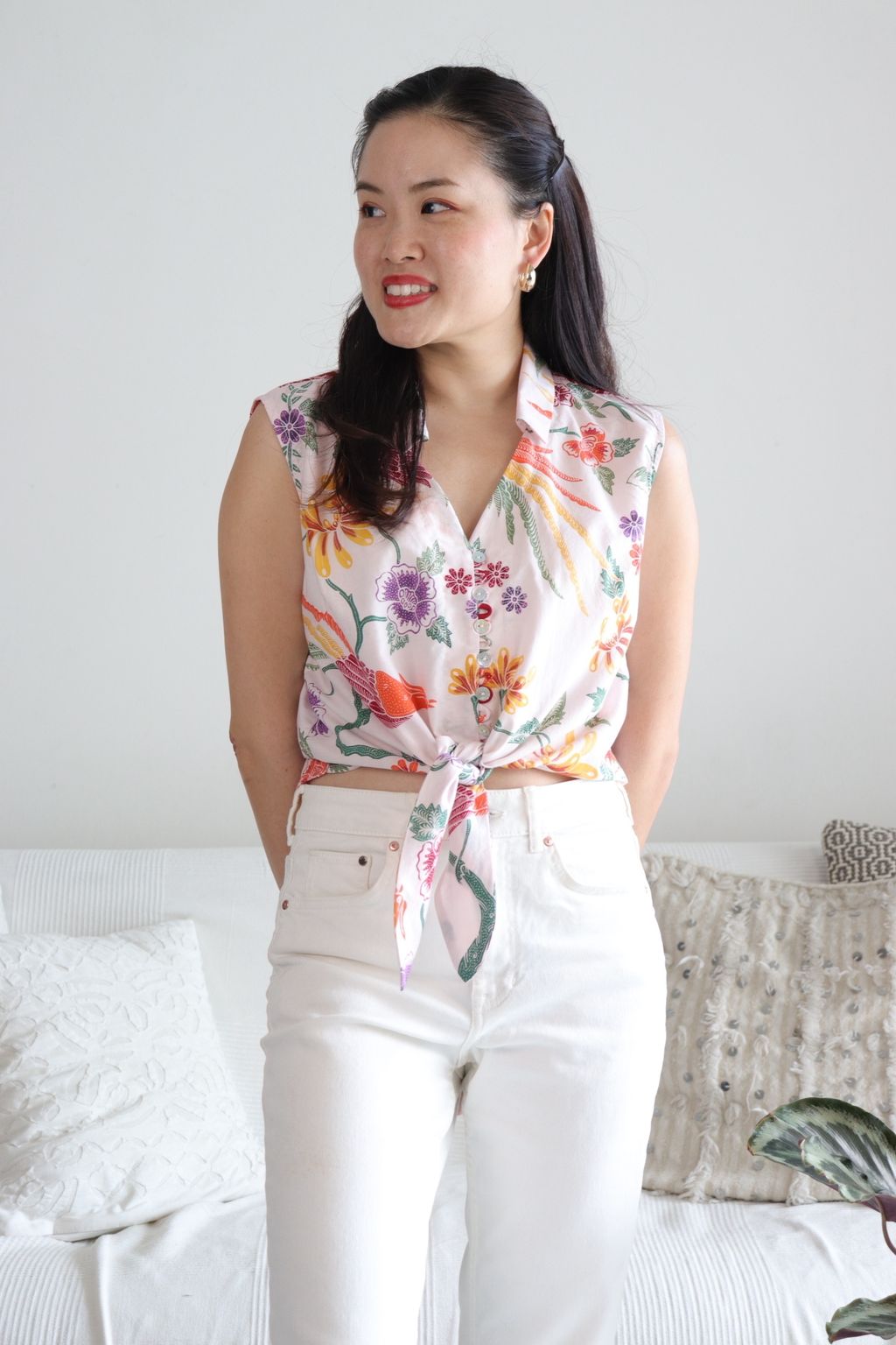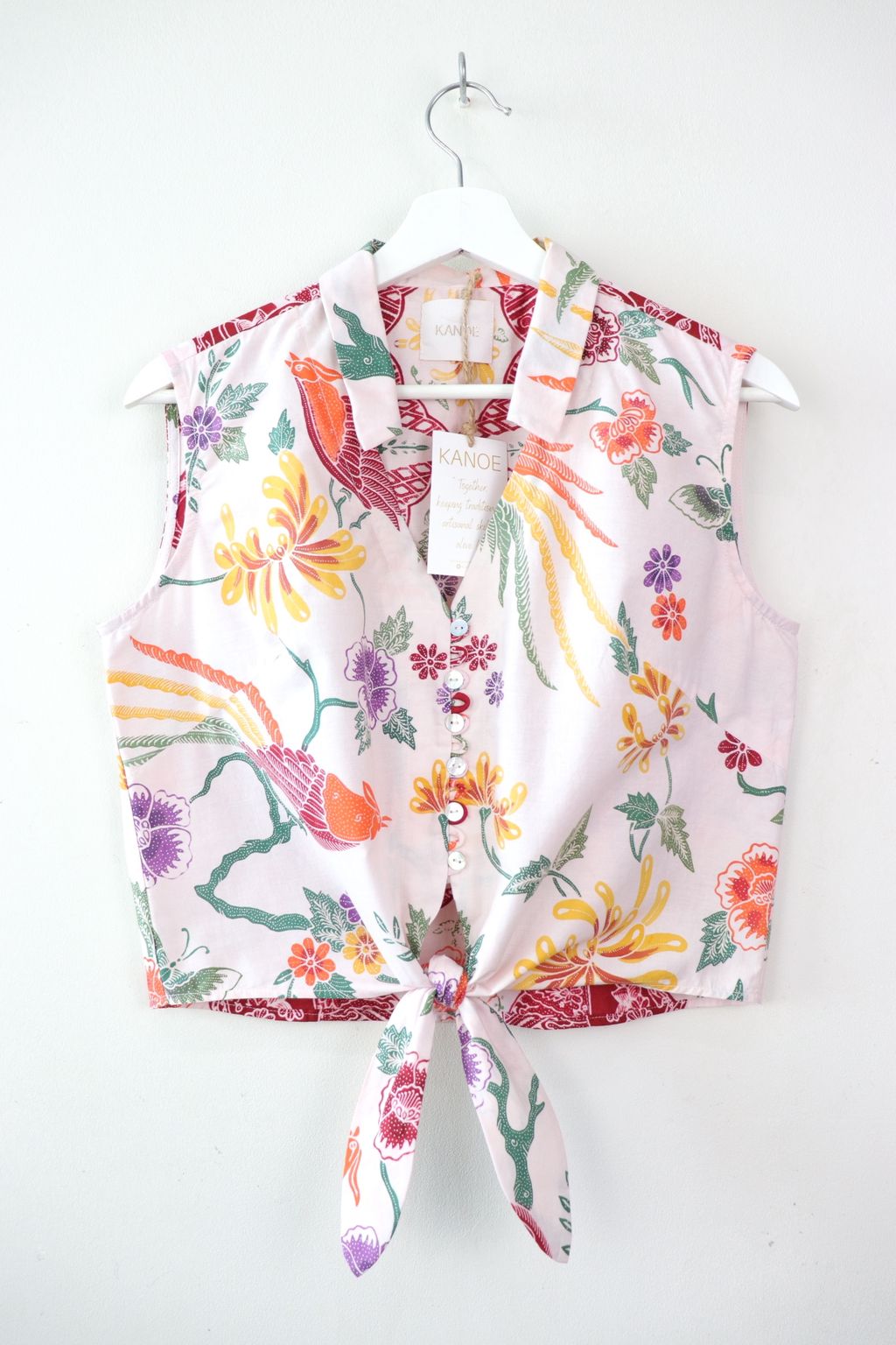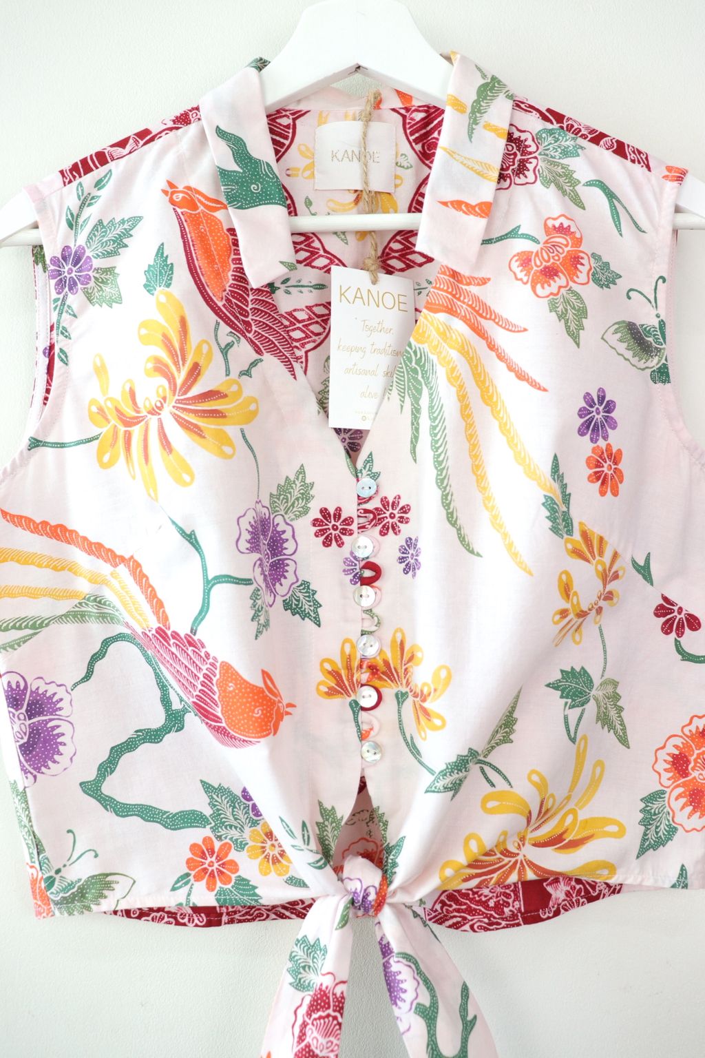These pastel sleeveless front tie top are made from intricate hand stamped batik textile. Not one piece alike, you will love how beautiful the colours and print of this batik is made by skilled artisans of centuries of batik making wisdom. These batik come from a region where the batik makers have influence from Chinese and European merchants in which is on display in the motifs and colours of the batik.