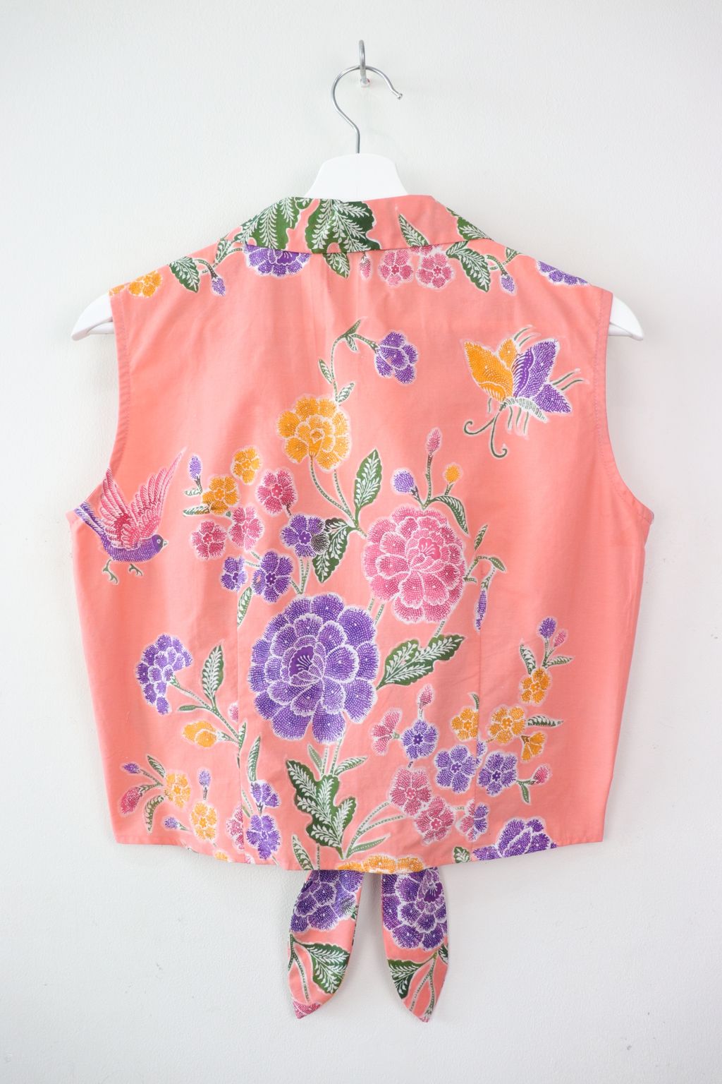 These pastel sleeveless front tie top are made from intricate hand stamped batik textile. Not one piece alike, you will love how beautiful the colours and print of this batik is made by skilled artisans of centuries of batik making wisdom. These batik come from a region where the batik makers have influence from Chinese and European merchants in which is on display in the motifs and colours of the batik.