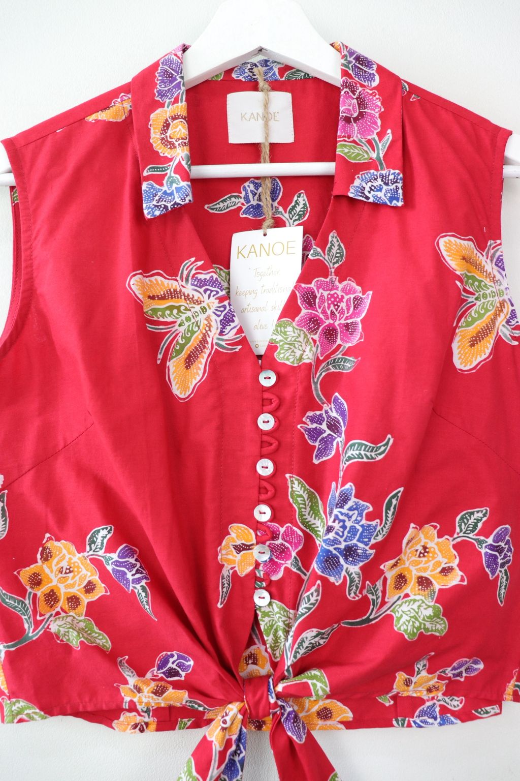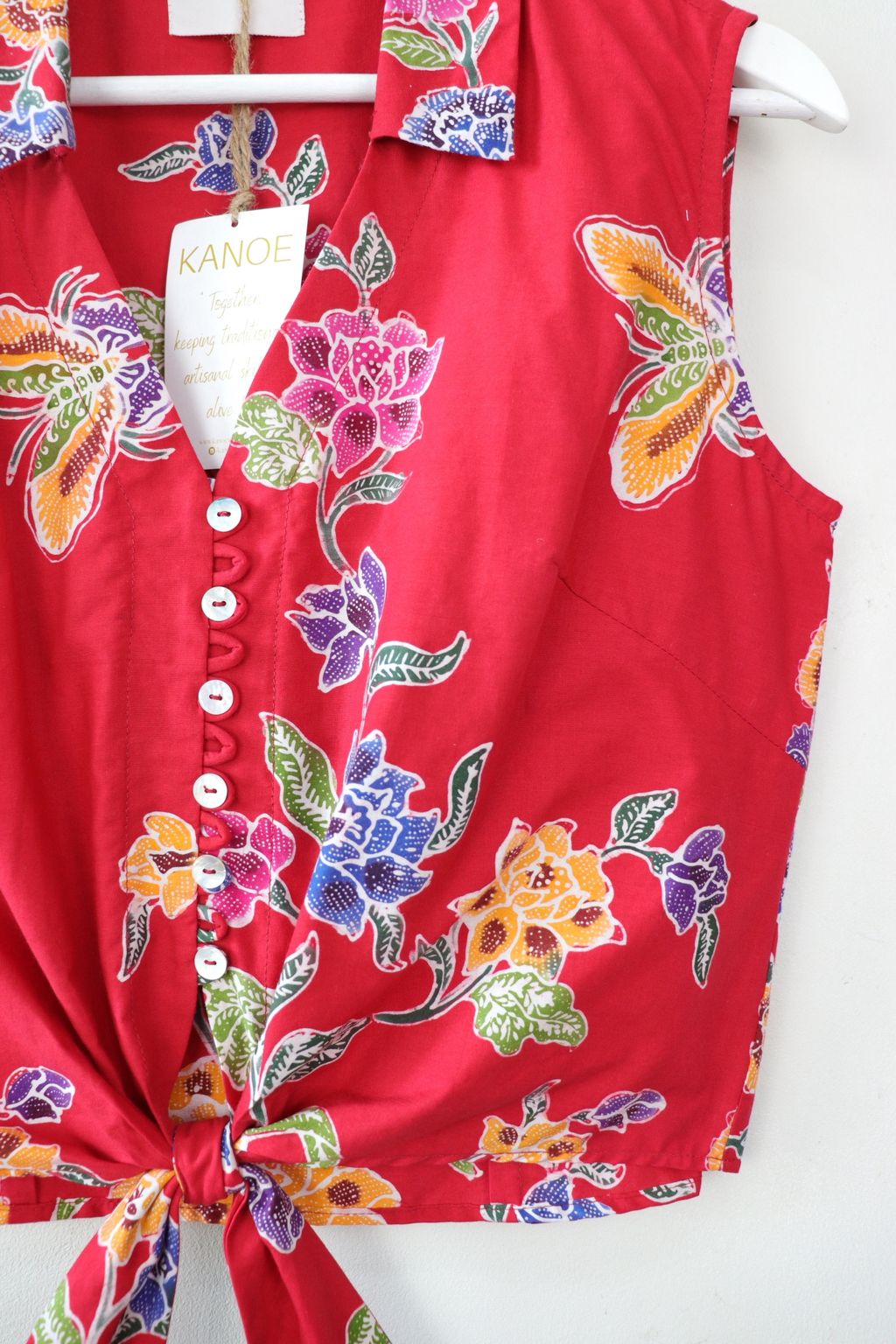 These pastel sleeveless front tie top are made from intricate hand stamped batik textile. Not one piece alike, you will love how beautiful the colours and print of this batik is made by skilled artisans of centuries of batik making wisdom. These batik come from a region where the batik makers have influence from Chinese and European merchants in which is on display in the motifs and colours of the batik.