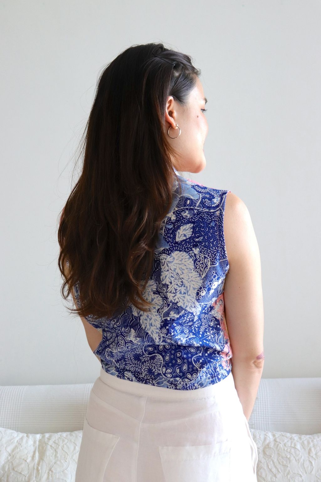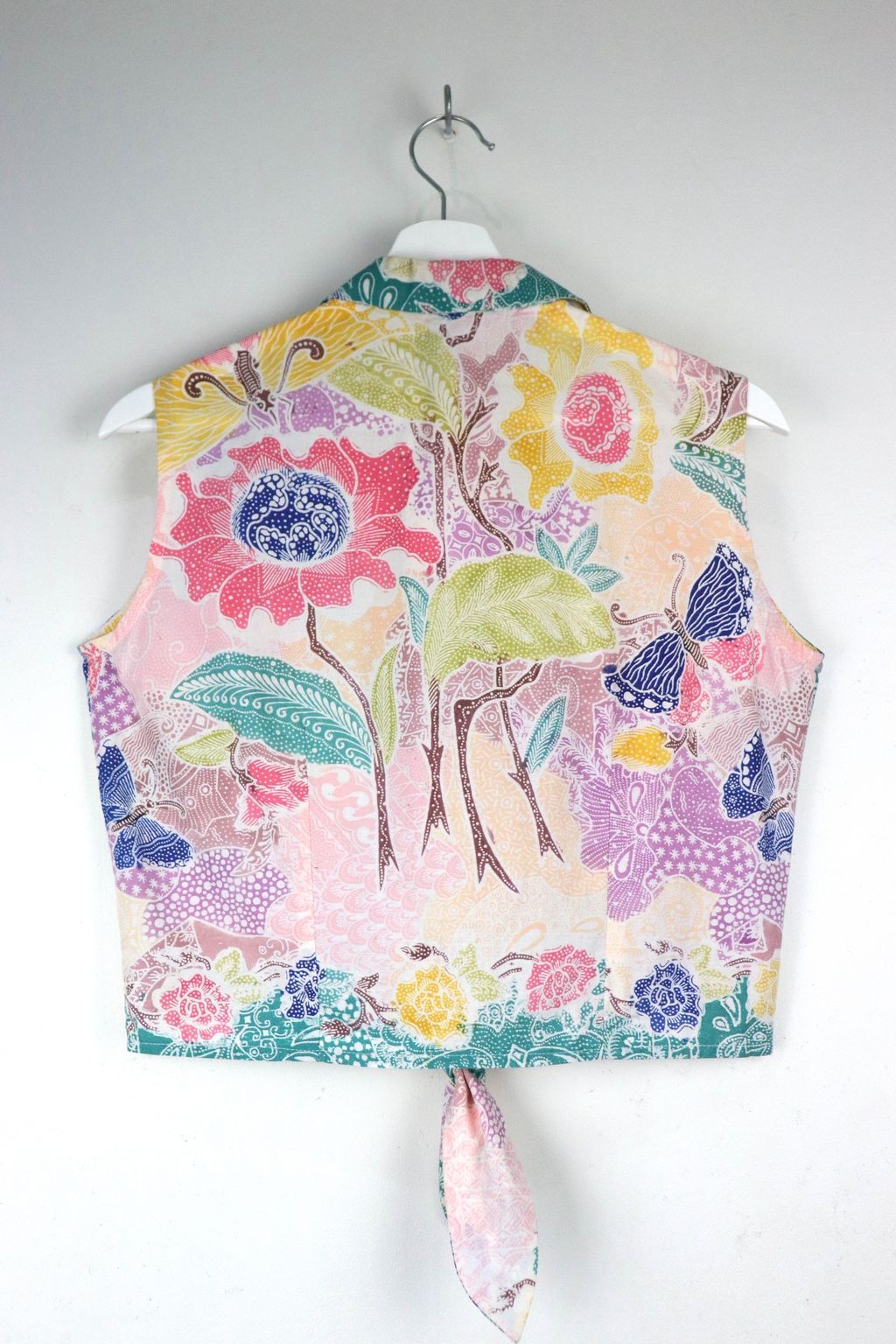 These sleeveless front tie tops are made from intricately handstamped batik textiles, so no two pieces are alike! You will love how beautiful the colours and print of this batik is, after all, they are made by skilled artisans with centuries of batik making wisdom. These batik comes from a region where batik makers have influence from Chinese and European merchants, and this is reflected in the motif and colours of the batik.