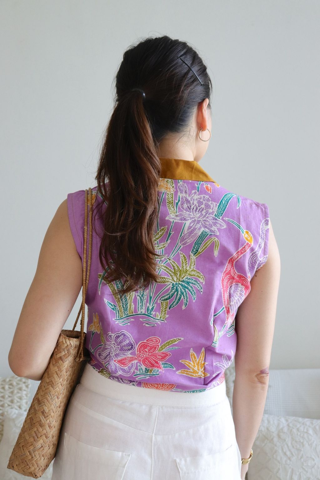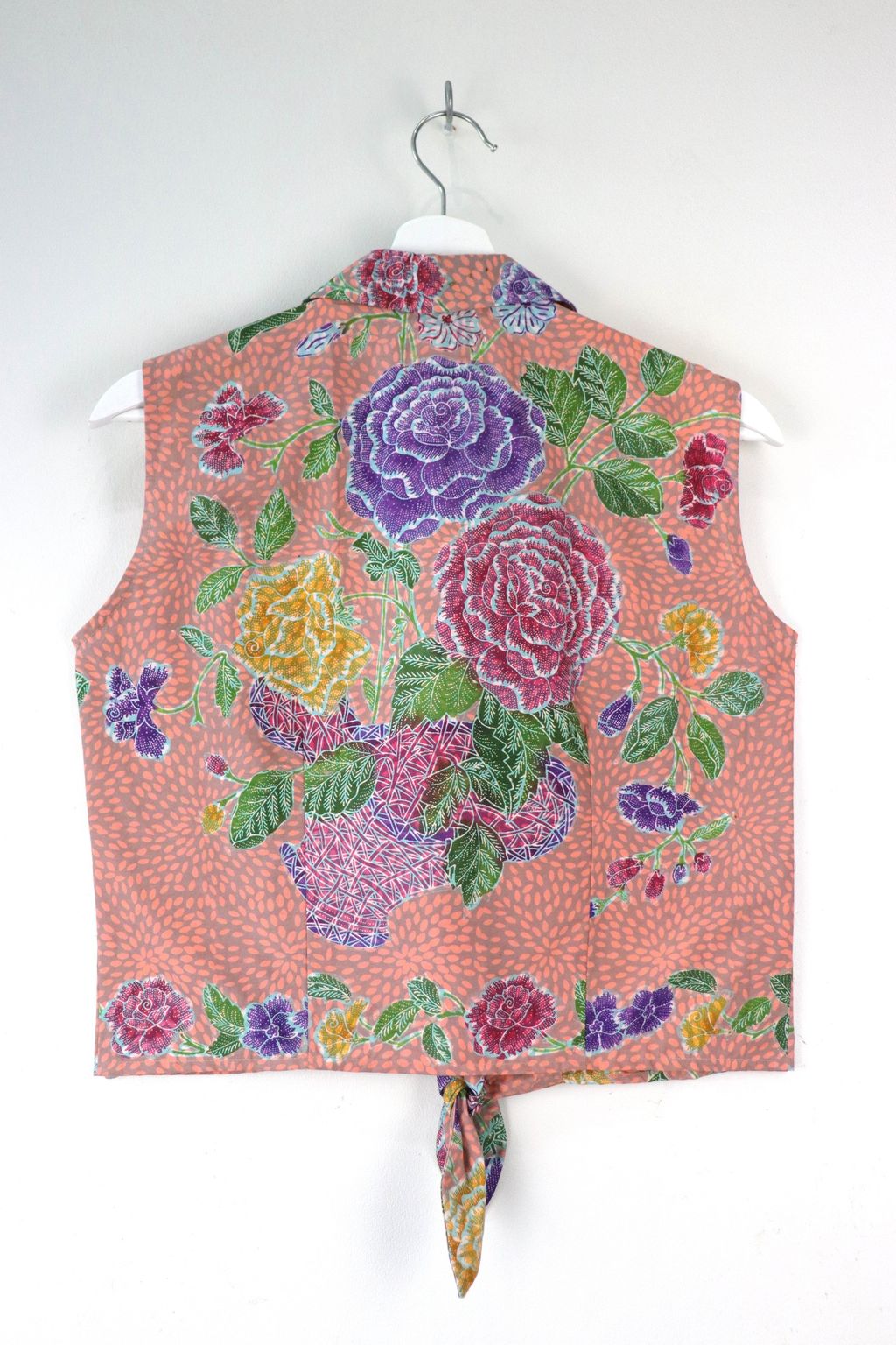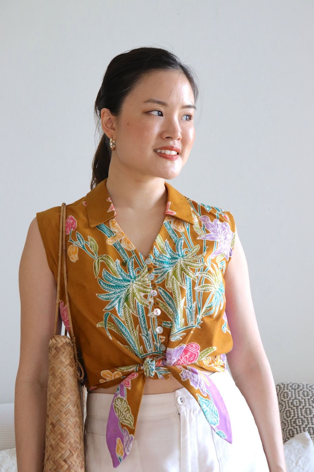 These sleeveless front tie tops are made from intricately handstamped batik textiles, so no two pieces are alike! You will love how beautiful the colours and print of this batik is, after all, they are made by skilled artisans with centuries of batik making wisdom. These batik comes from a region where batik makers have influence from Chinese and European merchants, and this is reflected in the motif and colours of the batik.