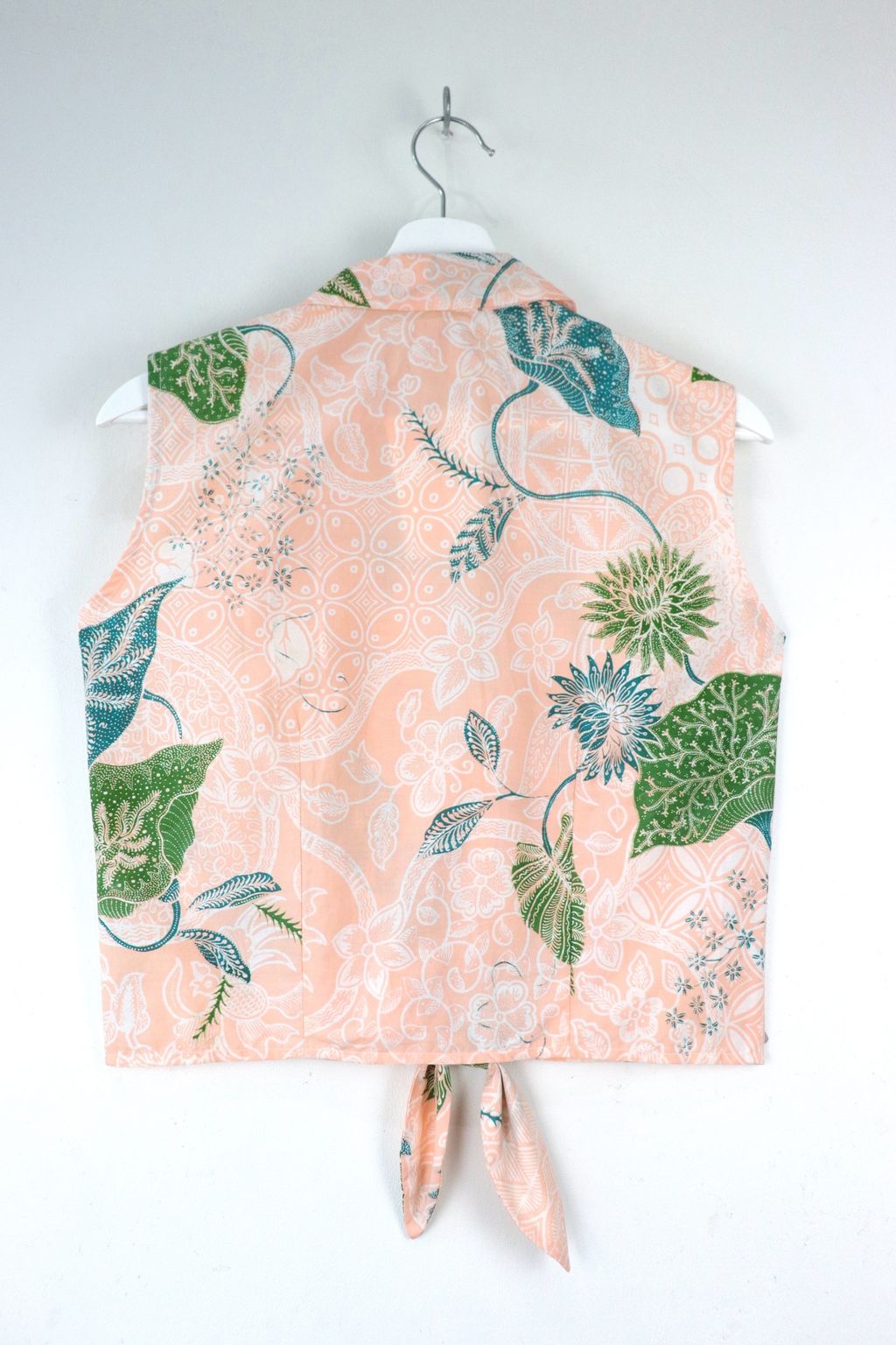 These sleeveless front tie tops are made from intricately handstamped batik textiles, so no two pieces are alike! You will love how beautiful the colours and print of this batik is, after all, they are made by skilled artisans with centuries of batik making wisdom. These batik comes from a region where batik makers have influence from Chinese and European merchants, and this is reflected in the motif and colours of the batik.
