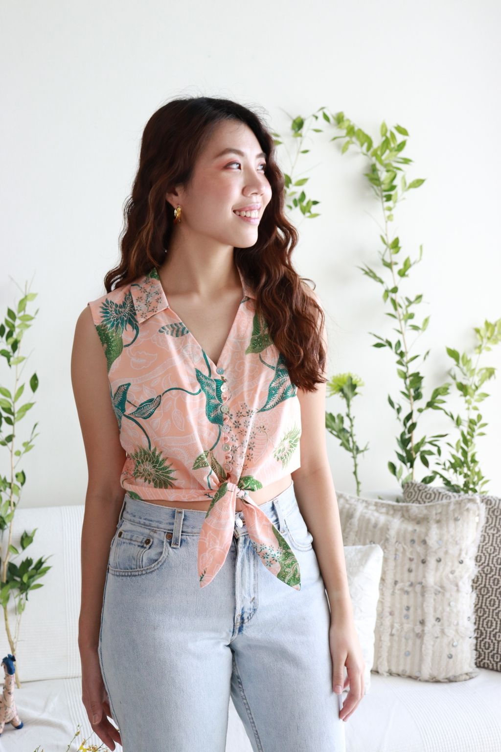 These sleeveless front tie tops are made from intricately handstamped batik textiles, so no two pieces are alike! You will love how beautiful the colours and print of this batik is, after all, they are made by skilled artisans with centuries of batik making wisdom. These batik comes from a region where batik makers have influence from Chinese and European merchants, and this is reflected in the motif and colours of the batik.