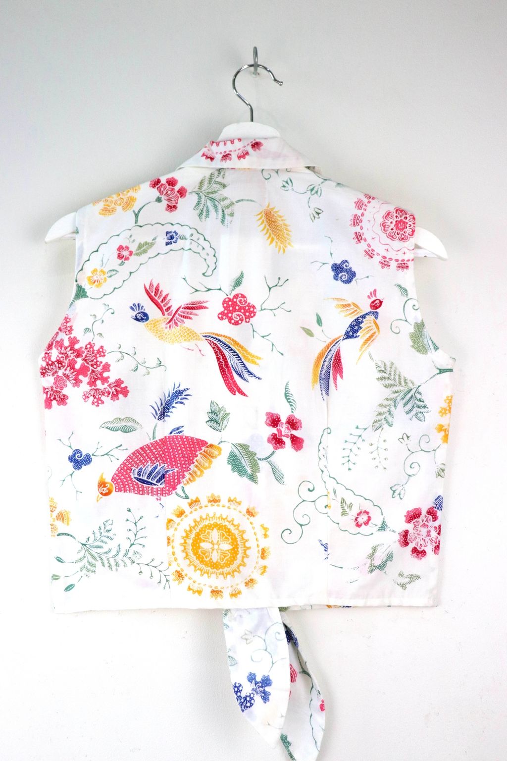 These sleeveless front tie tops are made from intricately handstamped batik textiles, so no two pieces are alike! You will love how beautiful the colours and print of this batik is, after all, they are made by skilled artisans with centuries of batik making wisdom. These batik comes from a region where batik makers have influence from Chinese and European merchants, and this is reflected in the motif and colours of the batik.
