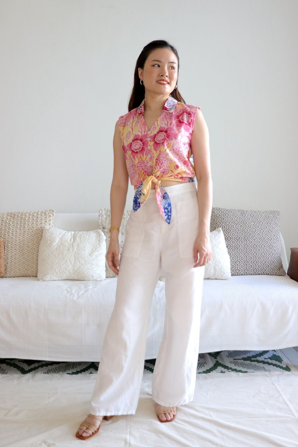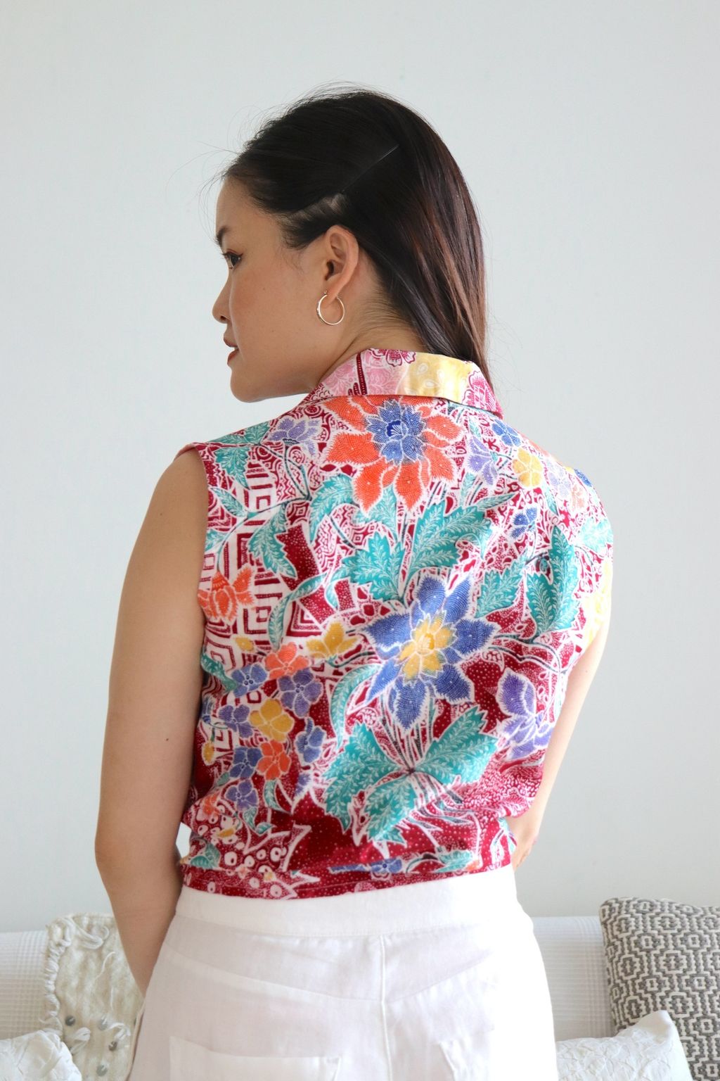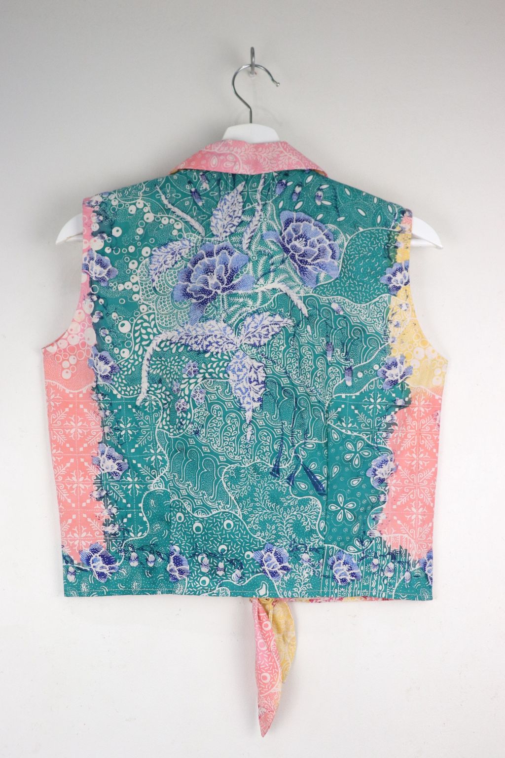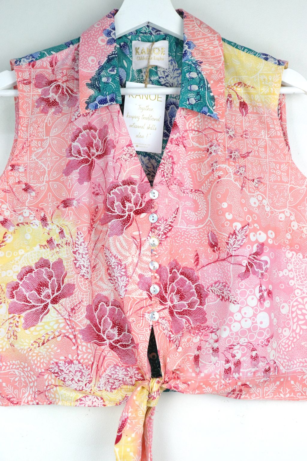 These sleeveless front tie tops are made from intricately handstamped batik textiles, so no two pieces are alike! You will love how beautiful the colours and print of this batik is, after all, they are made by skilled artisans with centuries of batik making wisdom. These batik comes from a region where batik makers have influence from Chinese and European merchants, and this is reflected in the motif and colours of the batik.