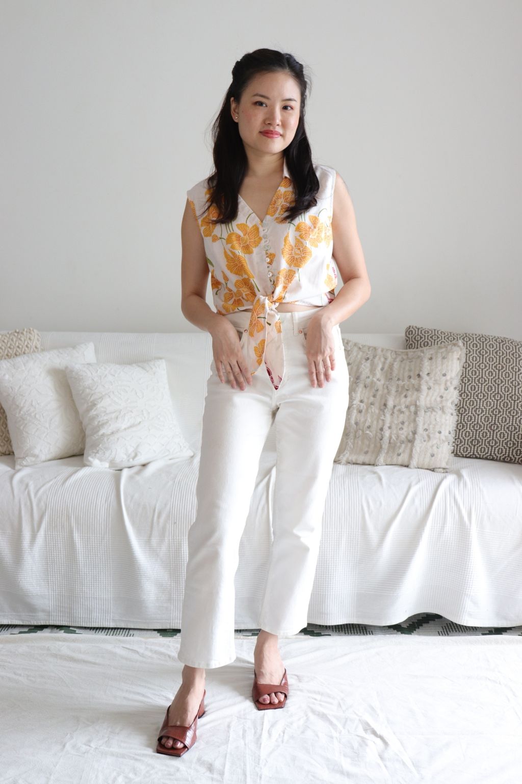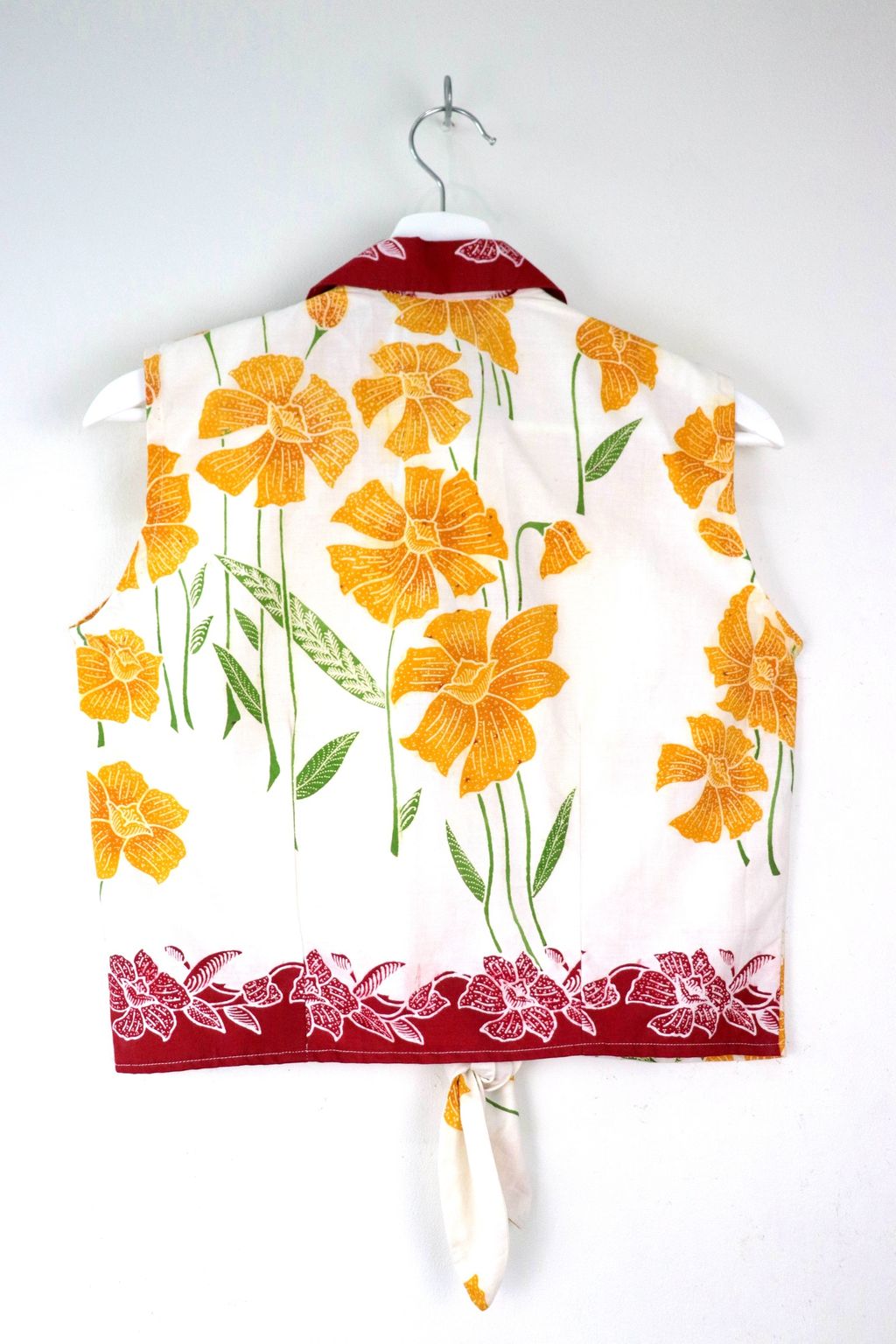 These sleeveless front tie tops are made from intricately handstamped batik textiles, so no two pieces are alike! You will love how beautiful the colours and print of this batik is, after all, they are made by skilled artisans with centuries of batik making wisdom. These batik comes from a region where batik makers have influence from Chinese and European merchants, and this is reflected in the motif and colours of the batik.