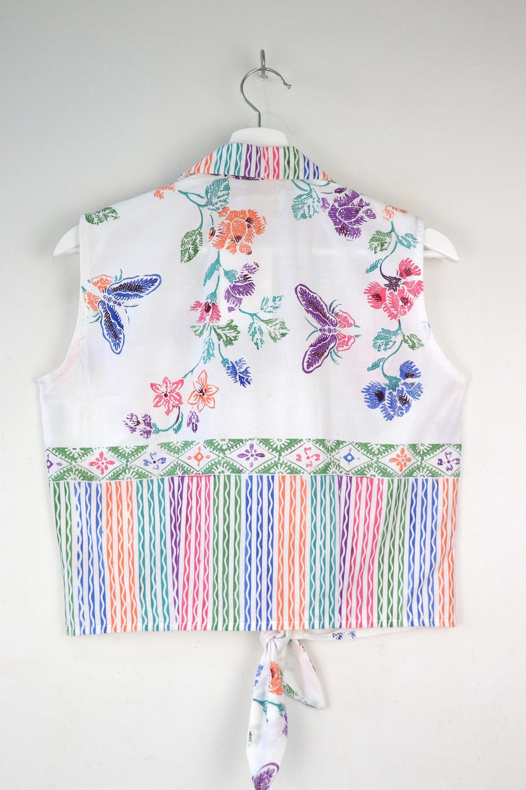 These sleeveless front tie tops are made from intricately handstamped batik textiles, so no two pieces are alike! You will love how beautiful the colours and print of this batik is, after all, they are made by skilled artisans with centuries of batik making wisdom. These batik comes from a region where batik makers have influence from Chinese and European merchants, and this is reflected in the motif and colours of the batik.