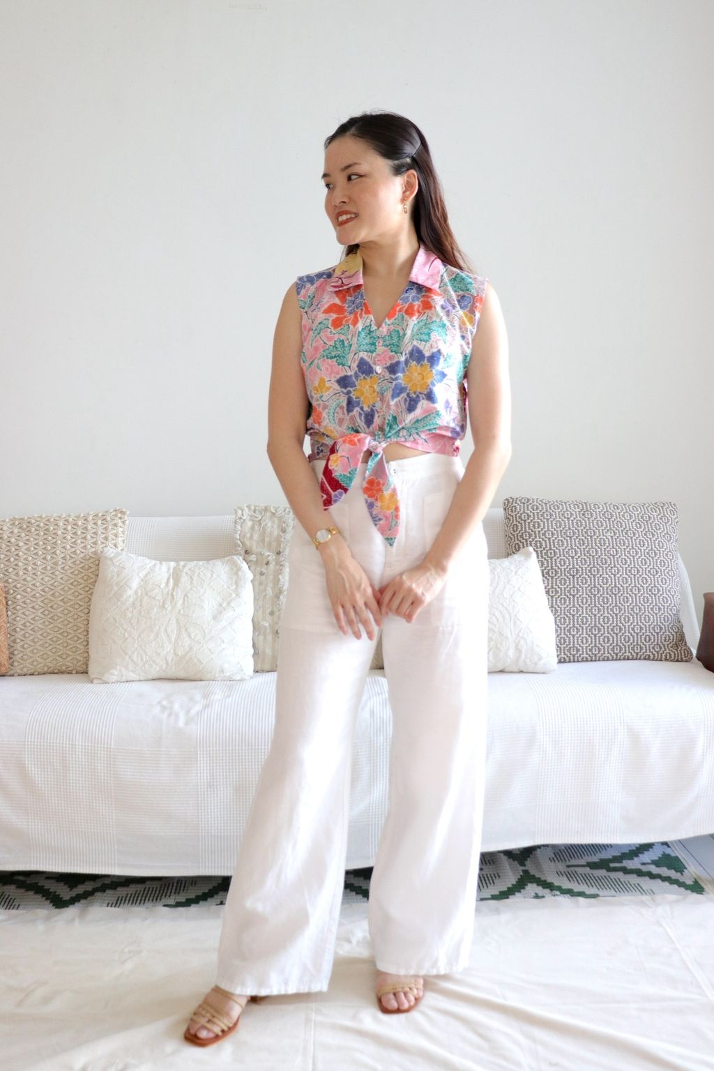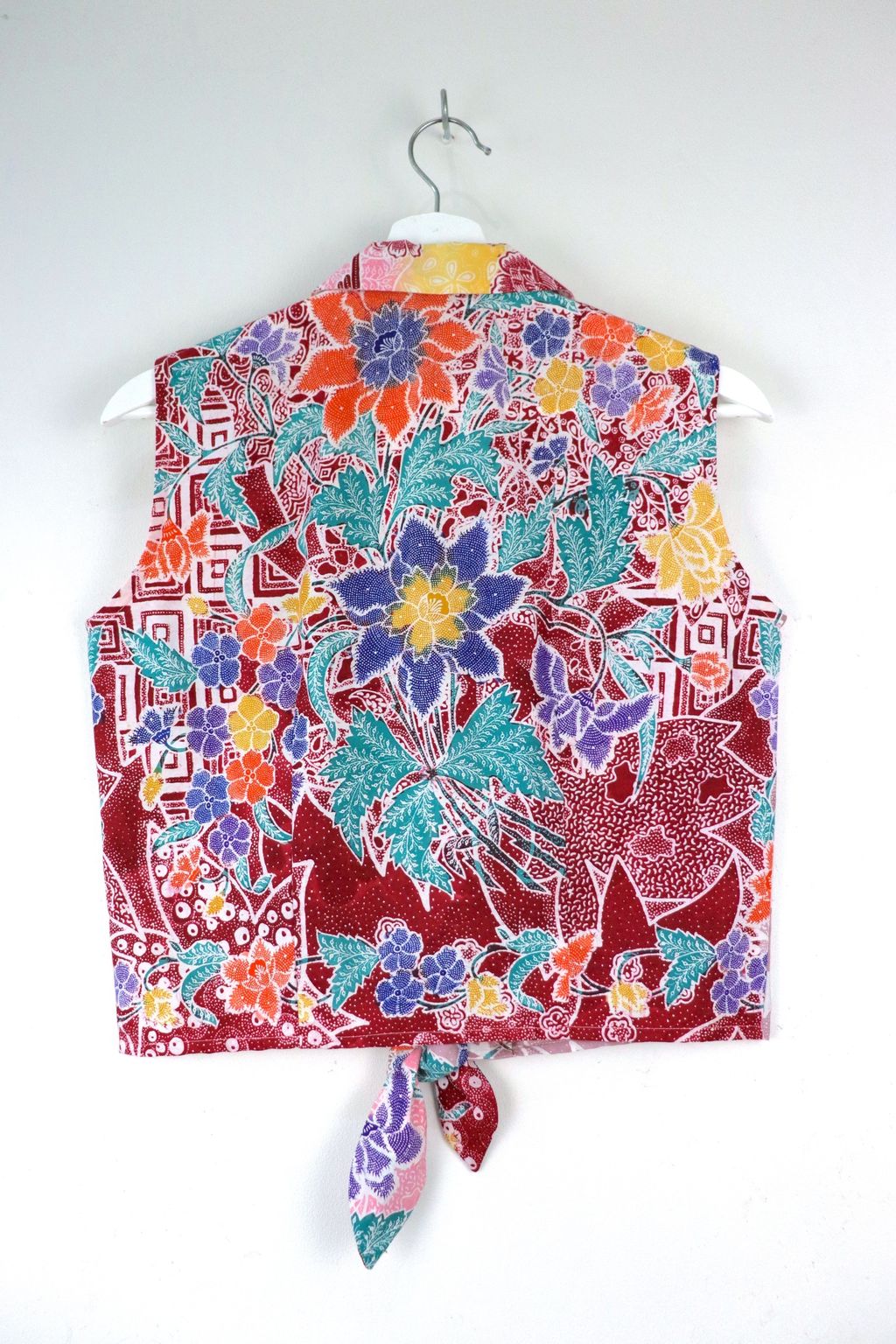 These sleeveless front tie tops are made from intricately handstamped batik textiles, so no two pieces are alike! You will love how beautiful the colours and print of this batik is, after all, they are made by skilled artisans with centuries of batik making wisdom. These batik comes from a region where batik makers have influence from Chinese and European merchants, and this is reflected in the motif and colours of the batik.