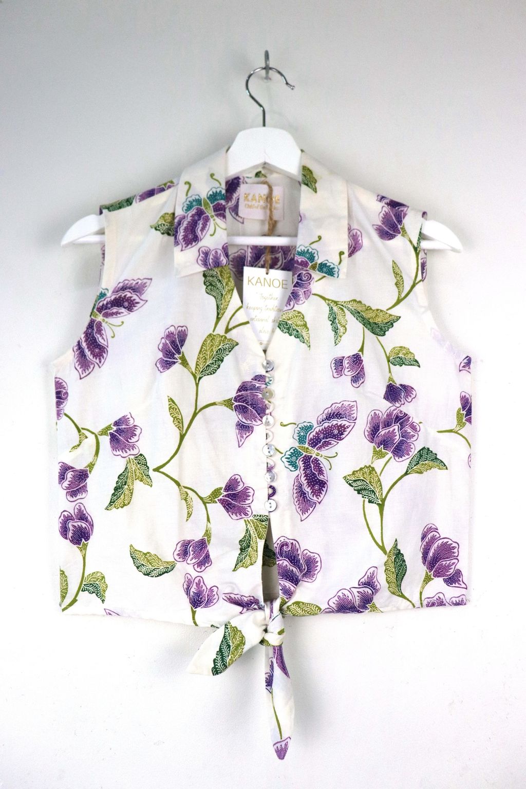 These sleeveless front tie tops are made from intricately handstamped batik textiles, so no two pieces are alike! You will love how beautiful the colours and print of this batik is, after all, they are made by skilled artisans with centuries of batik making wisdom. These batik comes from a region where batik makers have influence from Chinese and European merchants, and this is reflected in the motif and colours of the batik.