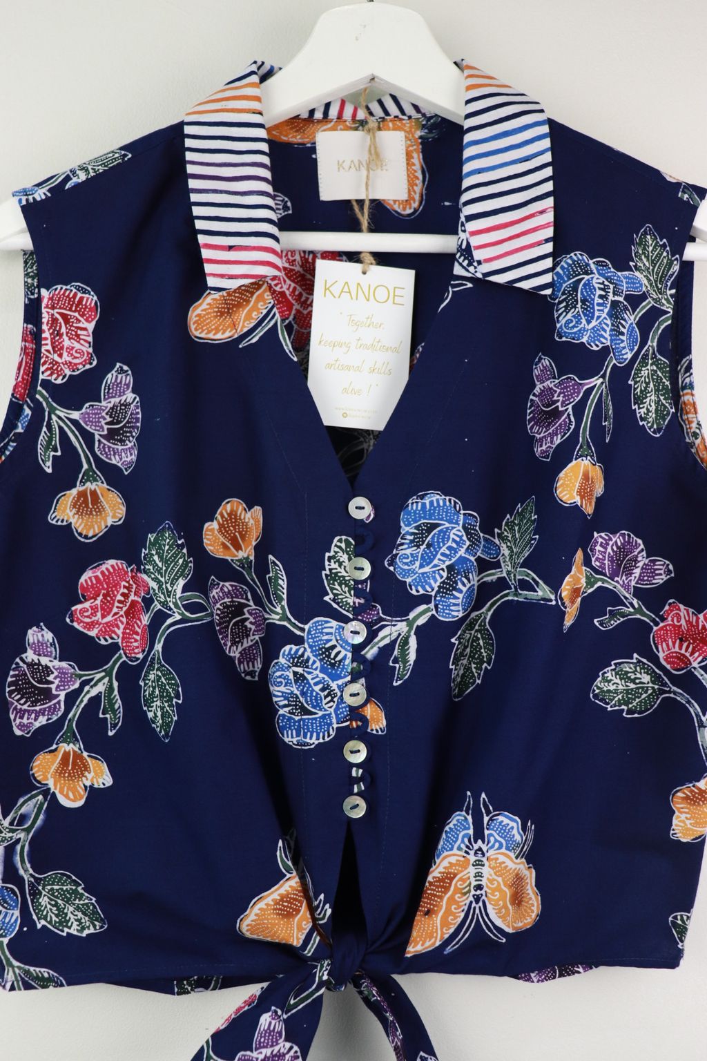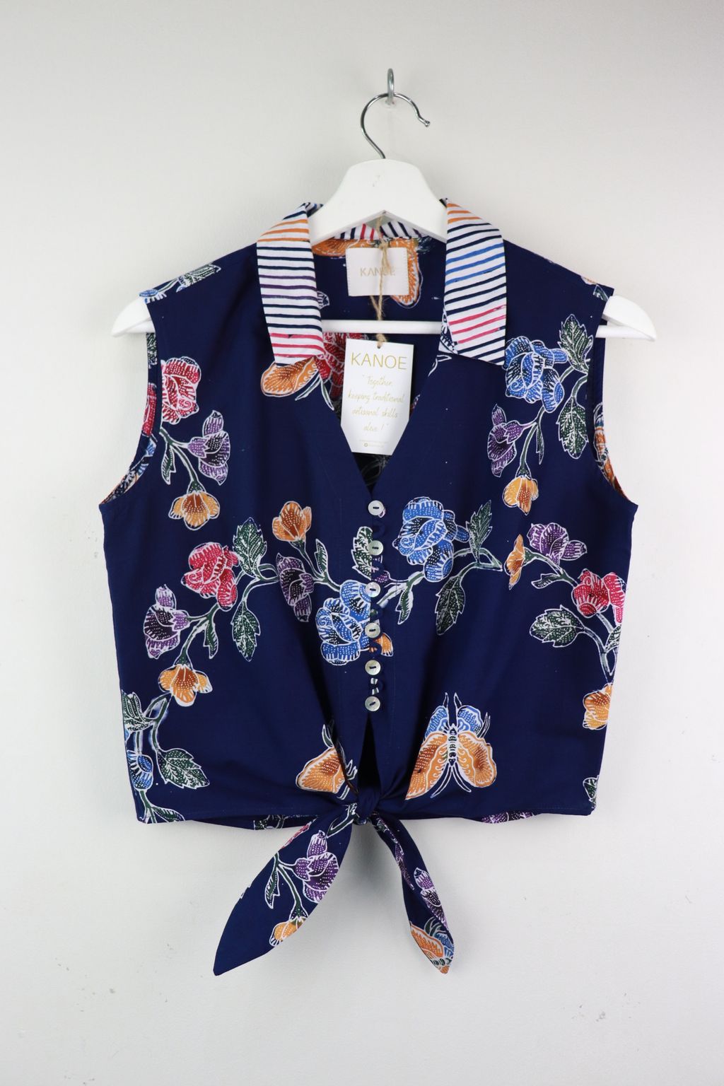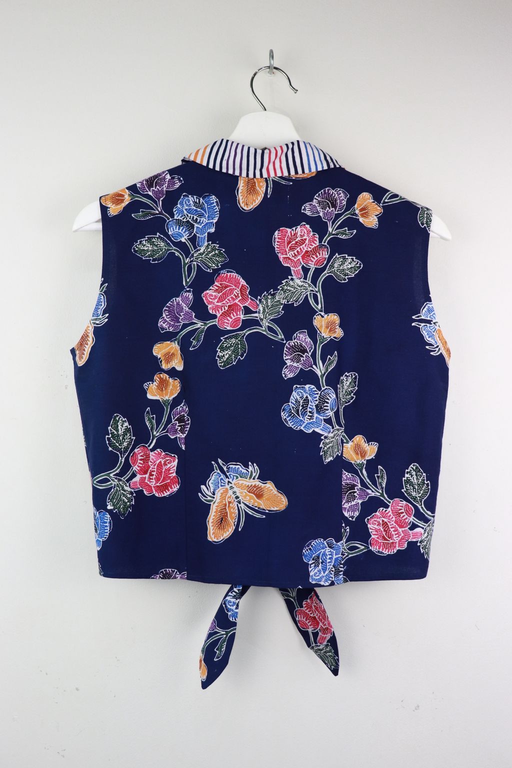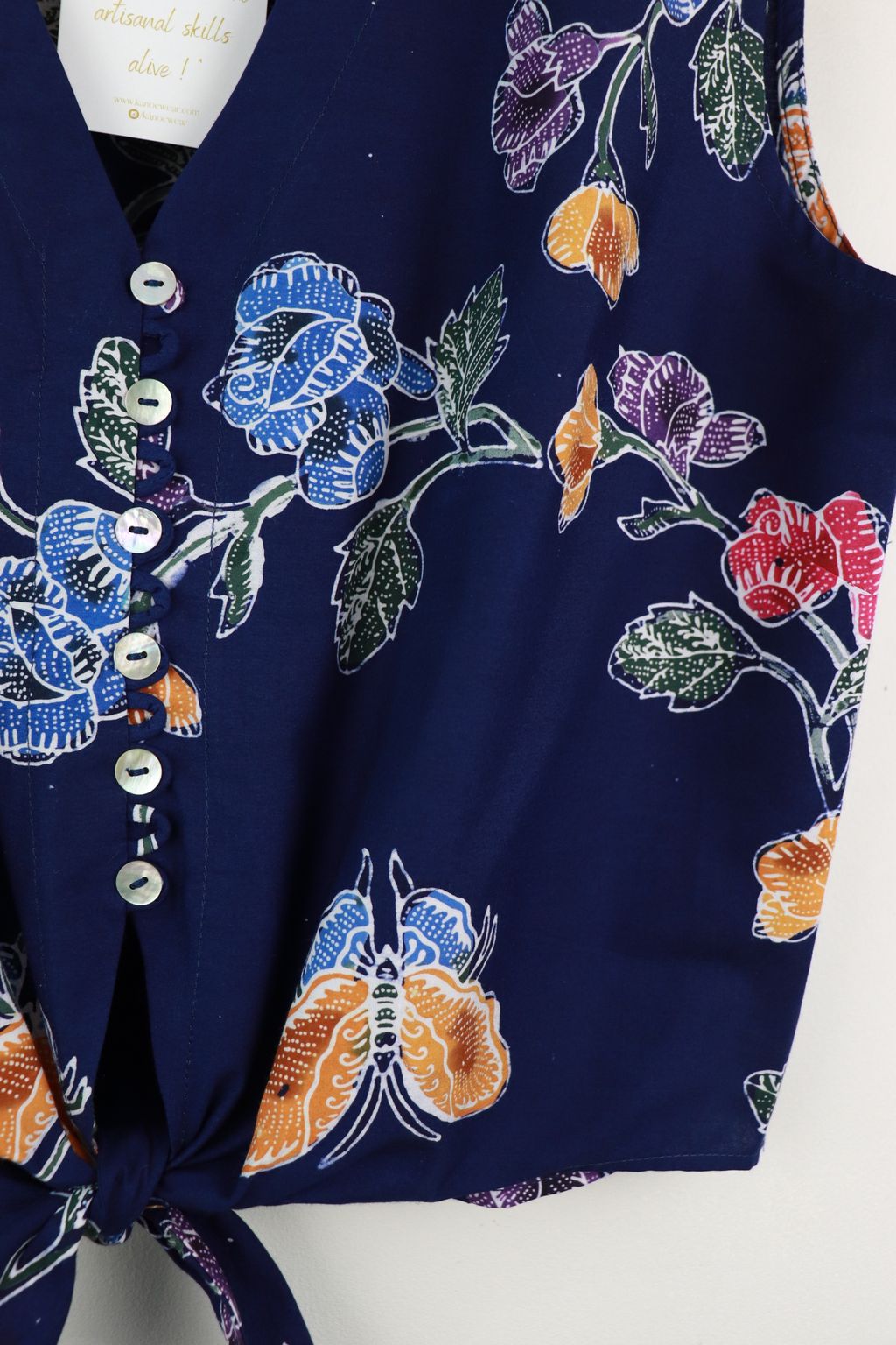 These pastel sleeveless front tie top are made from intricate hand stamped batik textile. Not one piece alike, you will love how beautiful the colours and print of this batik is made by skilled artisans of centuries of batik making wisdom. These batik come from a region where the batik makers have influence from Chinese and European merchants in which is on display in the motifs and colours of the batik.