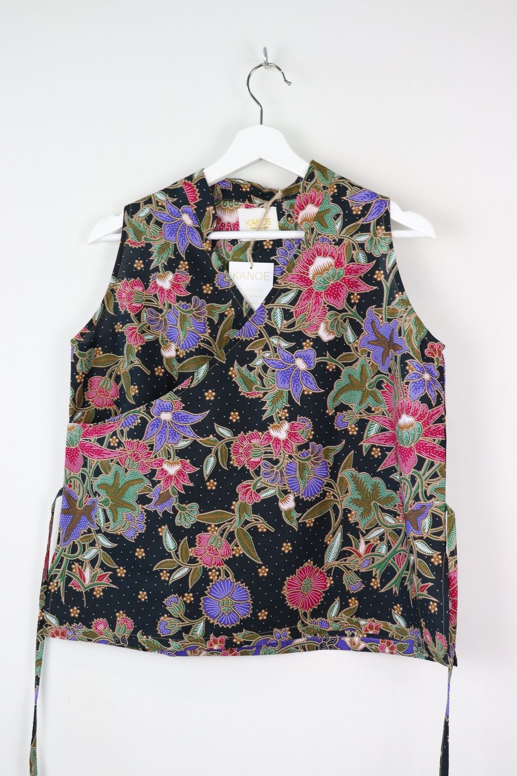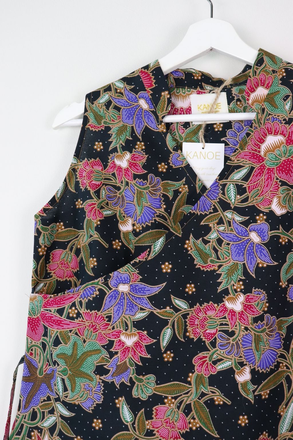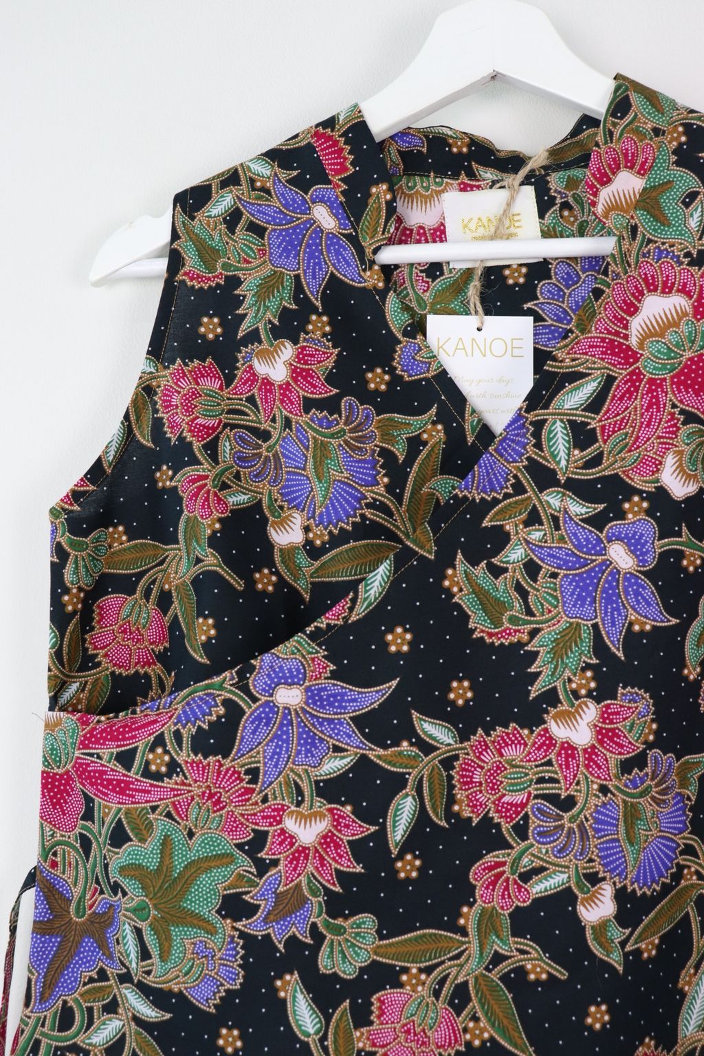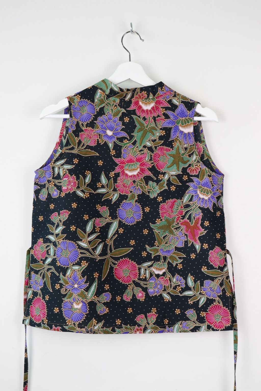 Made of 100% cotton batik. This top has a flattering oriental neckline.