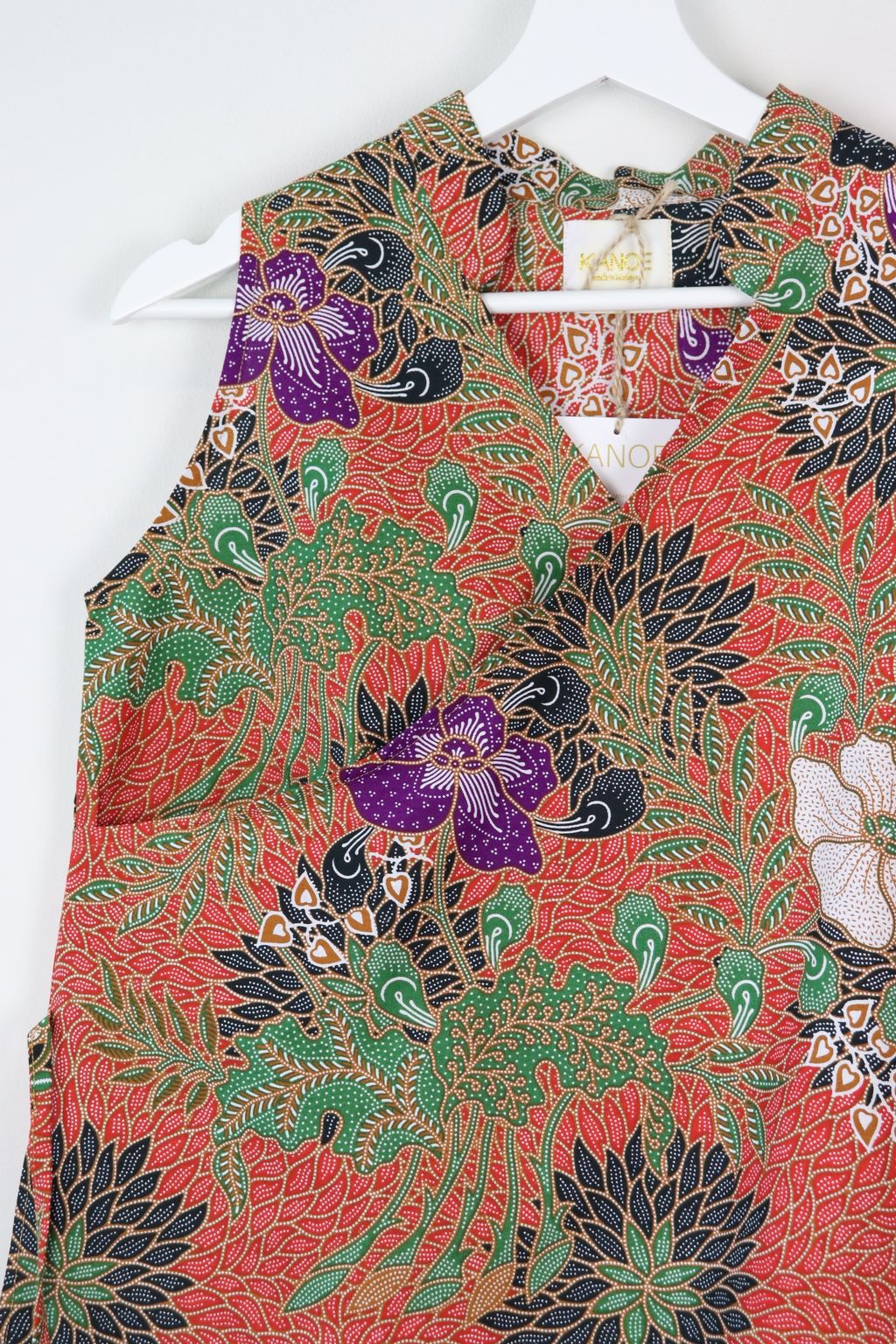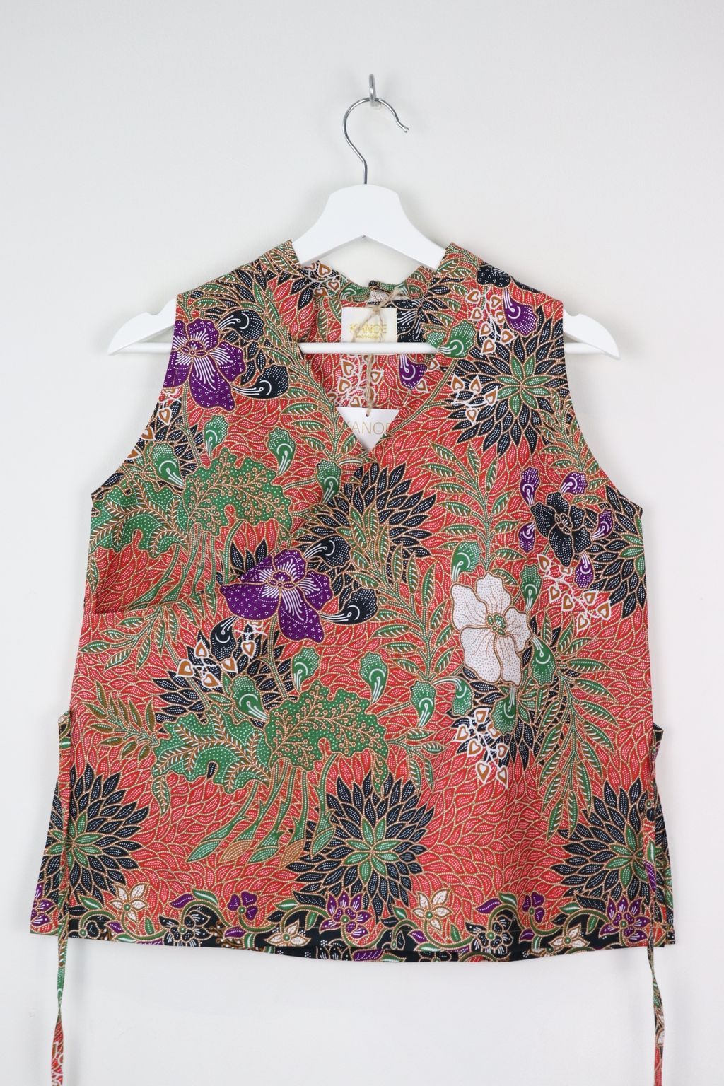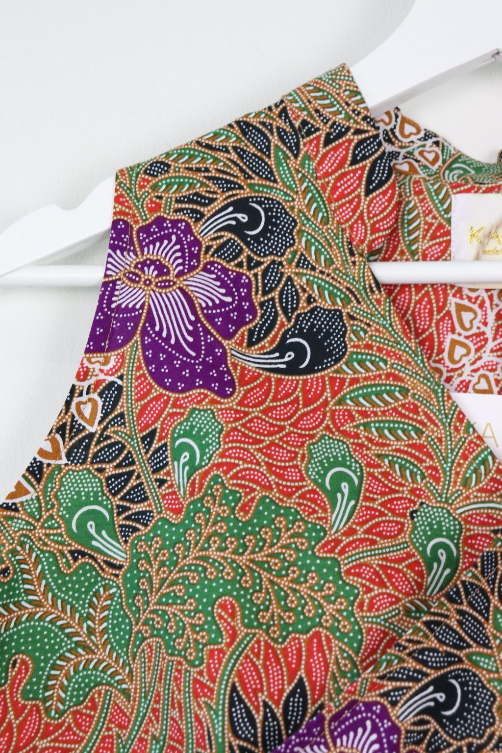 Made of 100% cotton batik. This top has a flattering oriental neckline.