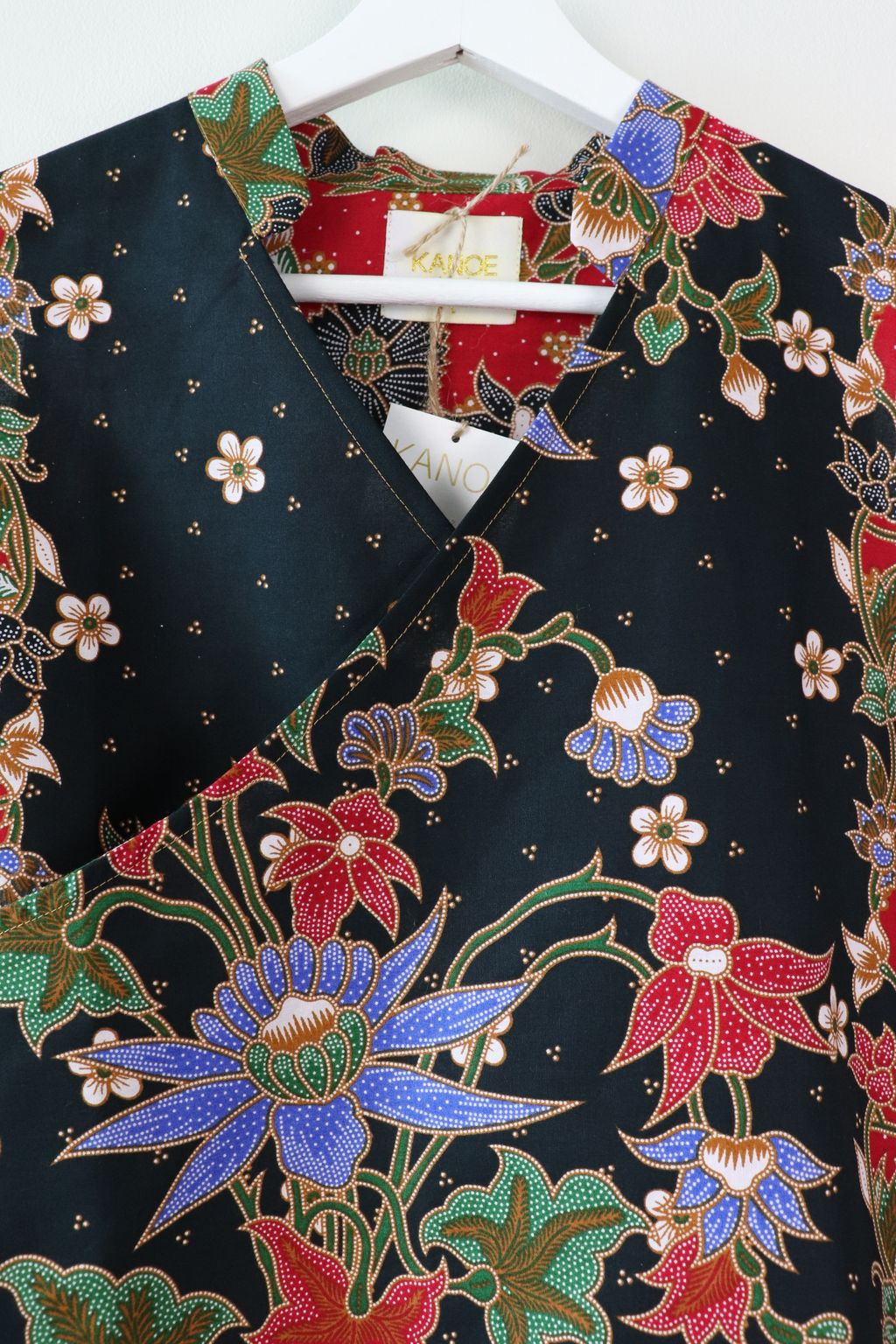 Made of 100% cotton batik. This top has a flattering oriental neckline.