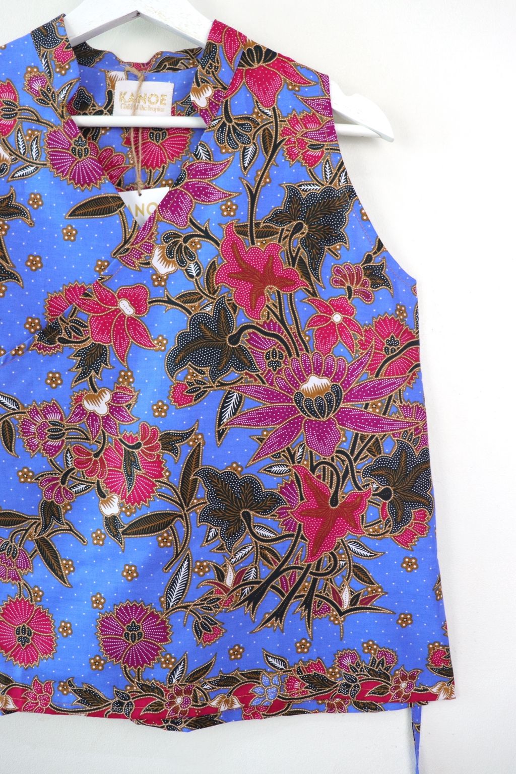 Made of 100% cotton batik. This top has a flattering oriental neckline.