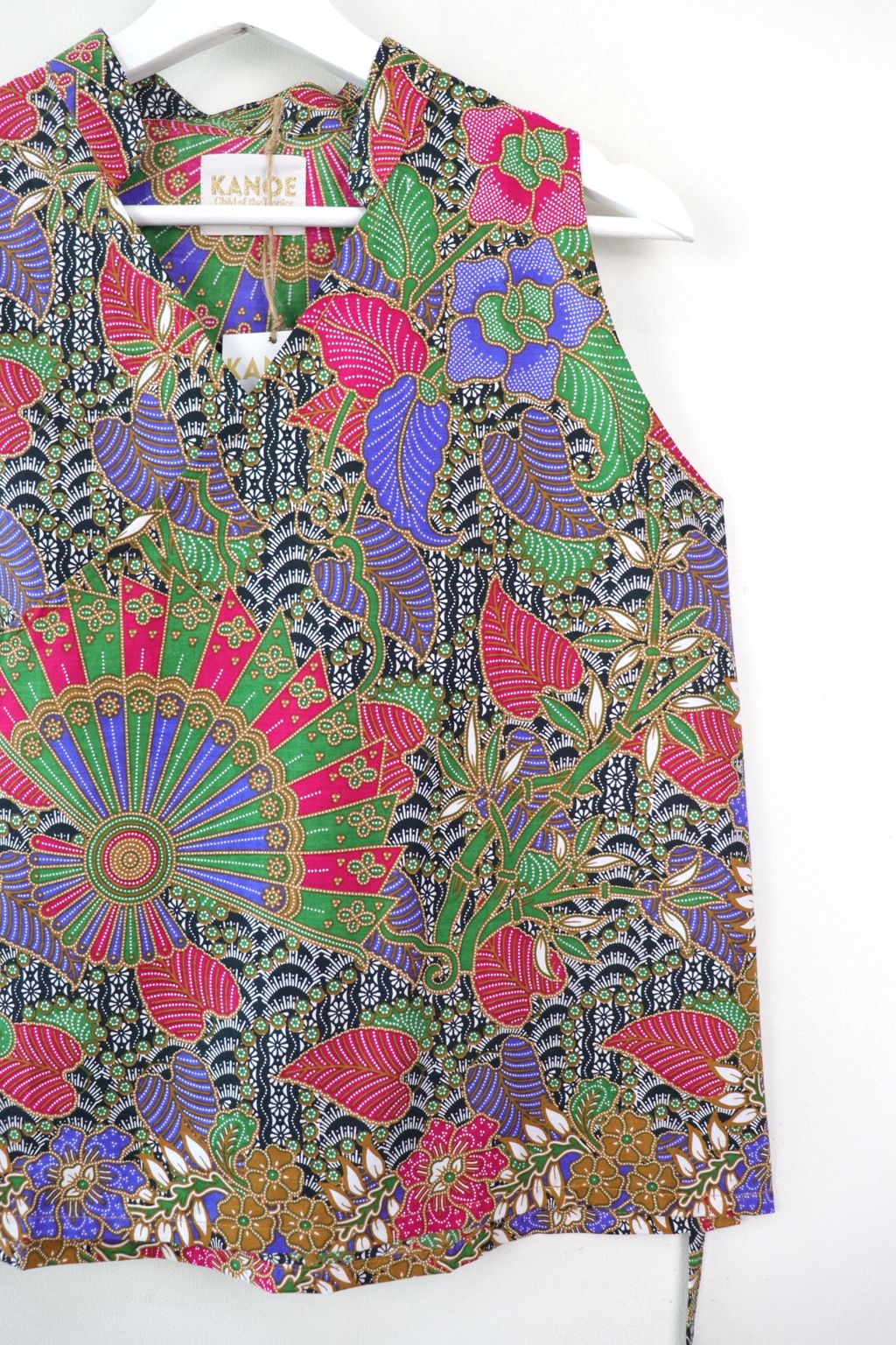 Made of 100% cotton batik. This top has a flattering oriental neckline.