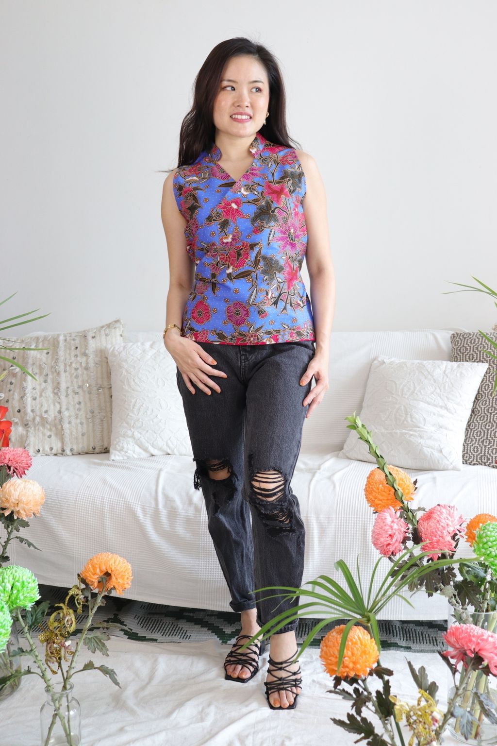 Made of 100% cotton batik. This top has a flattering oriental neckline.