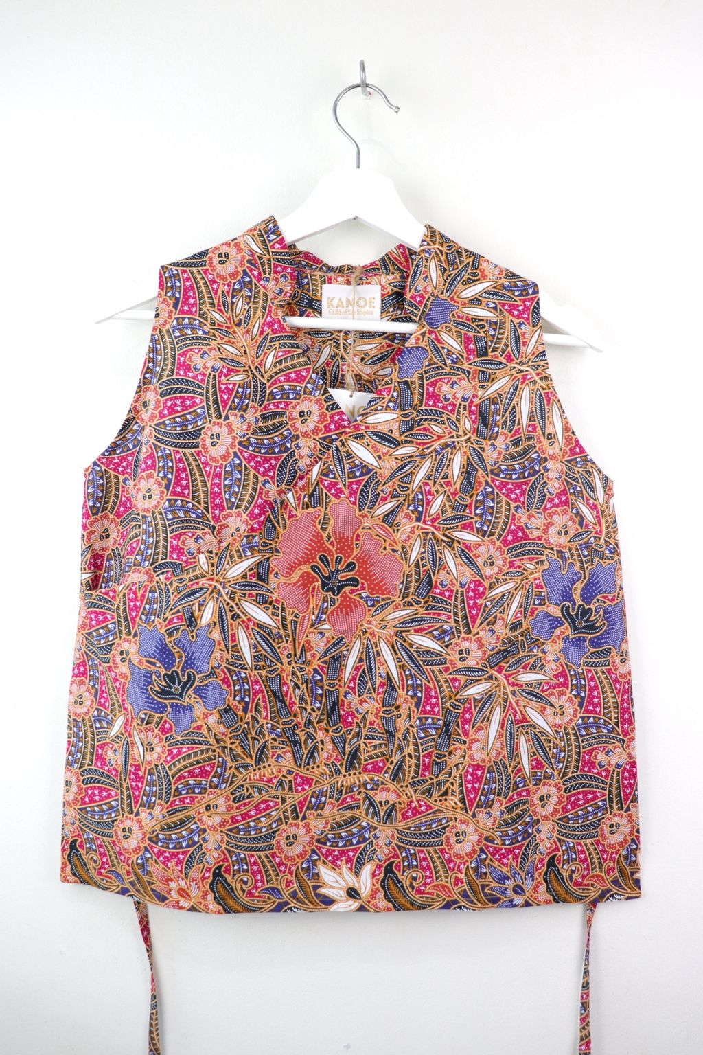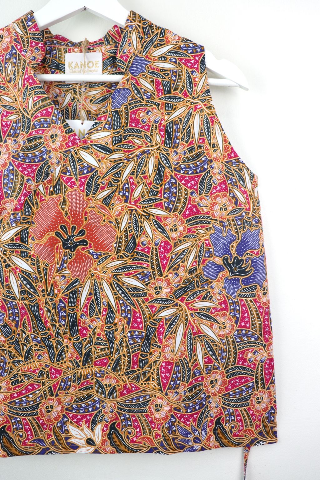 Made of 100% cotton batik. This top has a flattering oriental neckline.