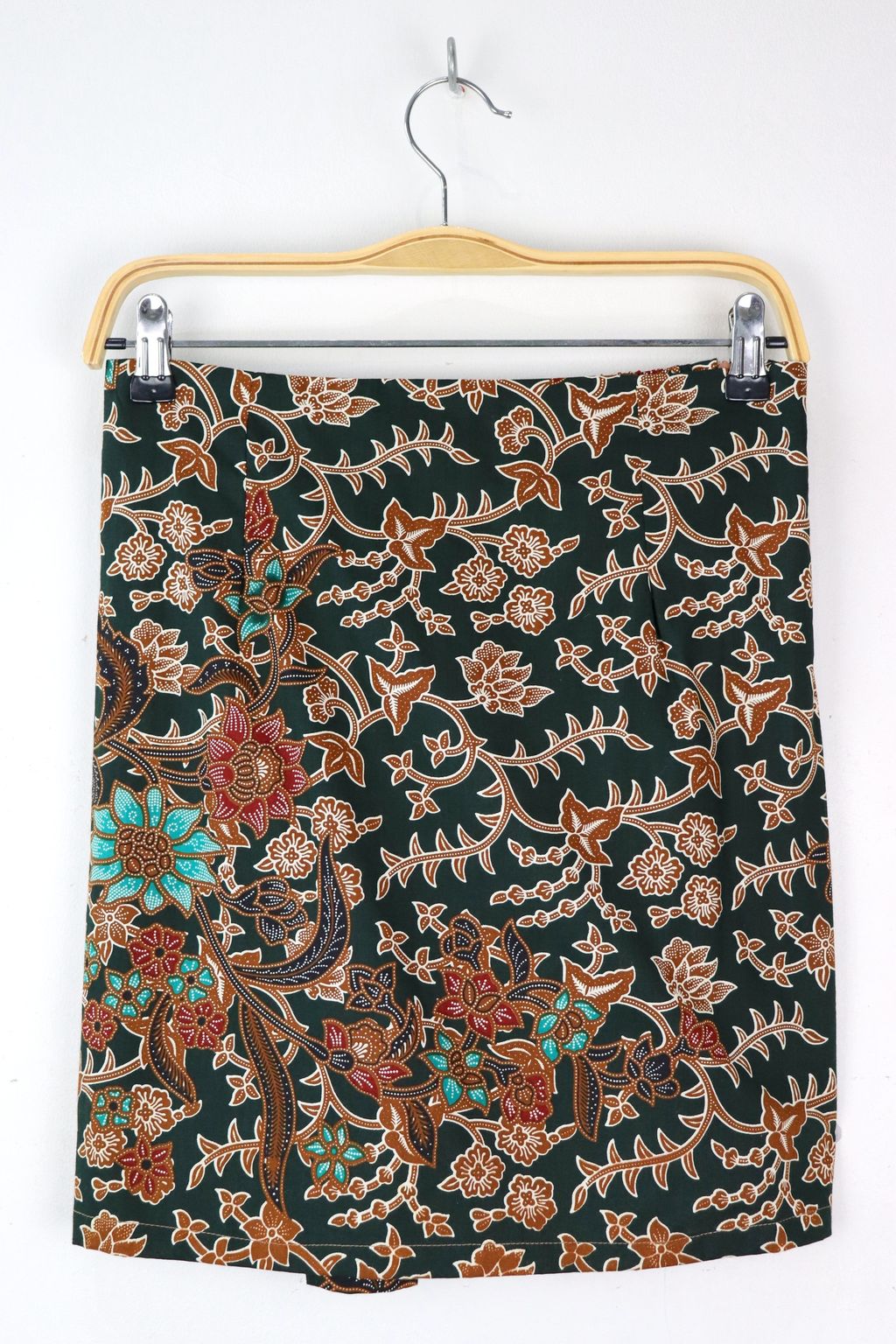 100% cotton of a kimono wrap top + a fitted mini skirt with side zip and elastic waist at back.