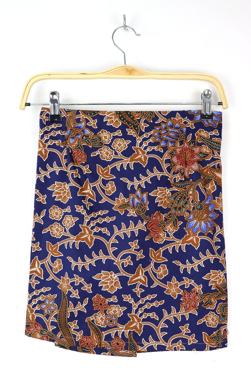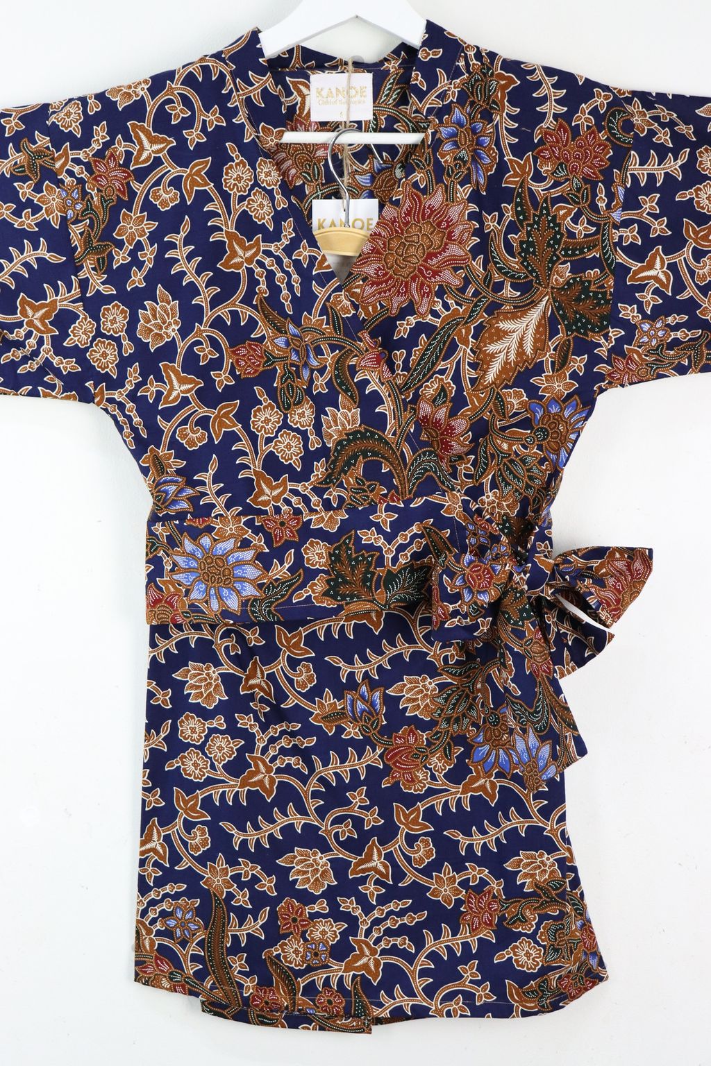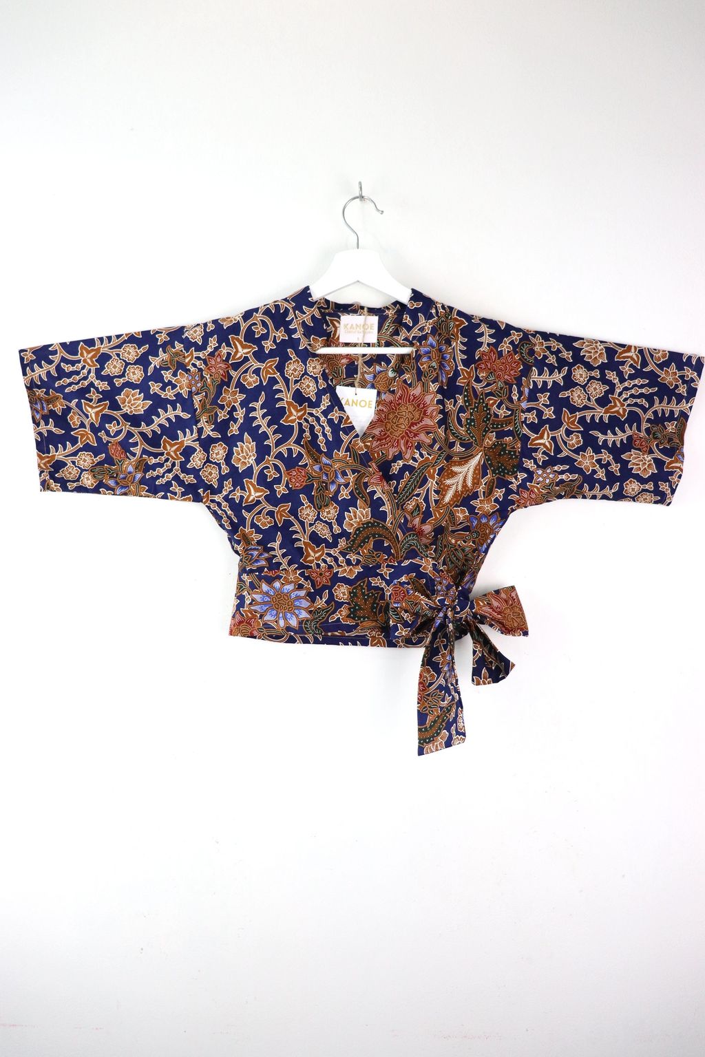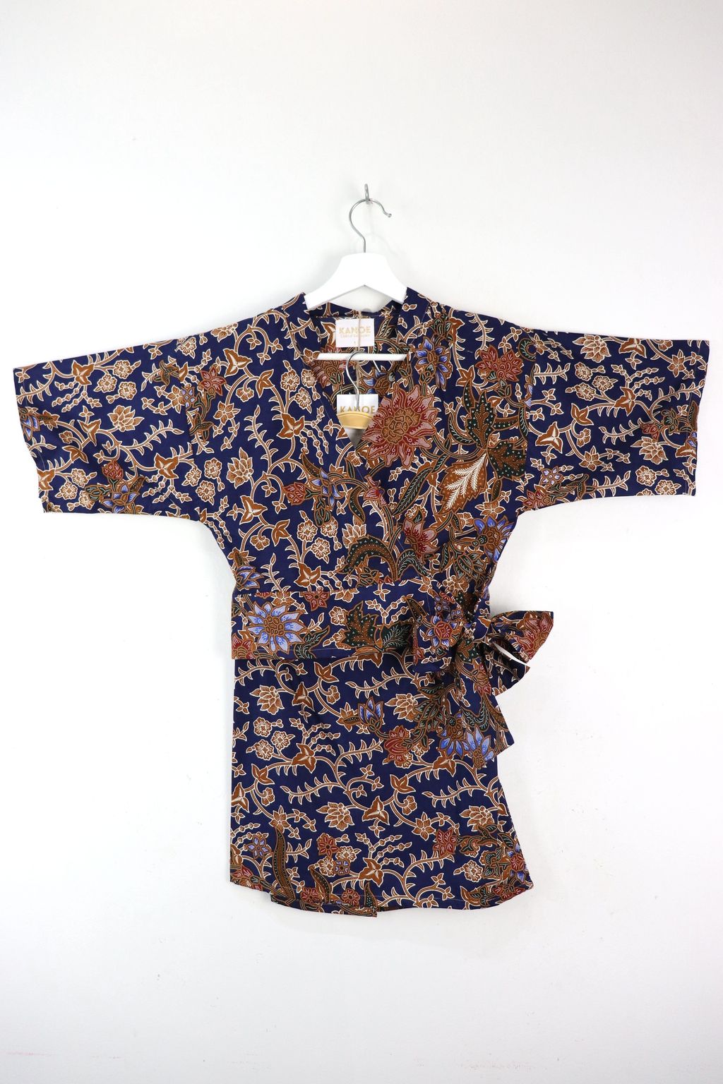100% cotton of a kimono wrap top + a fitted mini skirt with side zip and elastic waist at back.