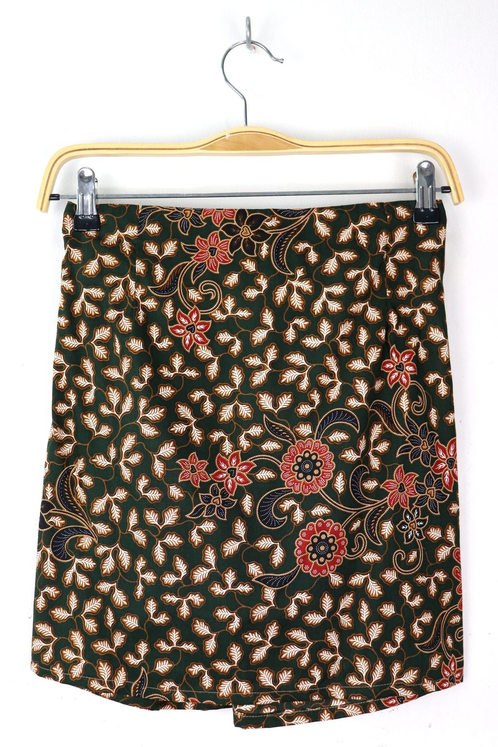 100% cotton of a kimono wrap top + a fitted mini skirt with side zip and elastic waist at back.