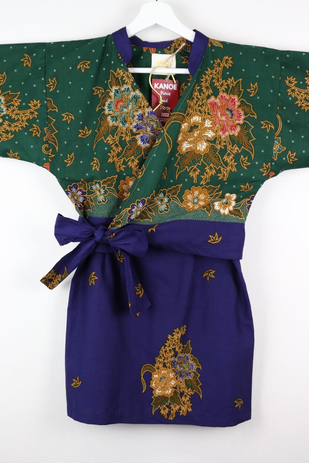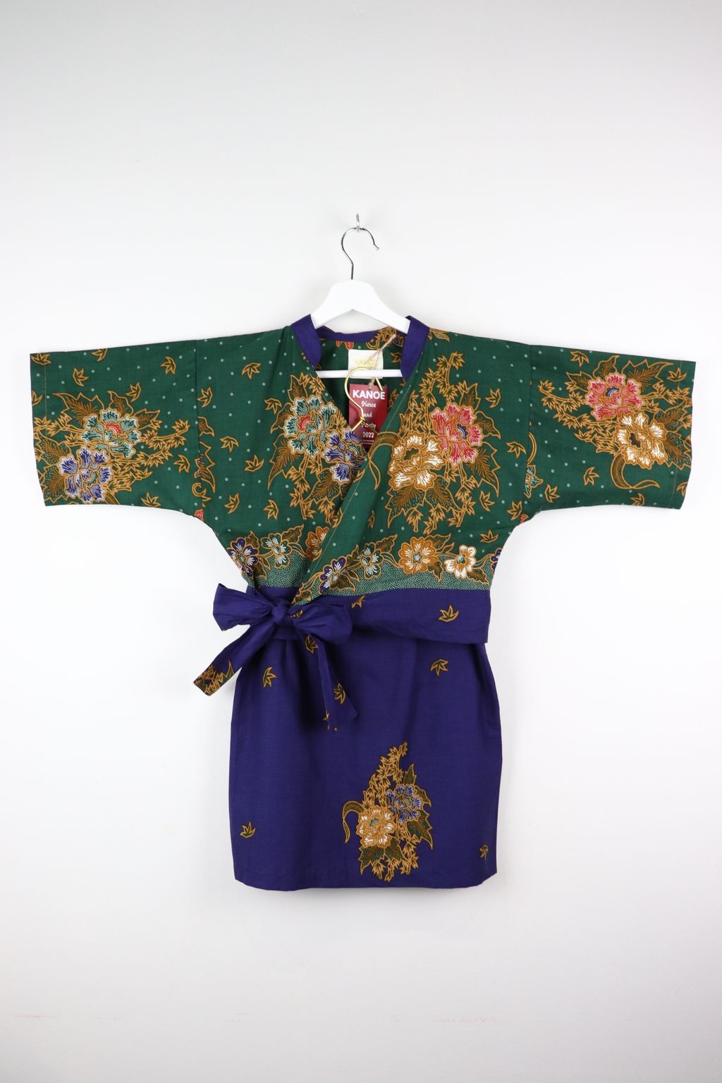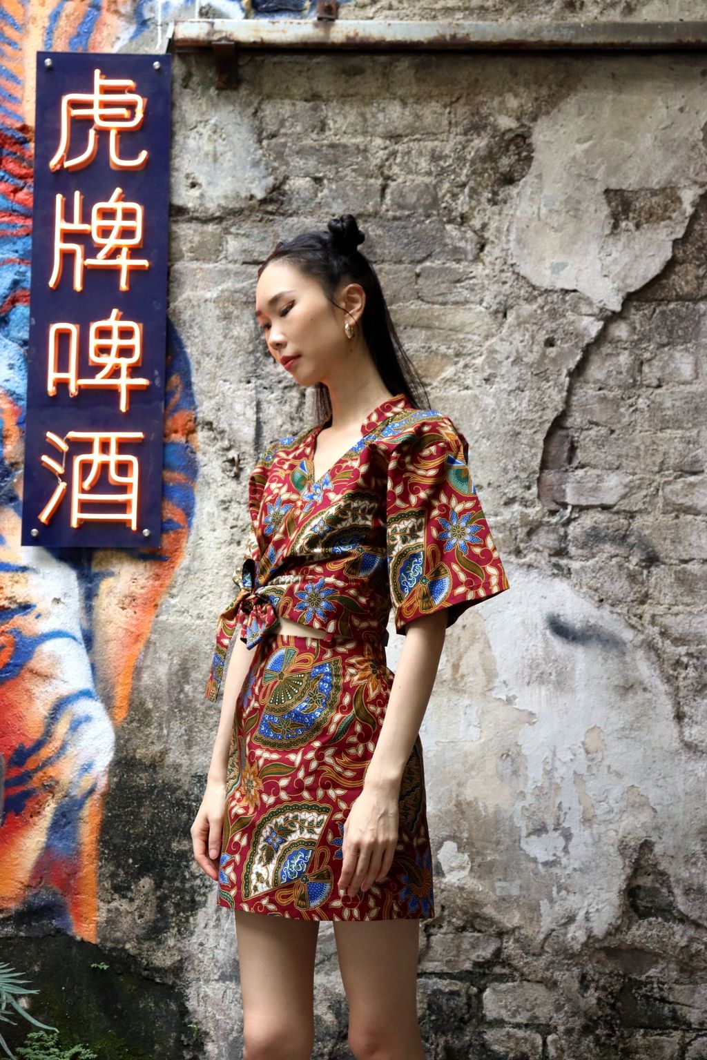 100% cotton of a kimono wrap top + a fitted mini skirt with side zip and elastic waist at back.