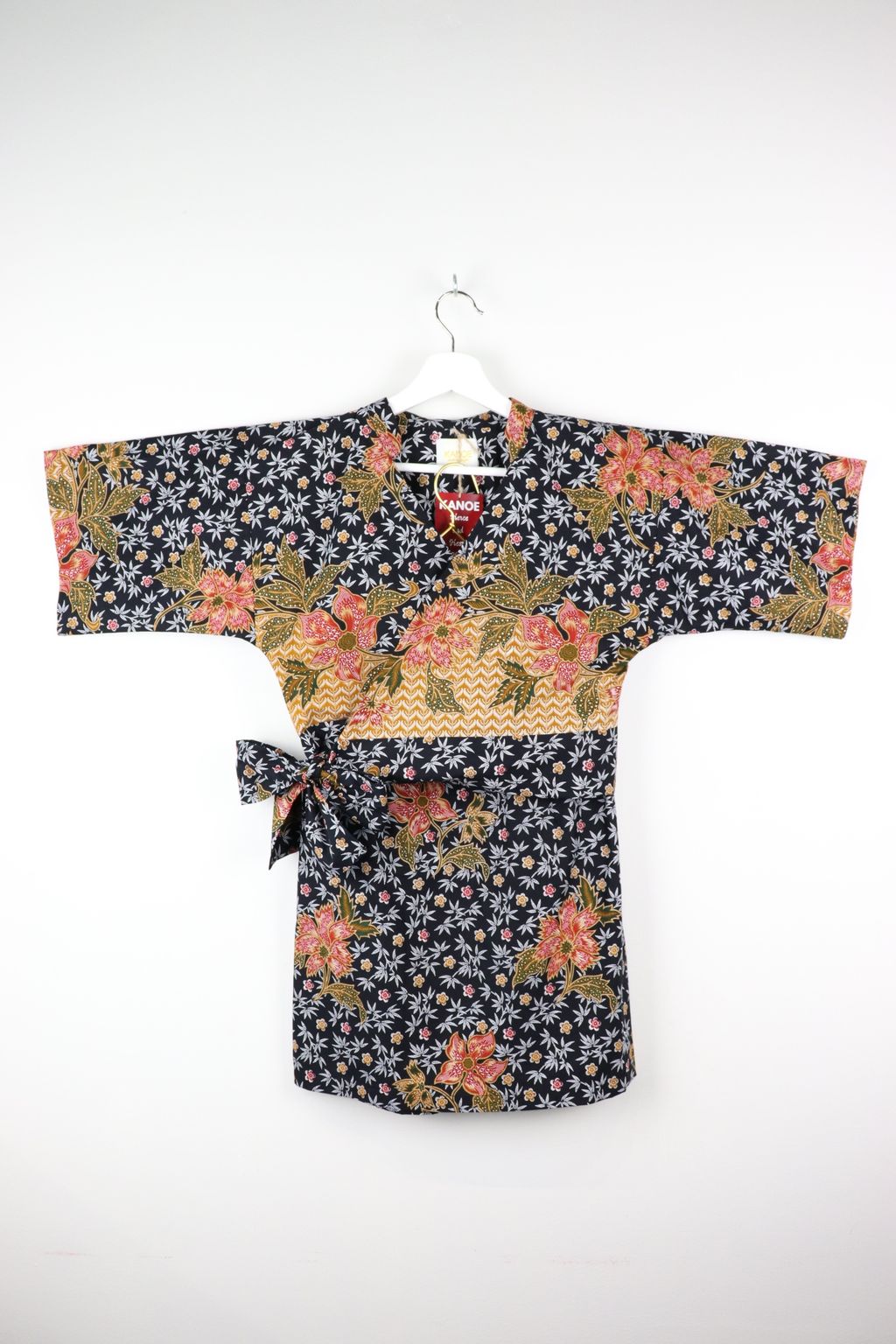 100% cotton of a kimono wrap top + a fitted mini skirt with side zip and elastic waist at back.