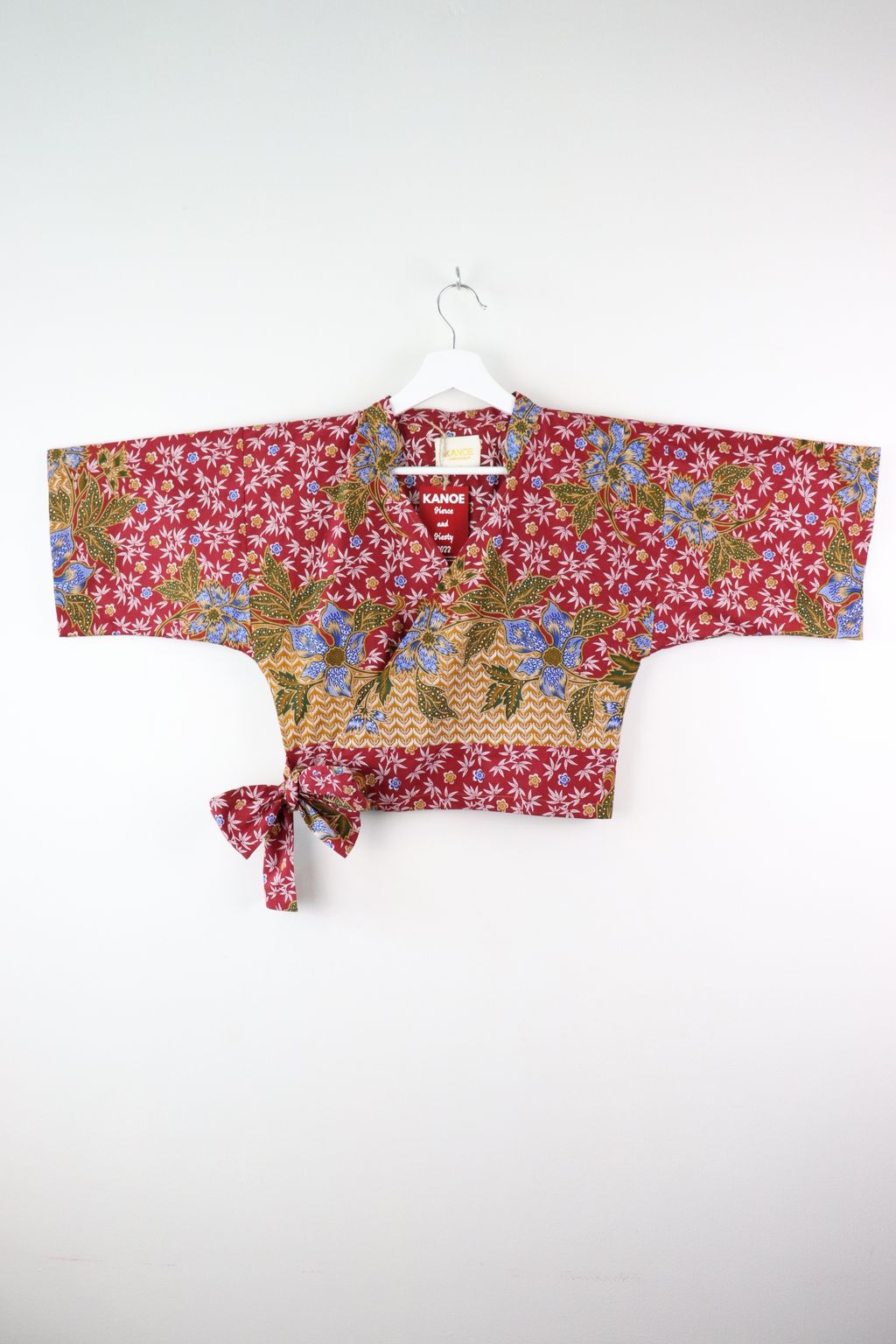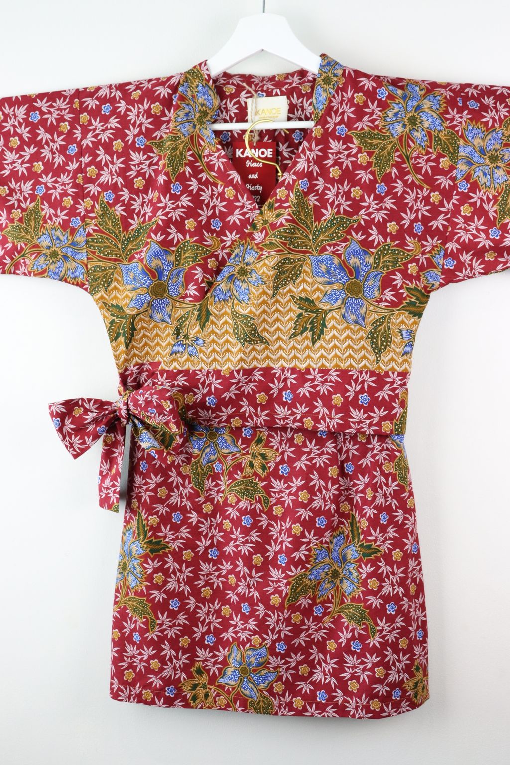 100% cotton of a kimono wrap top + a fitted mini skirt with side zip and elastic waist at back.