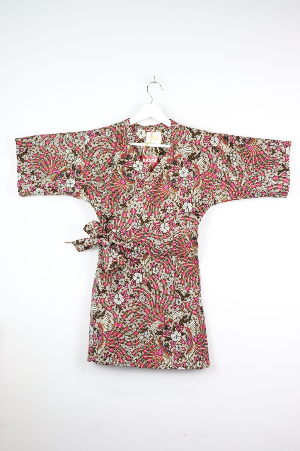 100% cotton of a kimono wrap top + a fitted mini skirt with side zip and elastic waist at back.