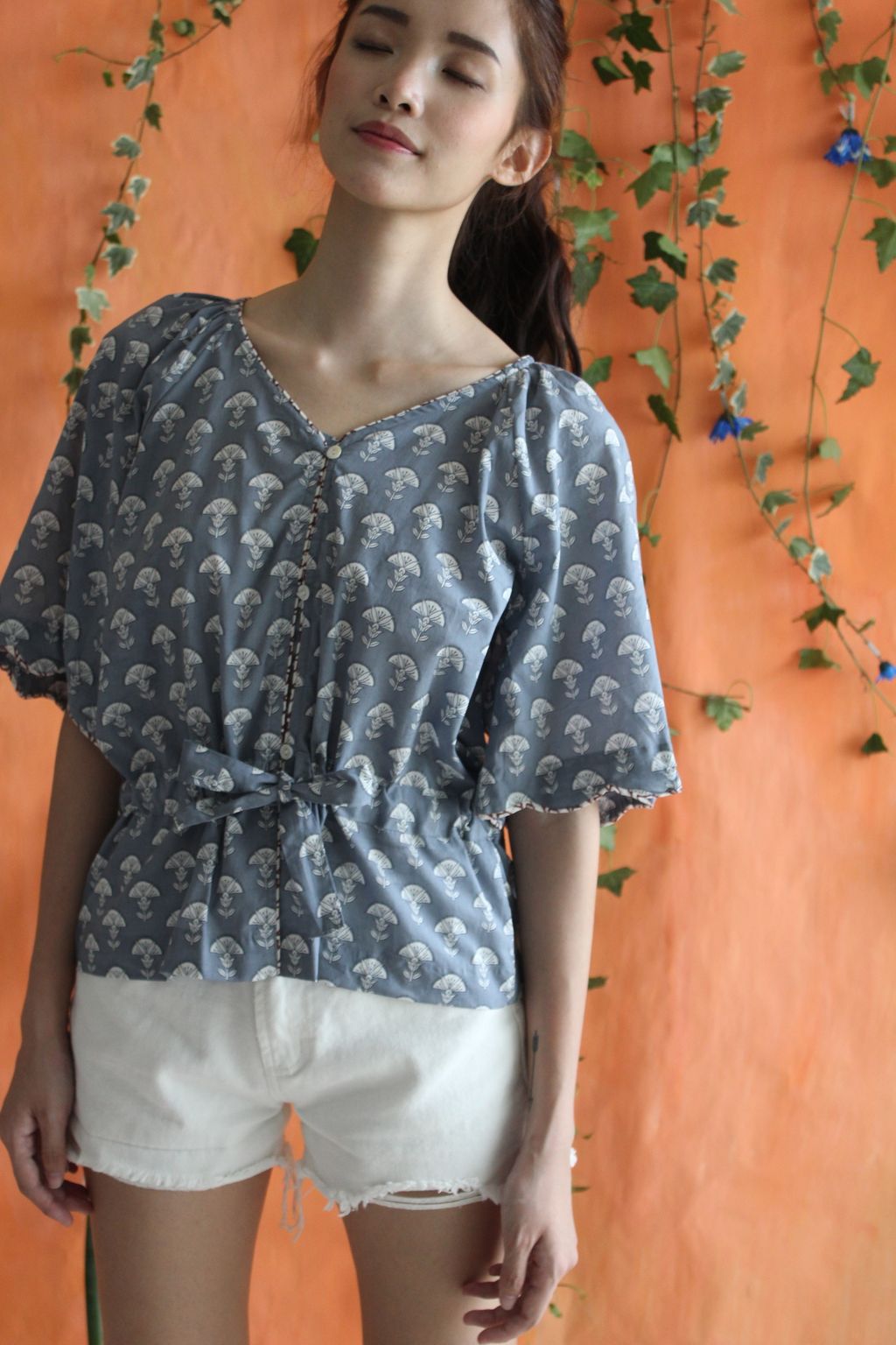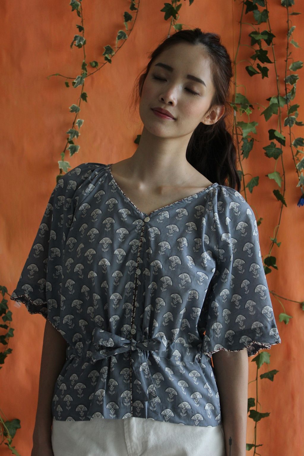 Our maharaja top is feminine with its detailed scallop piping at the edge of the sleeves with adjustable ribbon at the waist.
