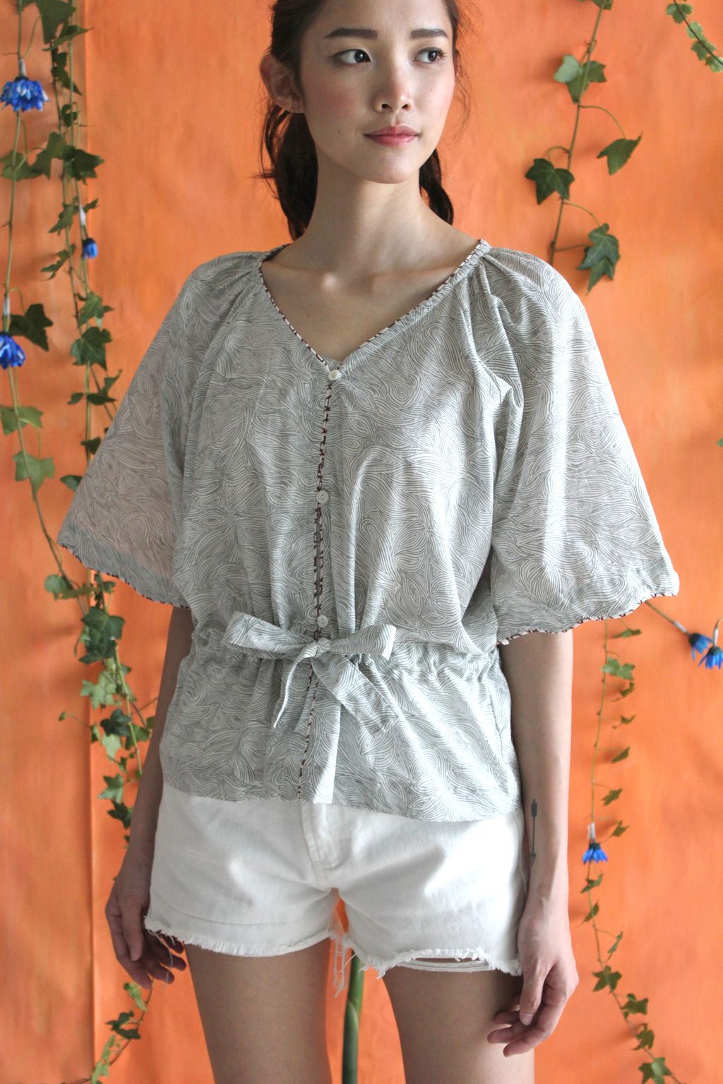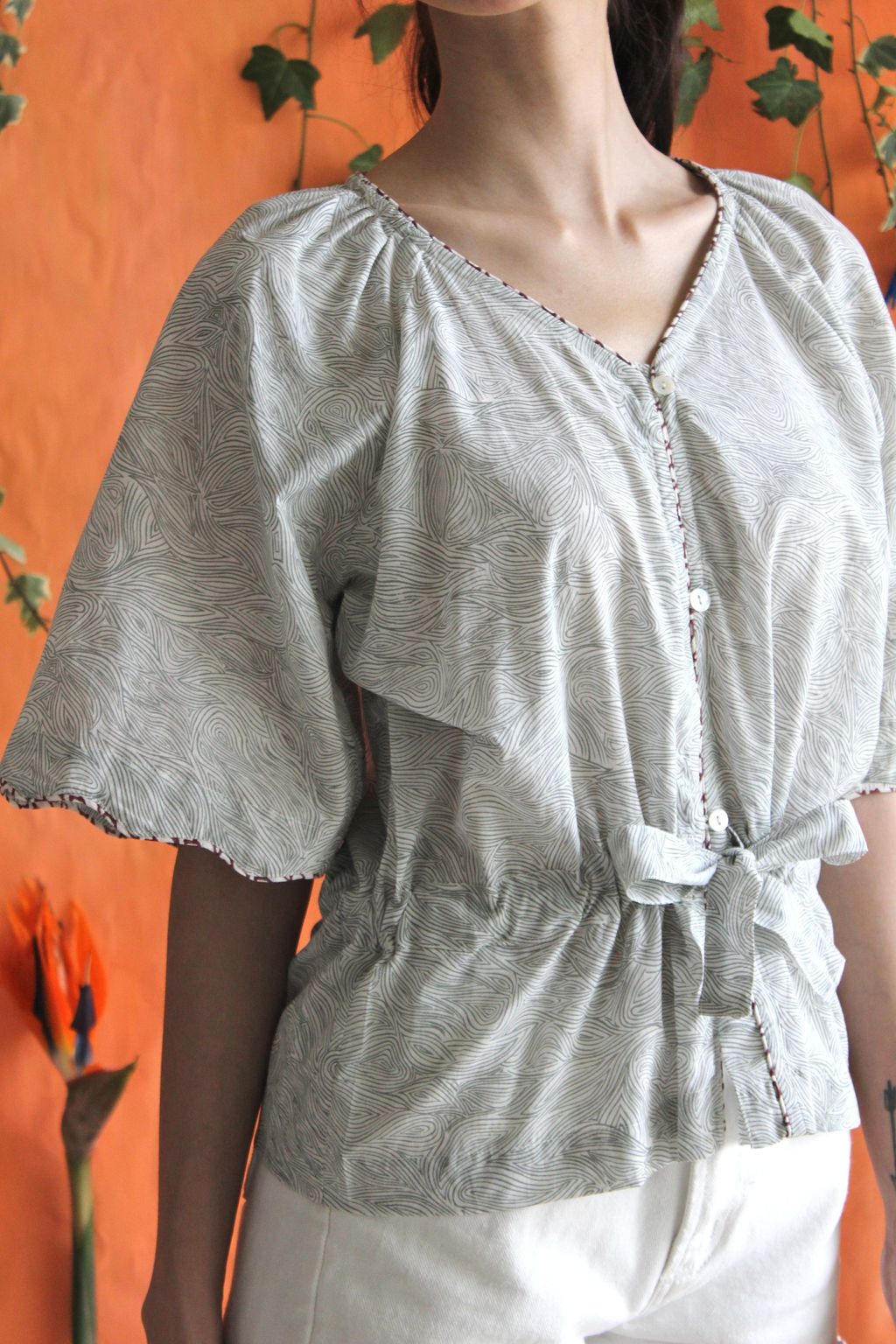 Our maharaja top is feminine with its detailed scallop piping at the edge of the sleeves with adjustable ribbon at the waist.