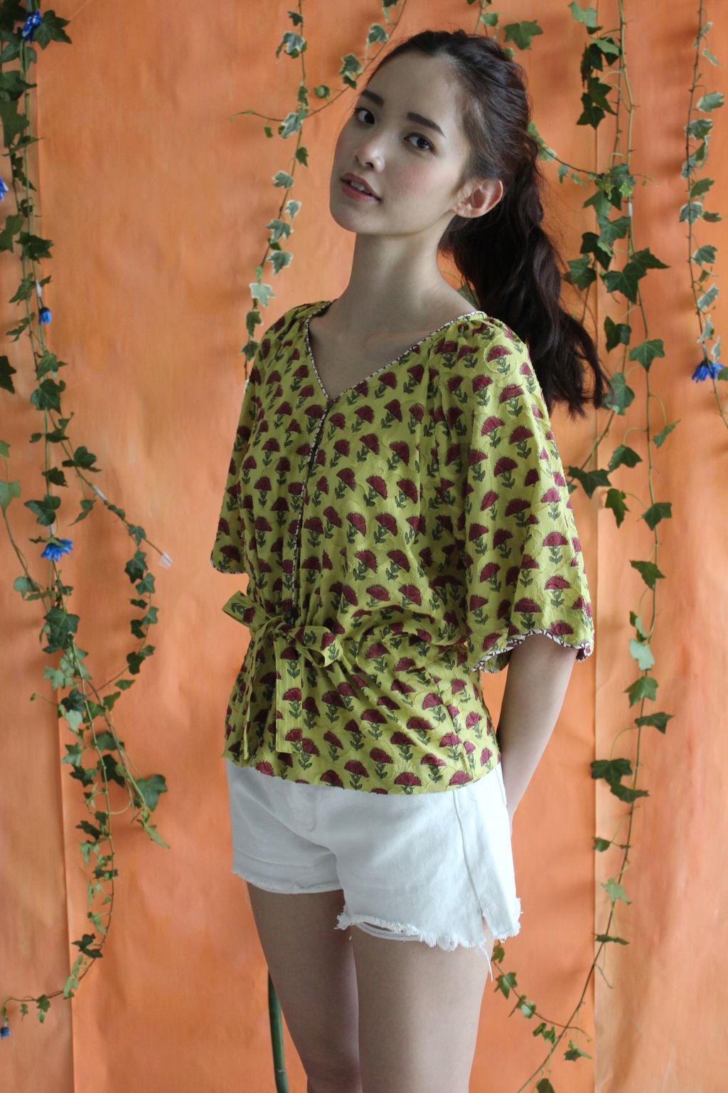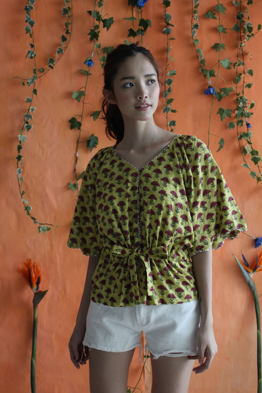 Our maharaja top is feminine with its detailed scallop piping at the edge of the sleeves with adjustable ribbon at the waist.