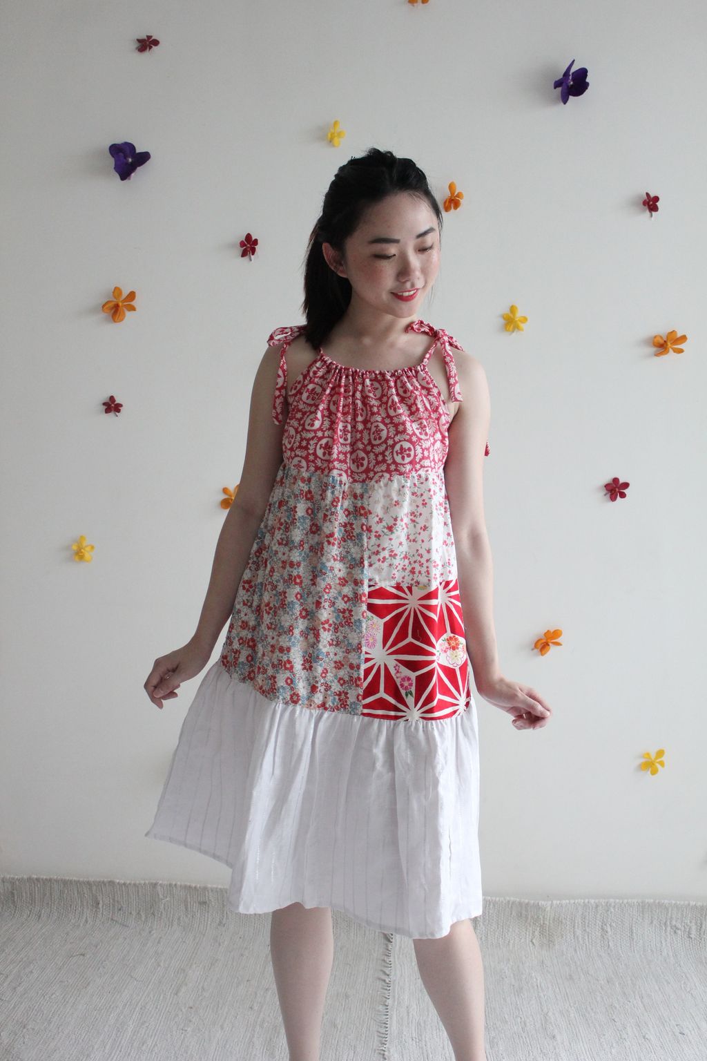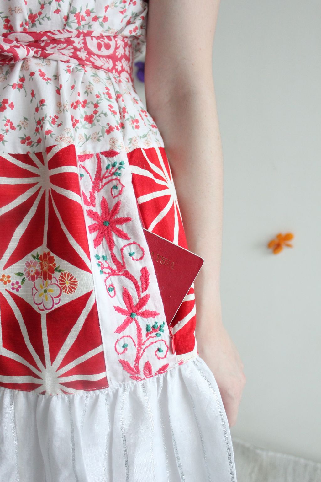 This beautiful dress is made from textiles found during our travel in Japan, India, and Vietnam. A beautiful mix that collectively shines the beauty of our world.