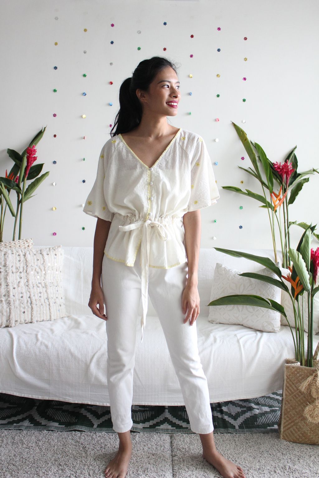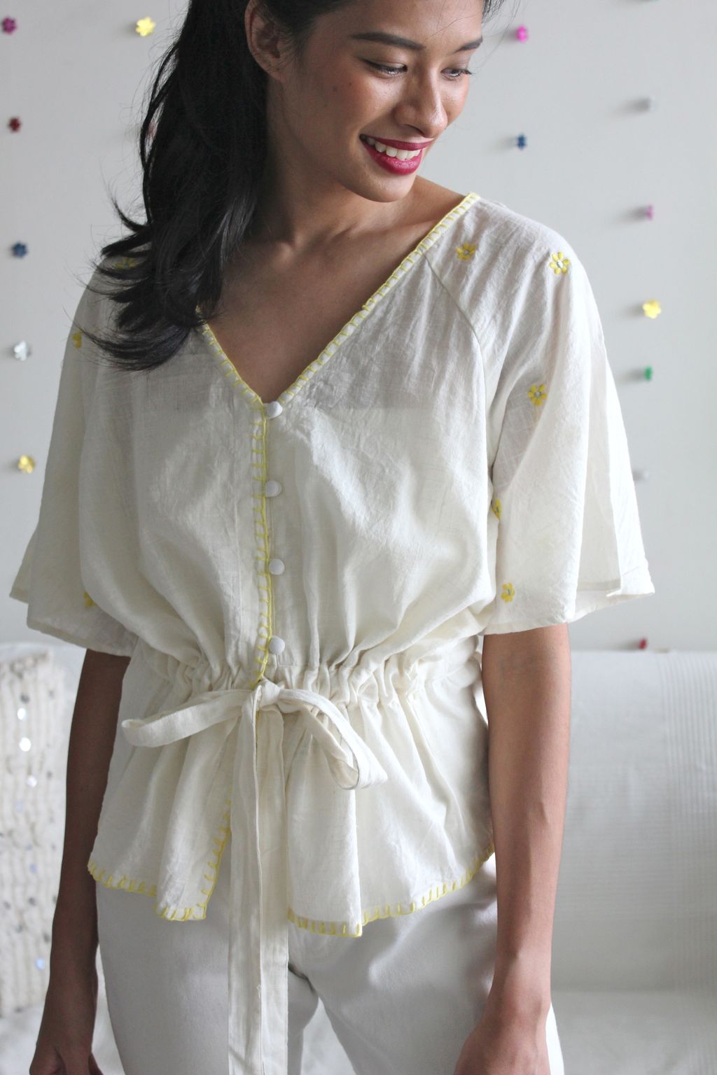 These tops are perfect for your every day. With embroidered flowers on the sleeves and blanket stitch all around the edges. Made of 100% soft cotton. Finish it off with a ribbon to tie at the waist to bring definition to the feminine figure!