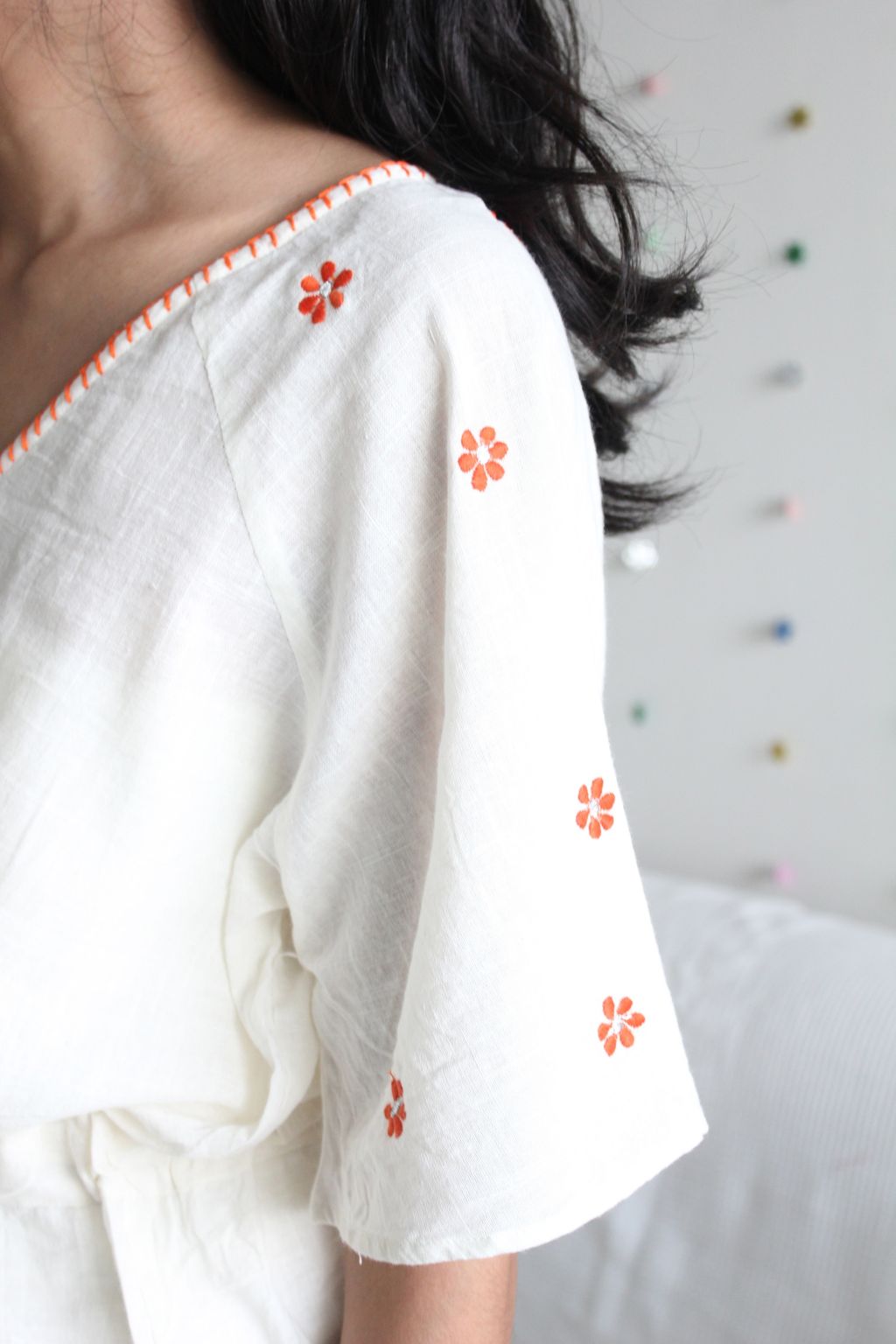 These tops are perfect for your every day. With embroidered flowers on the sleeves and blanket stitch all around the edges. Made of 100% soft cotton. Finish it off with a ribbon to tie at the waist to bring definition to the feminine figure!